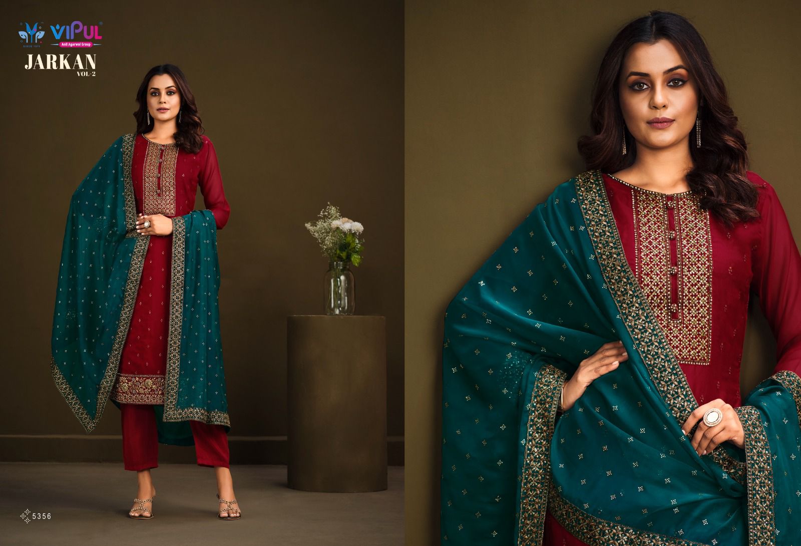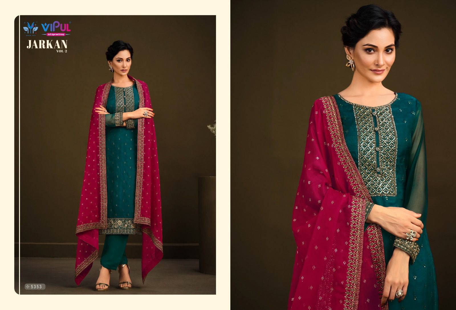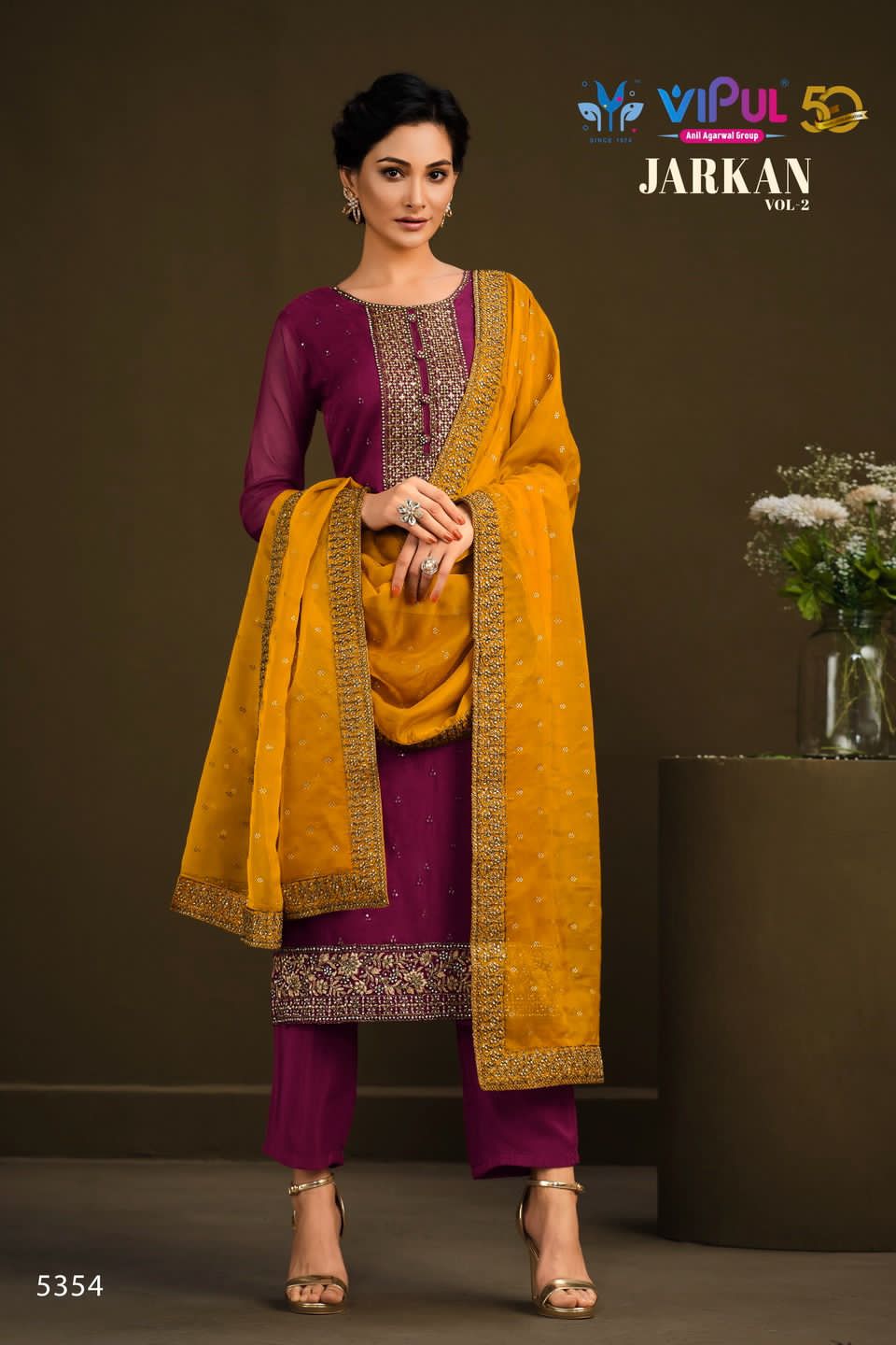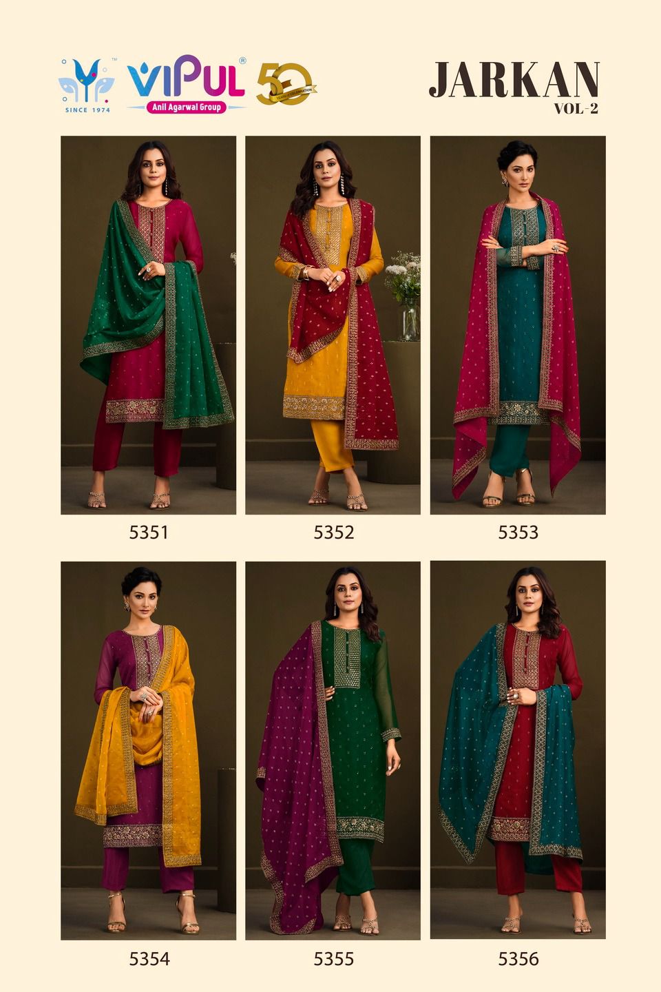 Buy Online Vipul New Jarkan Vol 2 Organza Embroidery Work Designer Suits 6 Pcs of Full Catalogue at Wholesale Price. Looking for Vipul New Jarkan Vol 2 Organza Embroidery Work Designer Suits Full Catalouge at Best Price? Buy Now Vipul New Jarkan Vol 2 Organza Embroidery Work Designer Suits at Wholesale Rate of Rs 13830 with Total 6 Pcs from authroized dealer and supplier of VIPUL Brand. Cost of Each piece is just only Rs 2305 which is very low and affordable price to resale the product in your retail store ,This is Surat based Wholesale Supplier & Dealer of VIPUL Brand. Click on Brand name to Know more about VIPUL Brand's products.Call or Whatsapp on 9898838984 for booking or enquiry