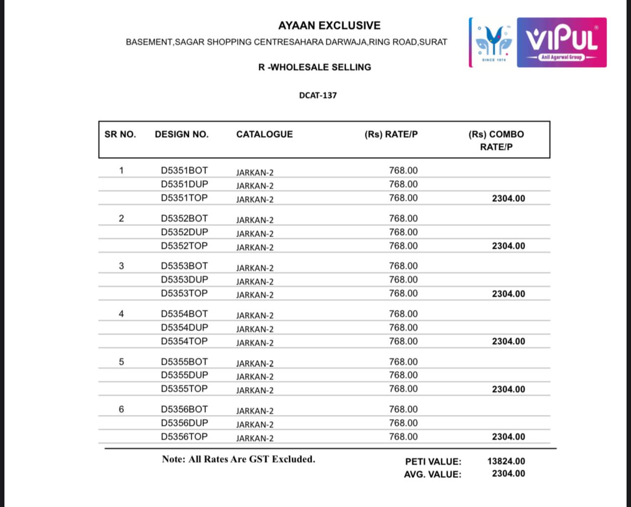 VIPUL DCAT 137 CATLOGUE NAME :- JARKAN 2 2305+5% GST SINGLE AVAILABLE 100+Singles |