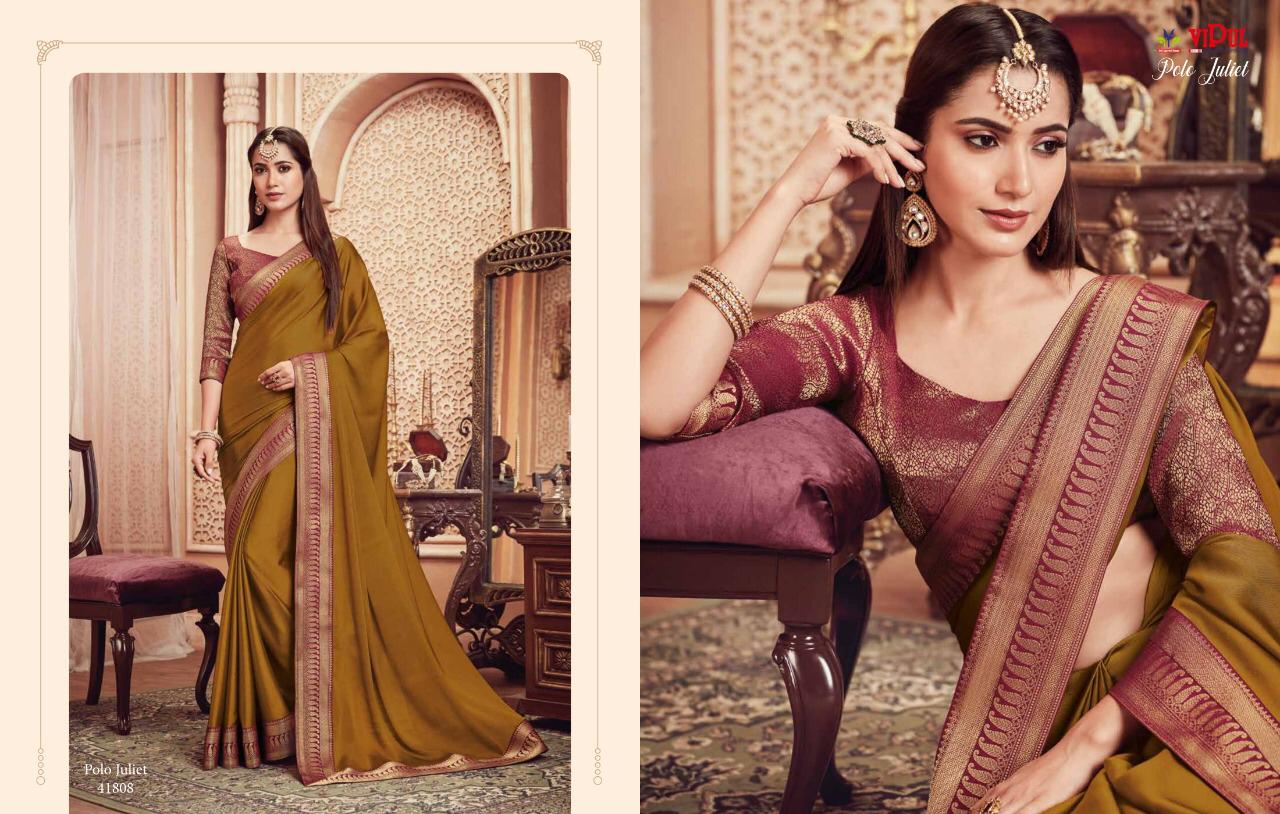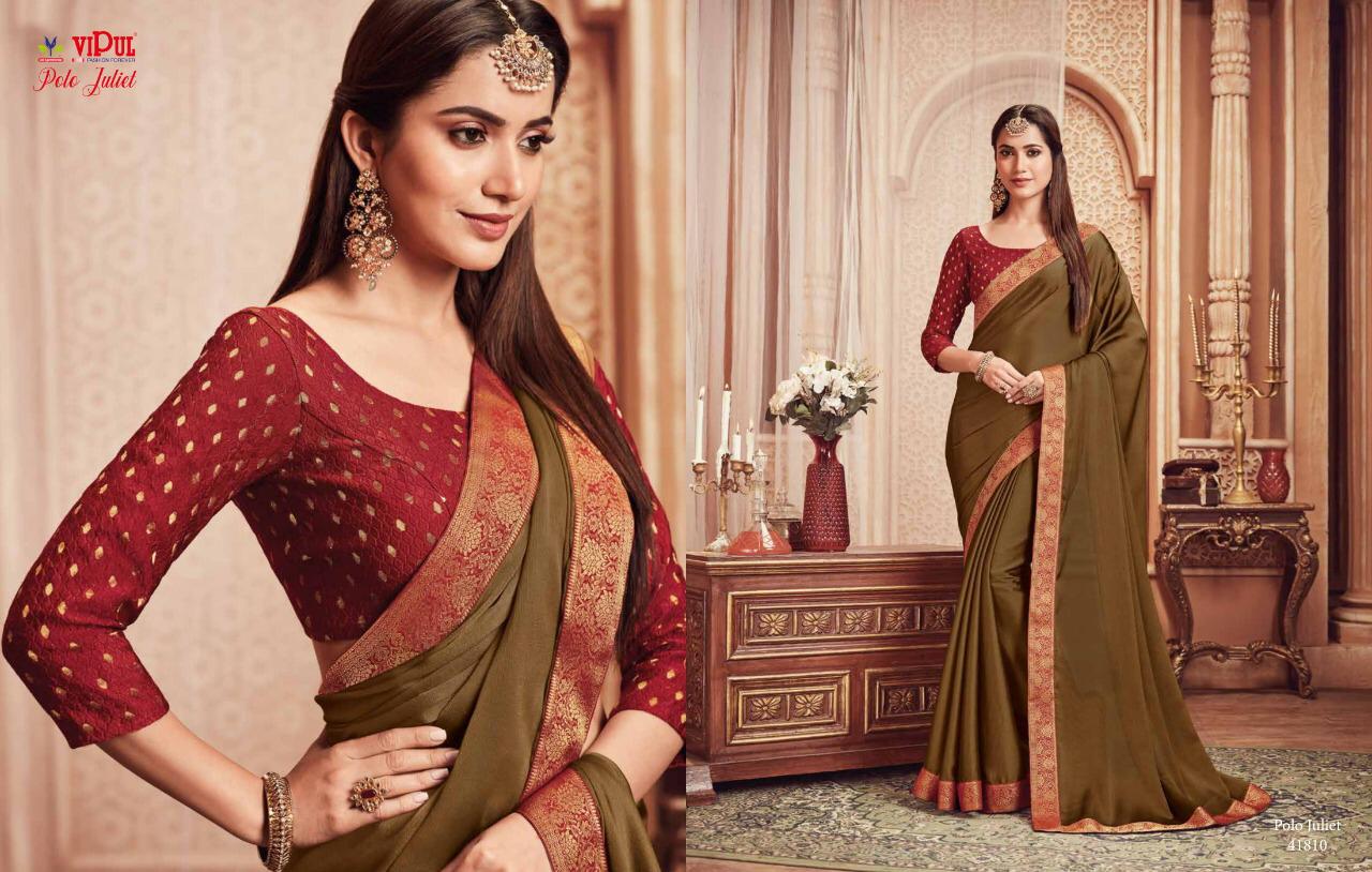 Brand - Vipul . Type - saeee. Catlog name - POLO JULIET(cat-418) Series - 41805 to 41813. Fabric- P chiffon . Set & loose & Singel . Single extra 100 CAT - 418 POLO JULIET GORGEOUS STYLE , KESSI BRINGS TO YOU ELEGANT & UNIQUE EFFORTLESS STYLE WITH BANARSI BORDER WITH BANARSI BLOUSE. THE TRENDS OF THE SEASON. |