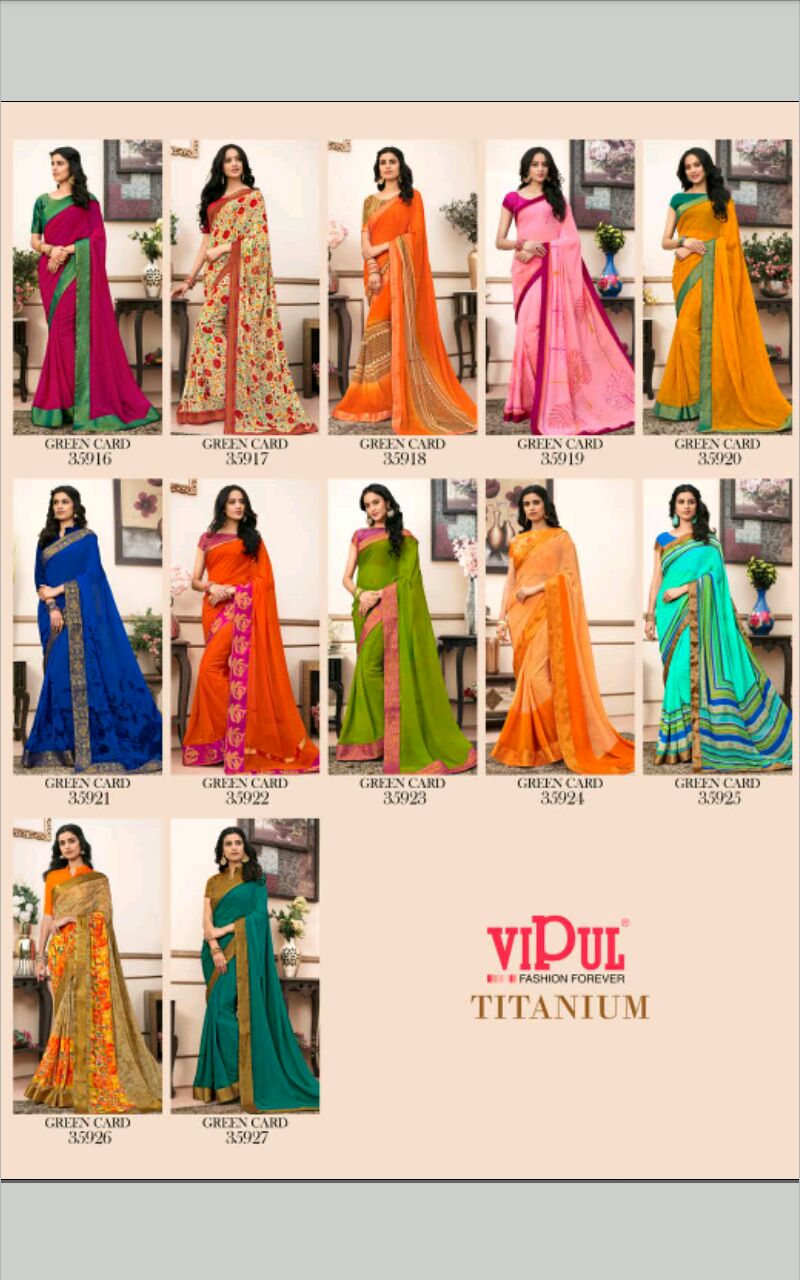 We are launching our new Saree Catalog Brand-Vipul Catalog- Titanium Series -35901 to 35927. Set to set . Total 27 saree in one set. GST 5 Percent Extra. Book your order |