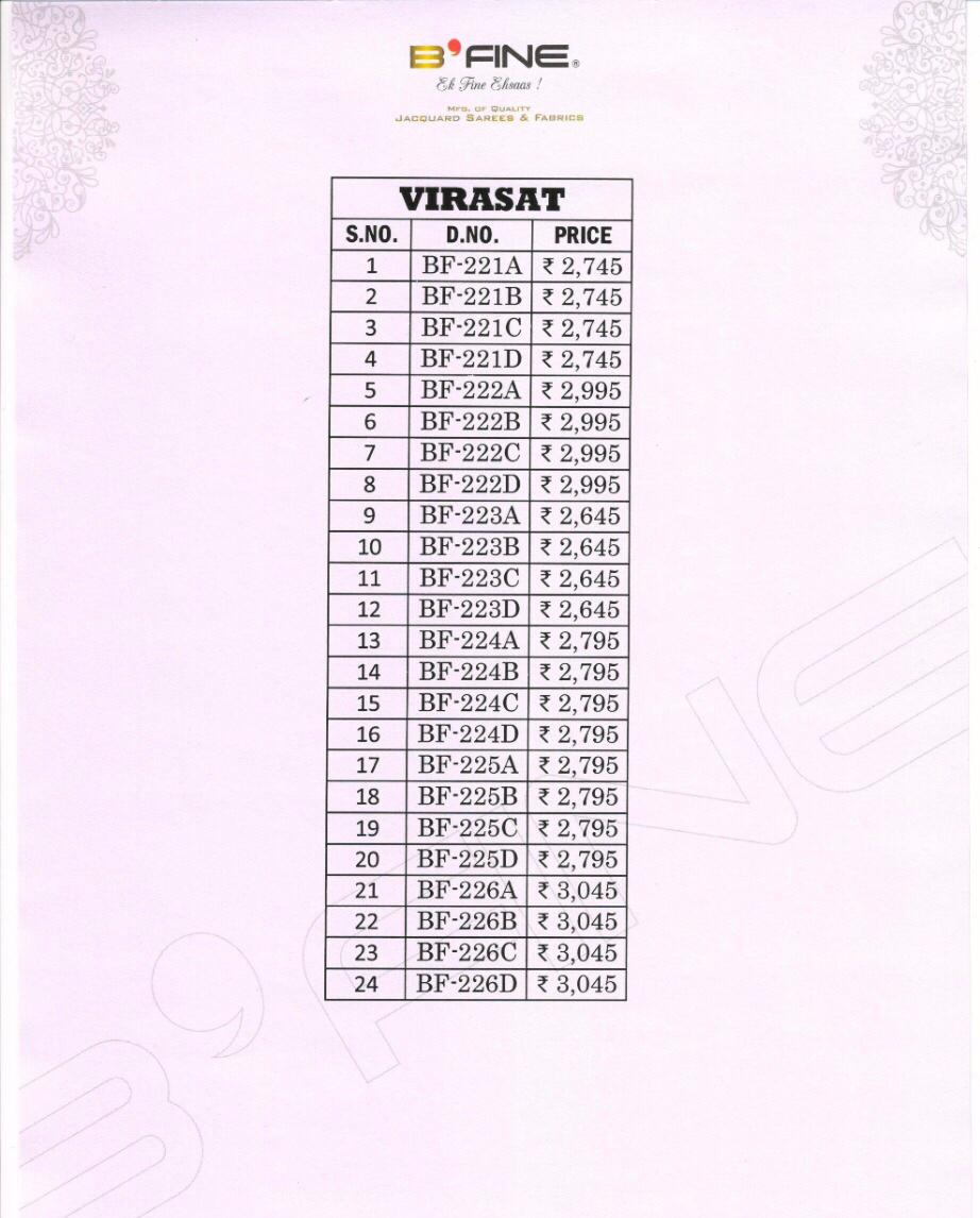 Buy Online Virasat By B Fine Series 221a Silk Sarees Set And Single Wholesale Supplier Gujarat 0 Pcs of Full Catalogue at Wholesale Price. Looking for Virasat By B Fine Series 221a Silk Sarees Set And Single Wholesale Supplier Gujarat Full Catalouge at Best Price? Buy Now Virasat By B Fine Series 221a Silk Sarees Set And Single Wholesale Supplier Gujarat at Wholesale Rate of Rs 0 with Total 0 Pcs from authroized dealer and supplier of BRAND'S Brand. Cost of Each piece is just only Rs 0 which is very low and affordable price to resale the product in your retail store ,This is Surat based Wholesale Supplier & Dealer of BRAND'S Brand. Click on Brand name to Know more about BRAND'S Brand's products.Call or Whatsapp on 9898838984 for booking or enquiry