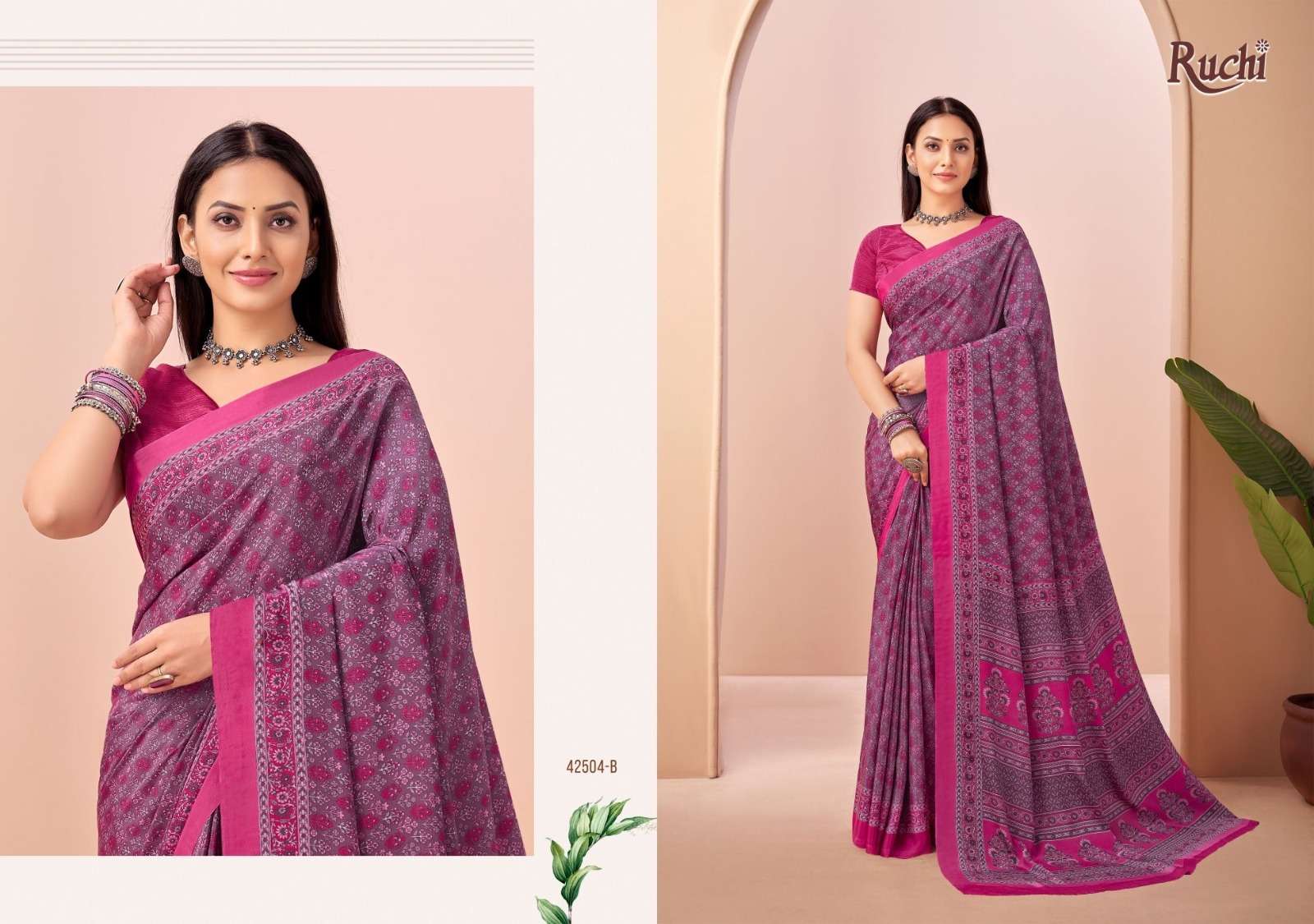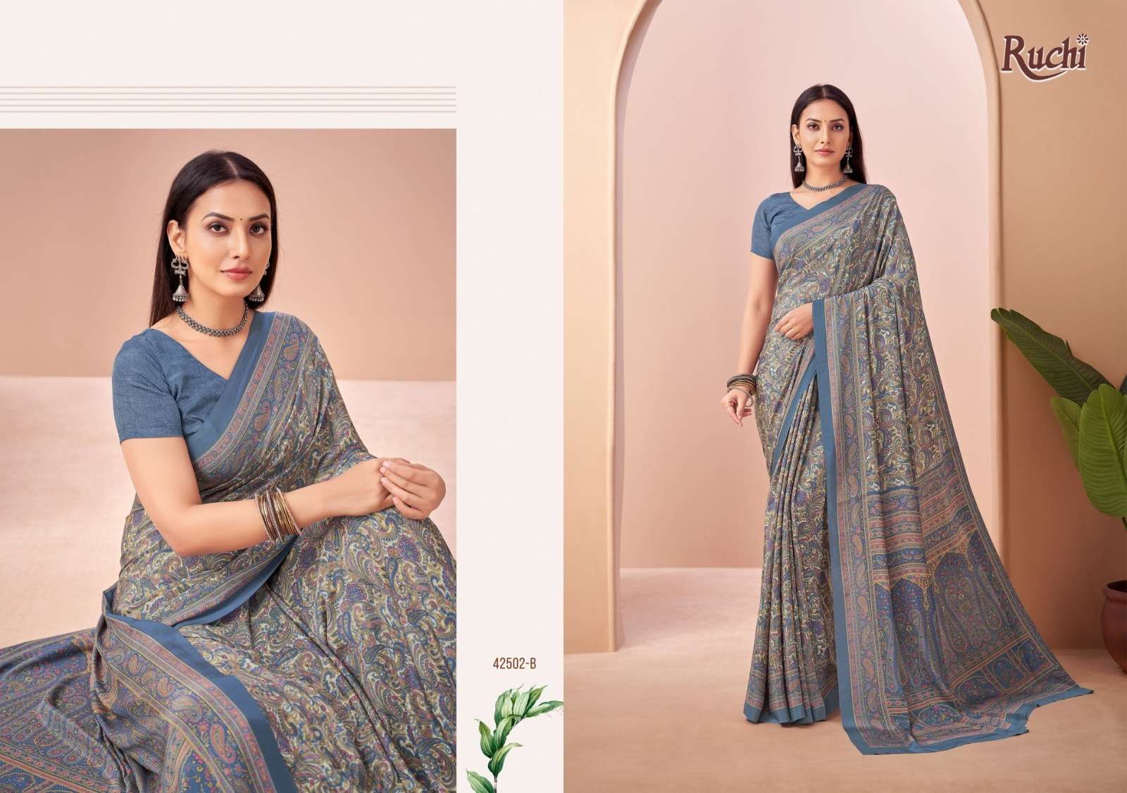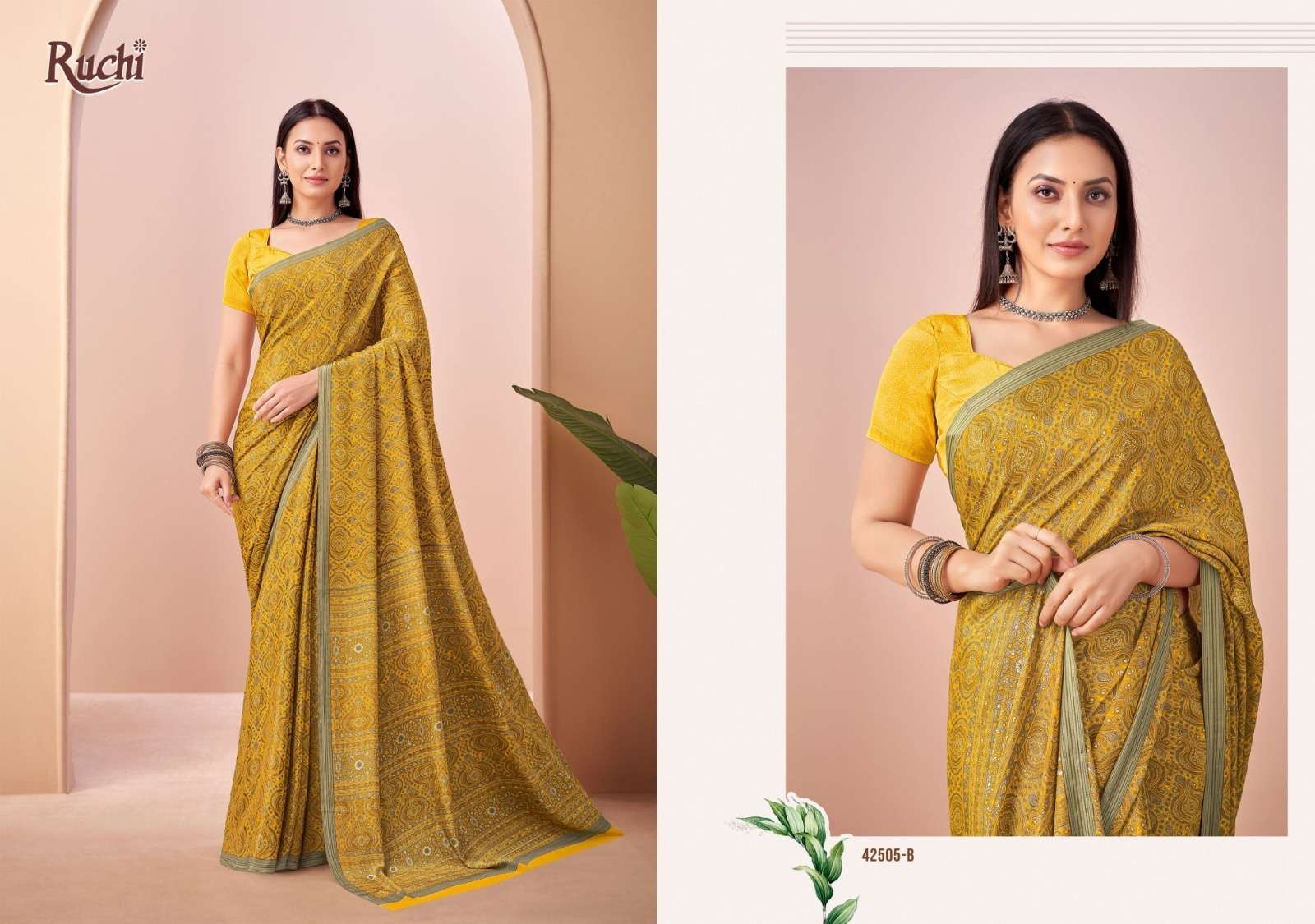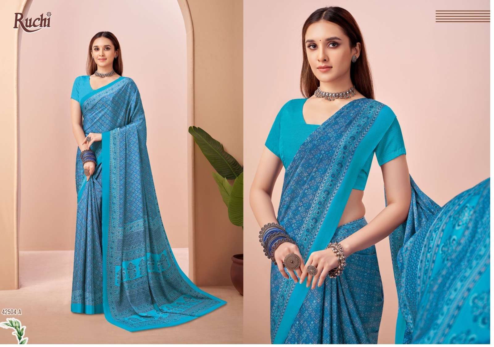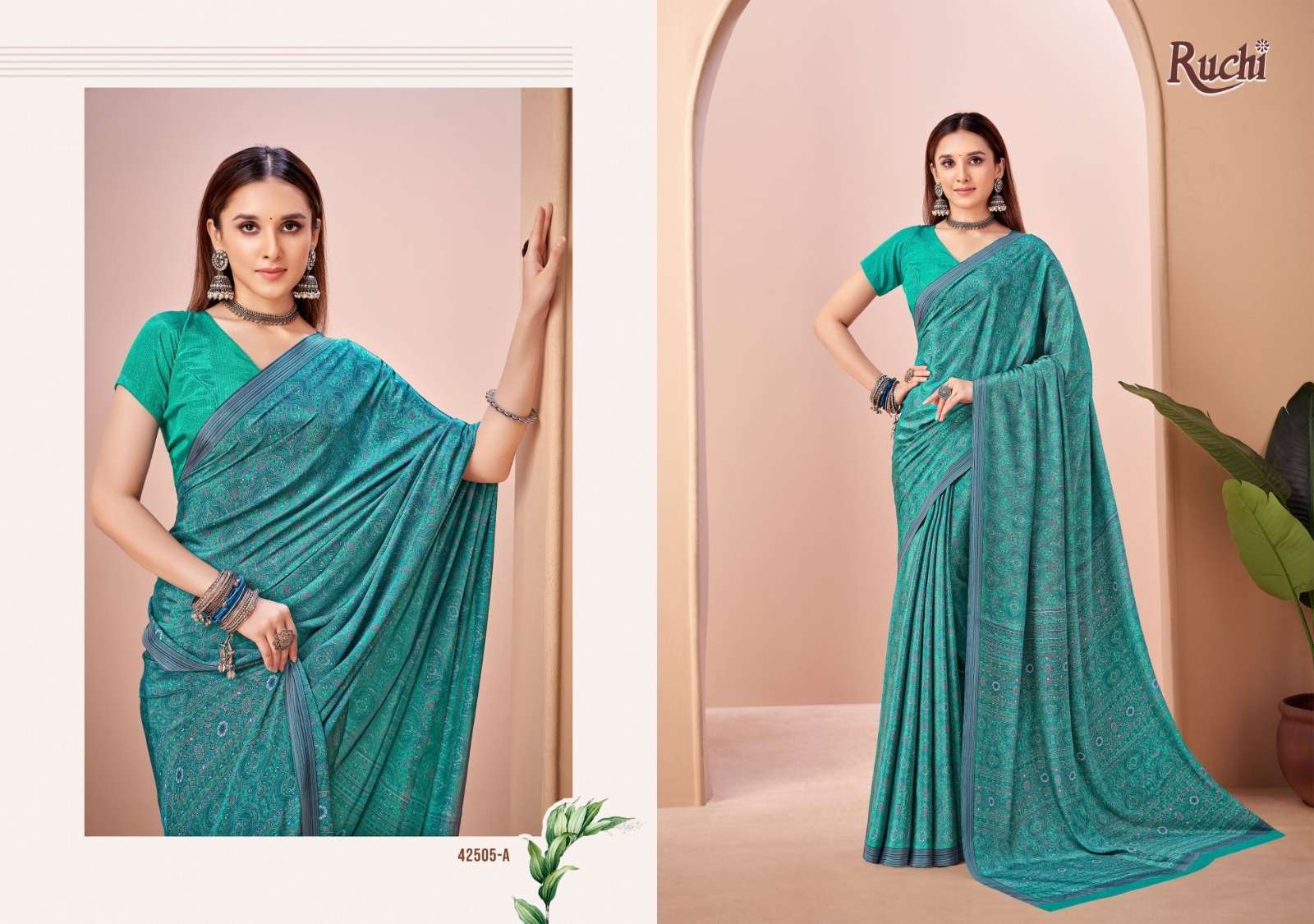 BRAND NAME – RUCHI CATALOG NAME – VIVANTA SILK VOL-45 SERIES – 42501A TO 42505B D. NO. 42501B NOT AVAILABLE Fabric - Silk Crepe. RATE. 606/- PER PCS GST EXTRA SINGLE AVAILABLE BOOK YOUR ORDER NOW |