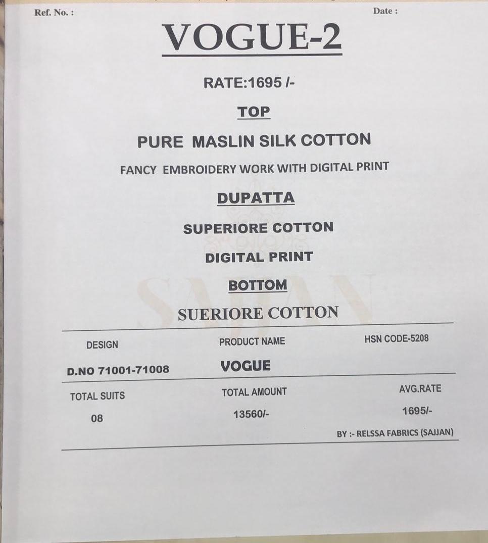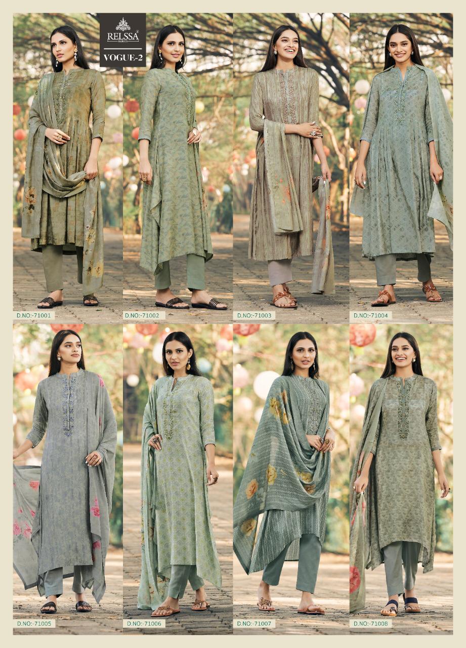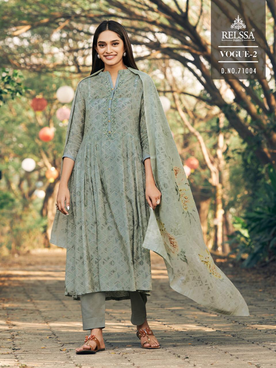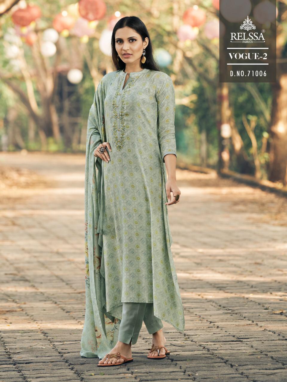 Buy Online Vogue 2 By Relssa Dealer And Exporter Surat Gujarat 8 Pcs of Full Catalogue at Wholesale Price. Looking for Vogue 2 By Relssa Dealer And Exporter Surat Gujarat Full Catalouge at Best Price? Buy Now Vogue 2 By Relssa Dealer And Exporter Surat Gujarat at Wholesale Rate of Rs 13560 with Total 8 Pcs from authroized dealer and supplier of Brand. Cost of Each piece is just only Rs 1695 which is very low and affordable price to resale the product in your retail store ,This is Surat based Wholesale Supplier & Dealer of Brand. Click on Brand name to Know more about Brand's products.Call or Whatsapp on 9898838984 for booking or enquiry