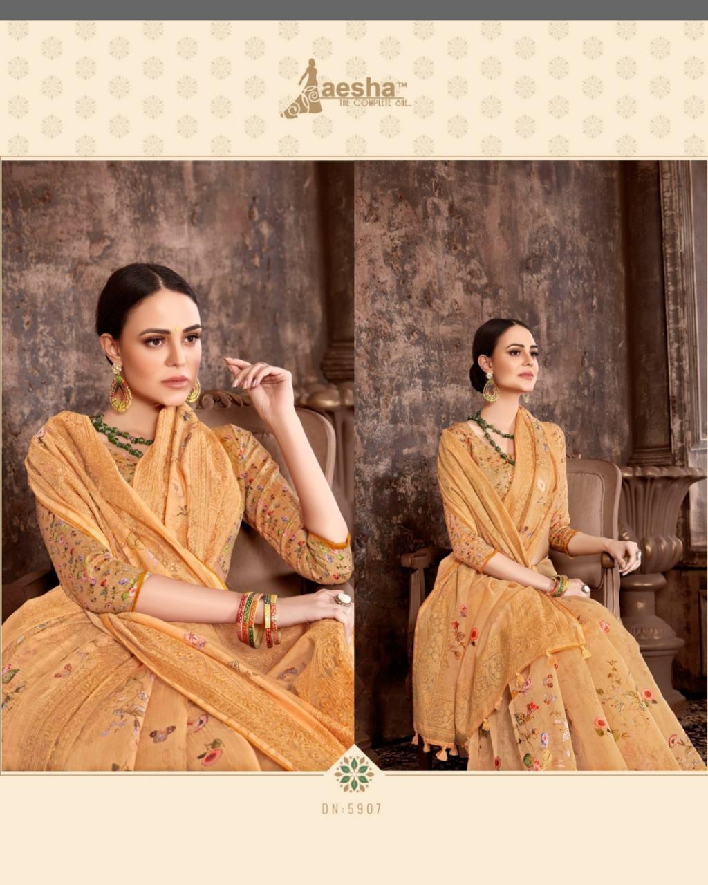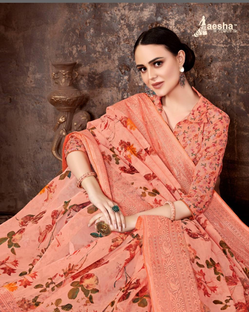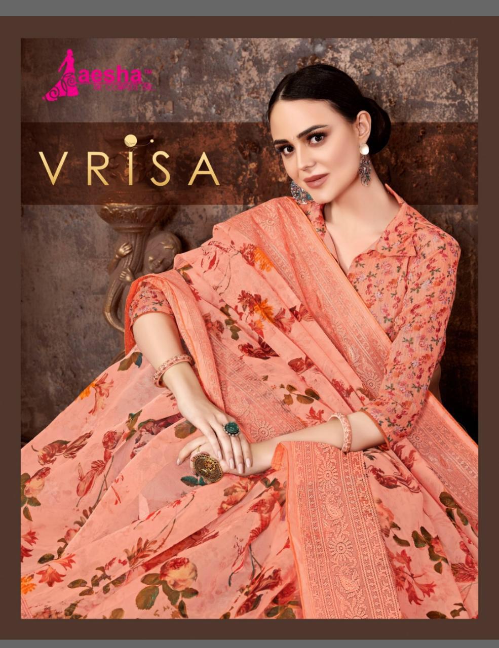 Brand - Aayesha. Type - Saree. New catlouge VRISA orgenja digital with exclusive embodary work O8 pc. Catlouge Aesha deginer Rate 1595/- Set to set. GST 5 Percent Extra. Delivery from tomorrow |