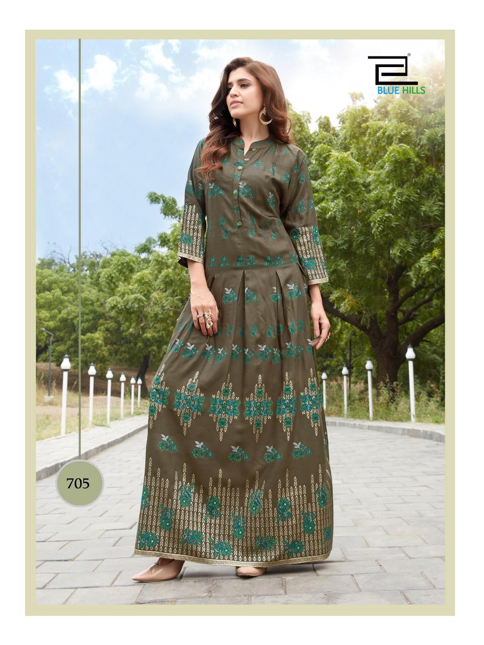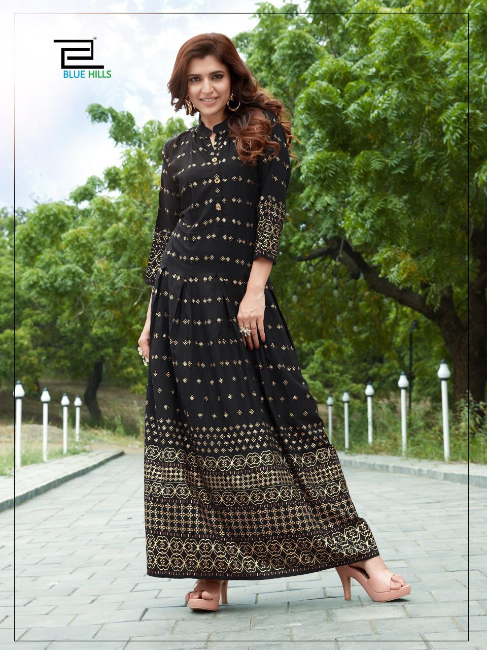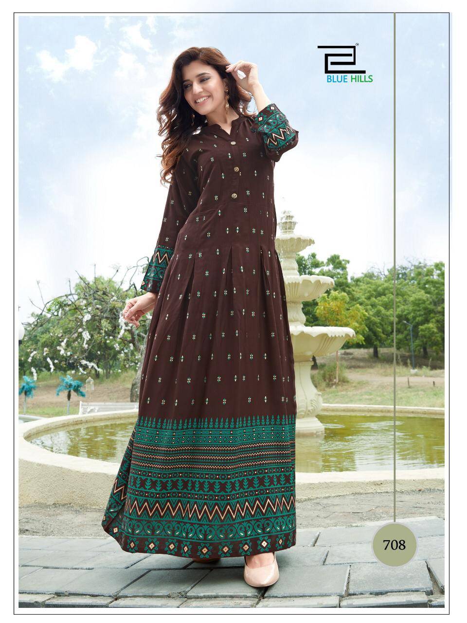 New Catlog by *BLUE HILLS* Catalogue name - *WALKWAY VOL 7* Fabric : 14KG REYON Concept:-Long Gown with Foil Print Length:- 52+" Size :M,L,XL,XXL,3XL,4XL,5XL 10 PCS CATLOG Set to set . Rate- 545+GST Dispatch 3-4 days |