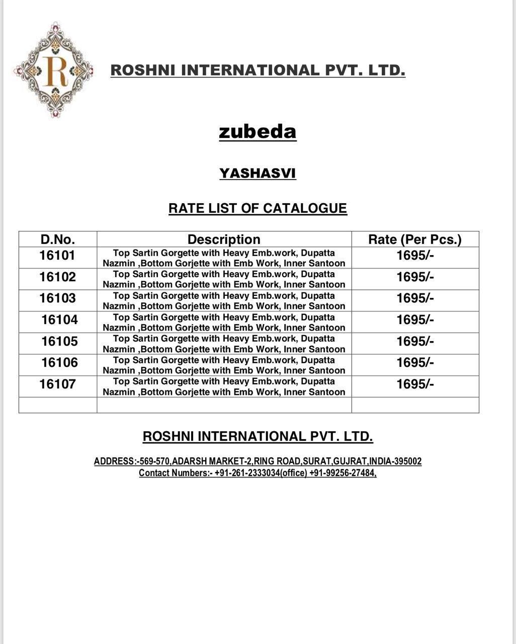 Buy Online Yashasvi By Zubeda Series 16101 To 16107 Georgette Embroidered Designer Party Wear Suits Wholesale Supplier Nd Dealer Gujarat 7 Pcs of Full Catalogue at Wholesale Price. Looking for Yashasvi By Zubeda Series 16101 To 16107 Georgette Embroidered Designer Party Wear Suits Wholesale Supplier Nd Dealer Gujarat Full Catalouge at Best Price? Buy Now Yashasvi By Zubeda Series 16101 To 16107 Georgette Embroidered Designer Party Wear Suits Wholesale Supplier Nd Dealer Gujarat at Wholesale Rate of Rs 11865 with Total 7 Pcs from authroized dealer and supplier of ZUBEDA Brand. Cost of Each piece is just only Rs 1695 which is very low and affordable price to resale the product in your retail store ,This is Surat based Wholesale Supplier & Dealer of ZUBEDA Brand. Click on Brand name to Know more about ZUBEDA Brand's products.Call or Whatsapp on 9898838984 for booking or enquiry
