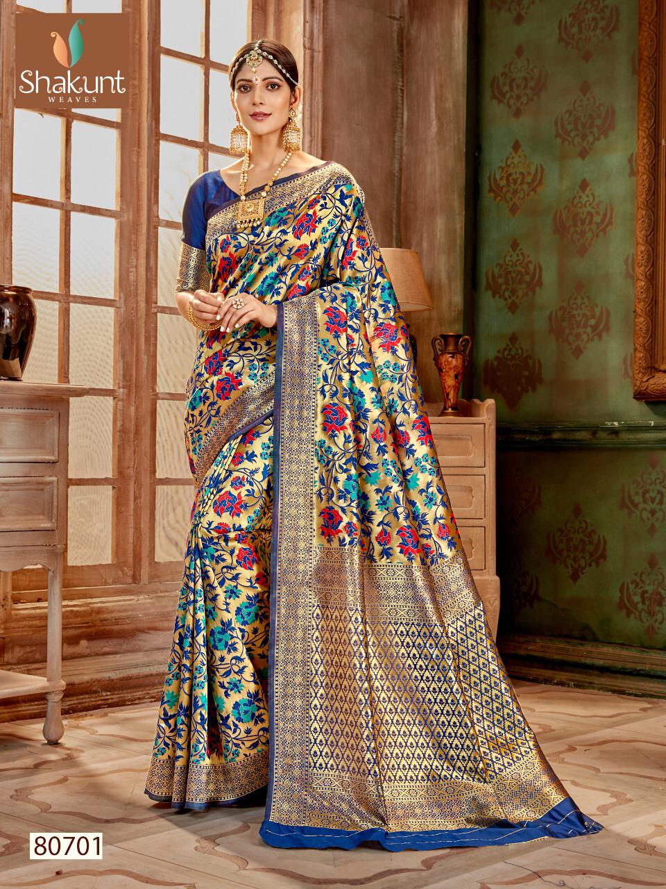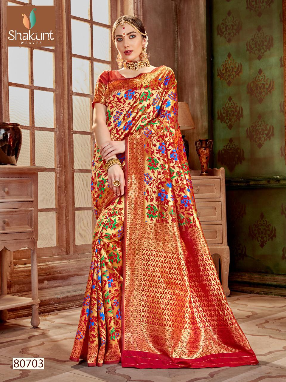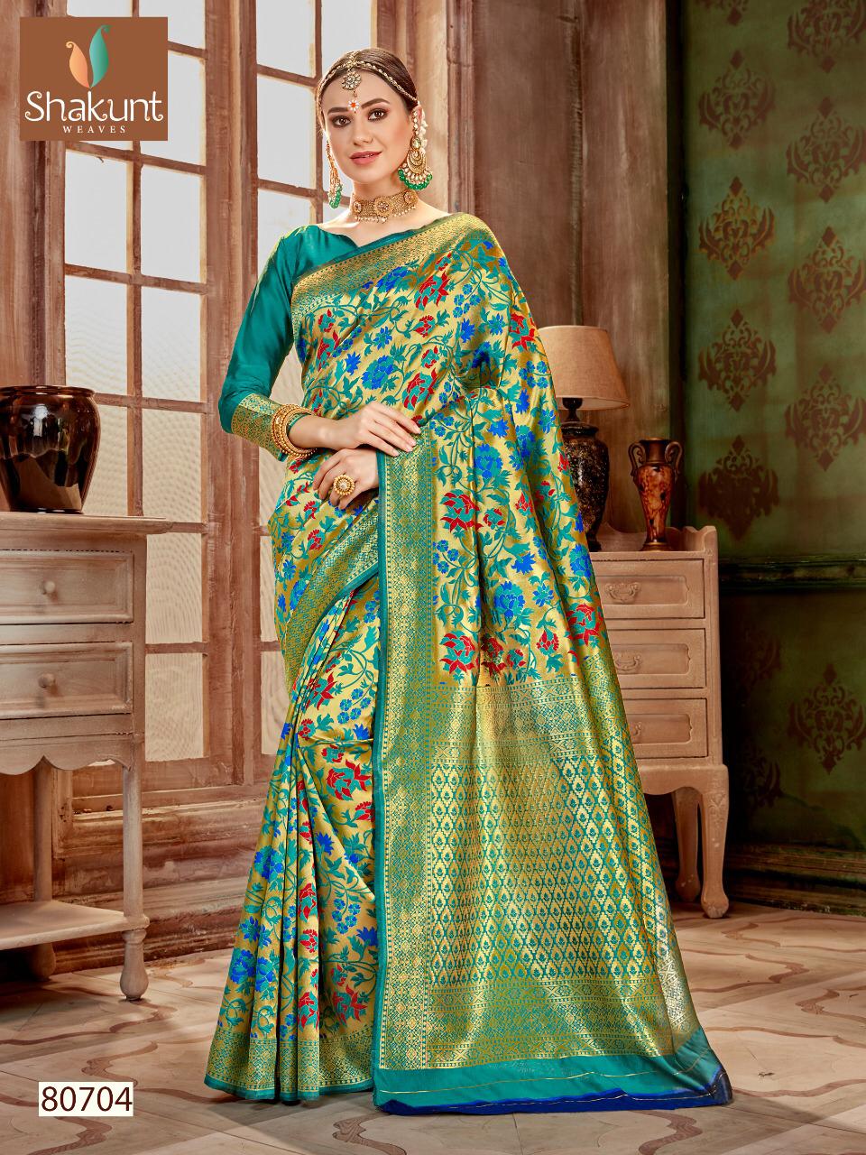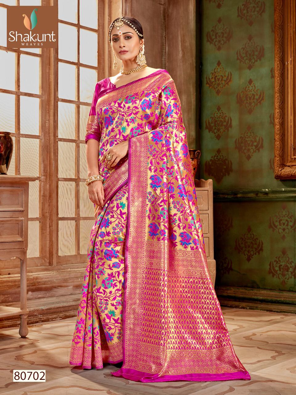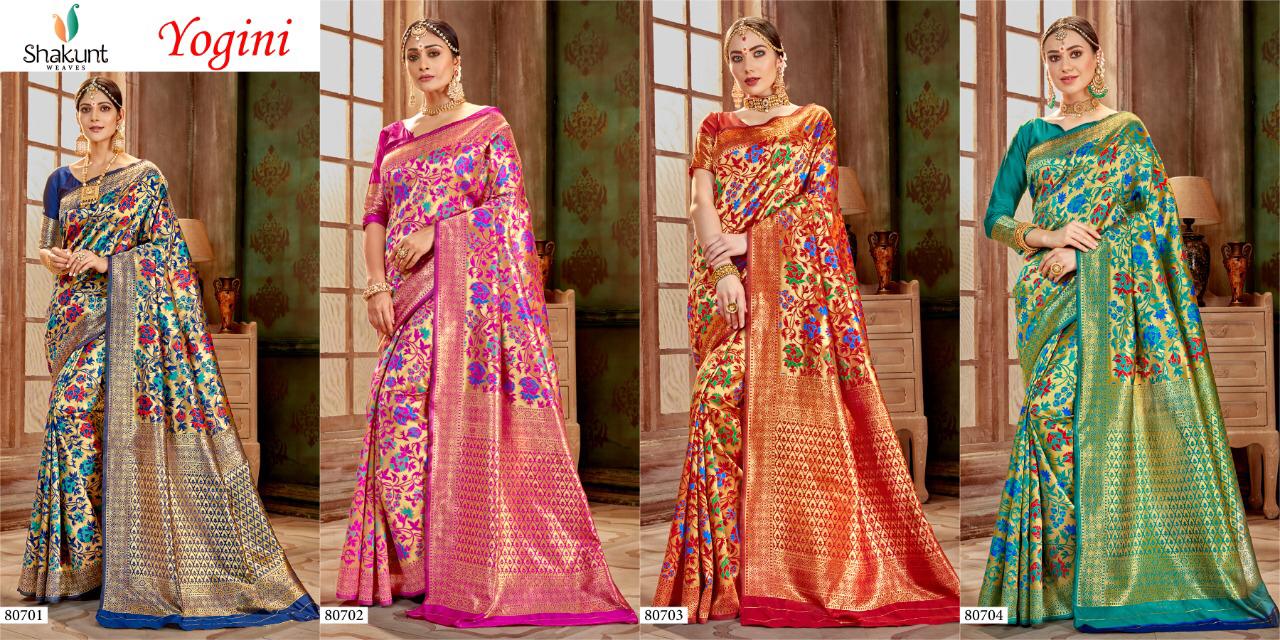 Brand - SHAKUNT. Catlog name - Yogini . Rate -881 per pcs Weaving silk Rich pallu . Set To Set. GST 5 Percent Extra. Delivery from tomorrow |