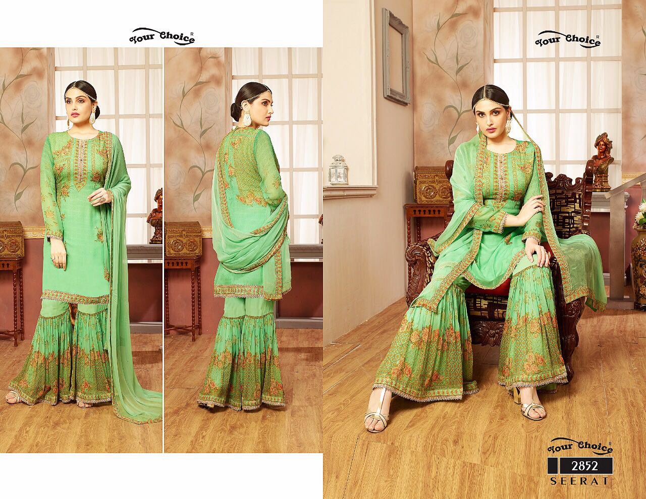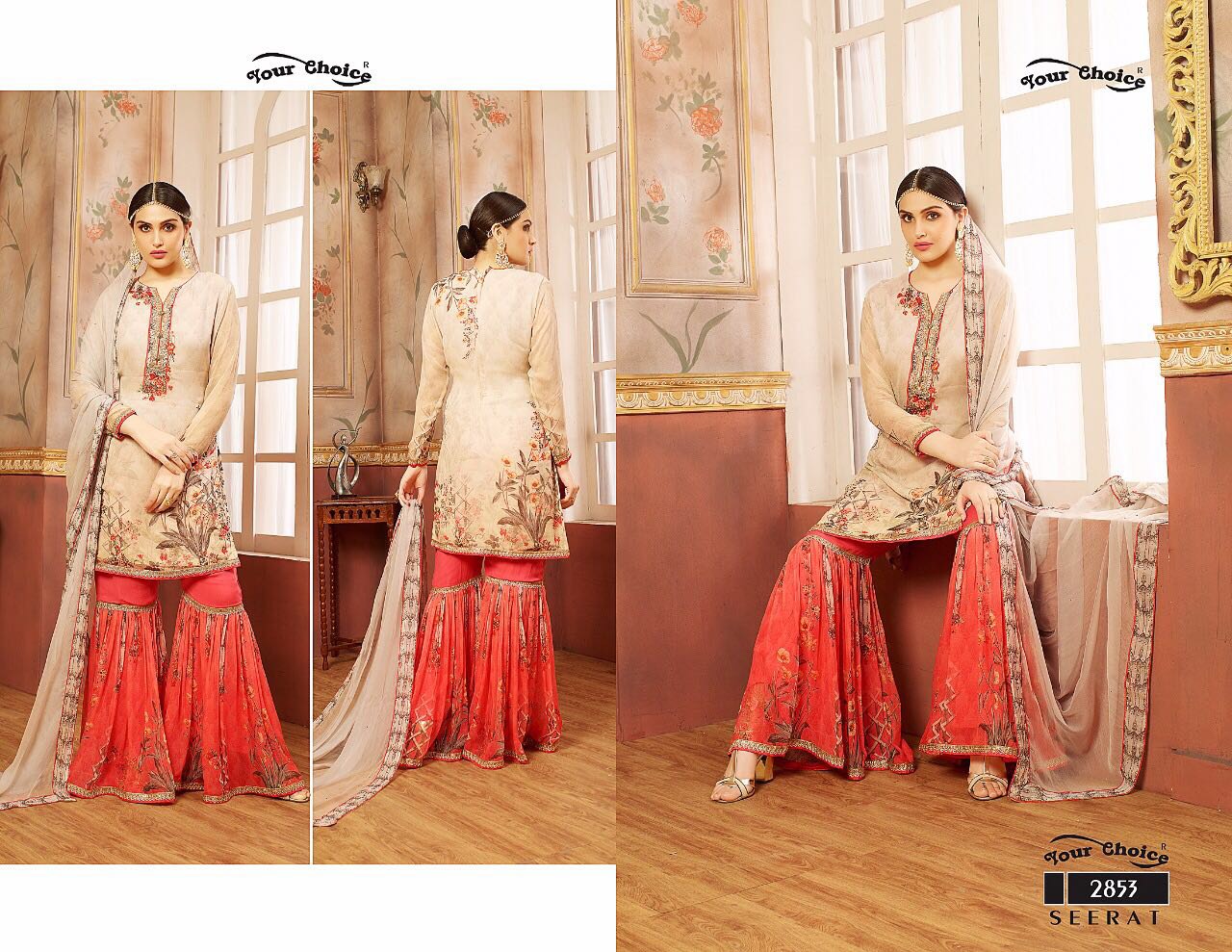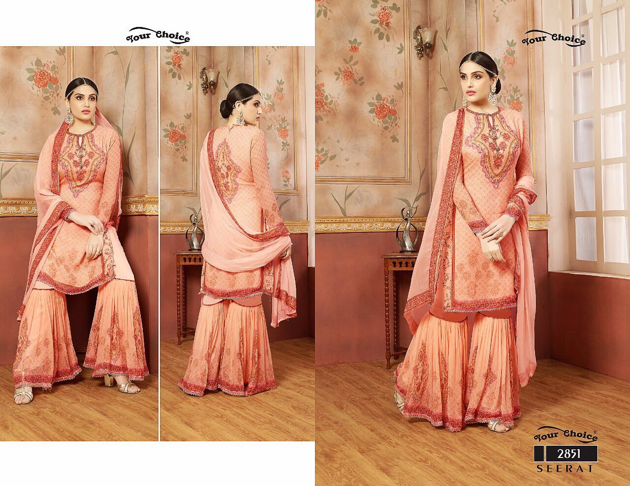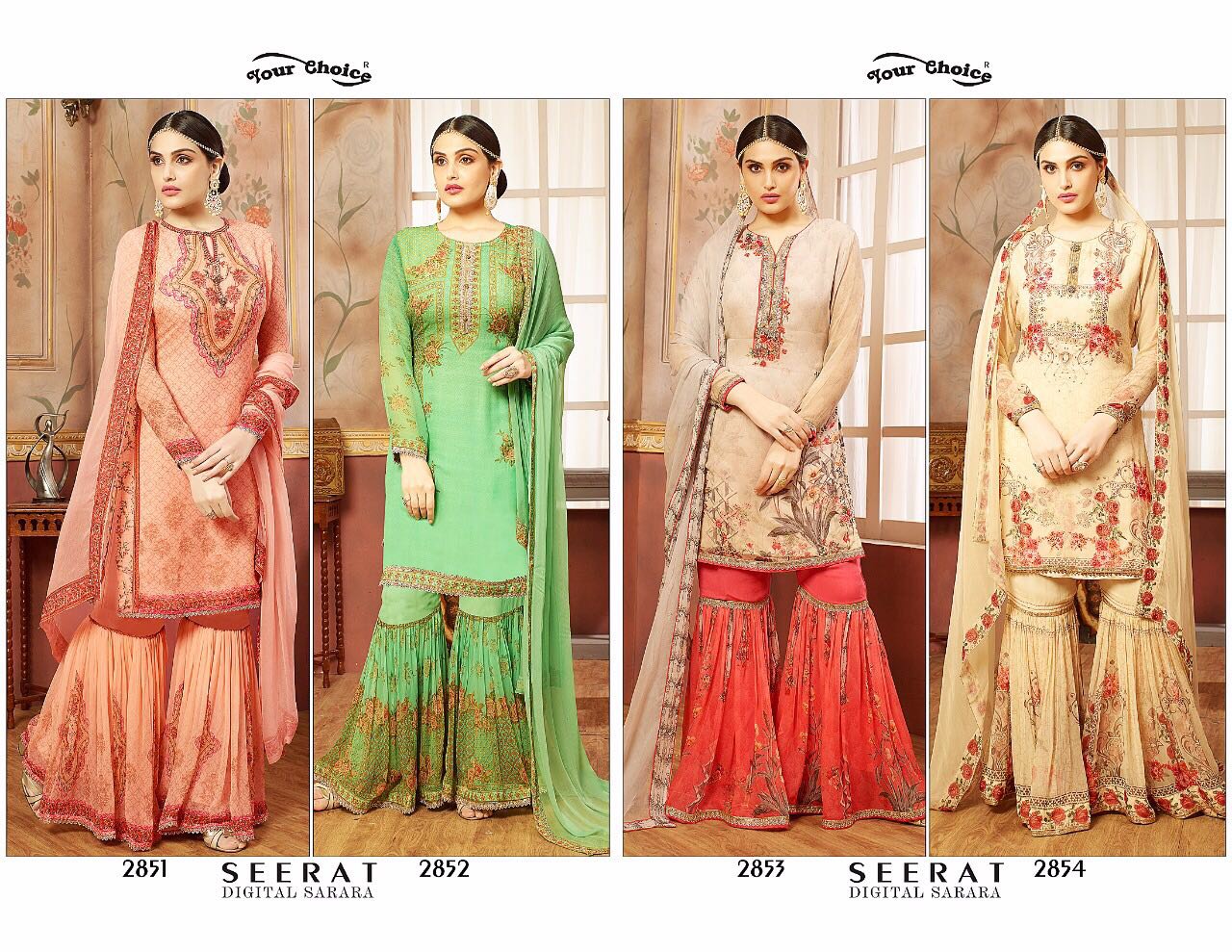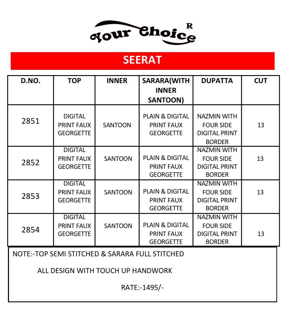 Buy Online Your Choice Seerat 2851 Series Designer Sarara Suits 4 Pcs of Full Catalogue at Wholesale Price. Looking for Your Choice Seerat 2851 Series Designer Sarara Suits Full Catalouge at Best Price? Buy Now Your Choice Seerat 2851 Series Designer Sarara Suits at Wholesale Rate of Rs 5980 with Total 4 Pcs from authroized dealer and supplier of YOUR CHOICE Brand. Cost of Each piece is just only Rs 1495 which is very low and affordable price to resale the product in your retail store ,This is Surat based Wholesale Supplier & Dealer of YOUR CHOICE Brand. Click on Brand name to Know more about YOUR CHOICE Brand's products.Call or Whatsapp on 9898838984 for booking or enquiry