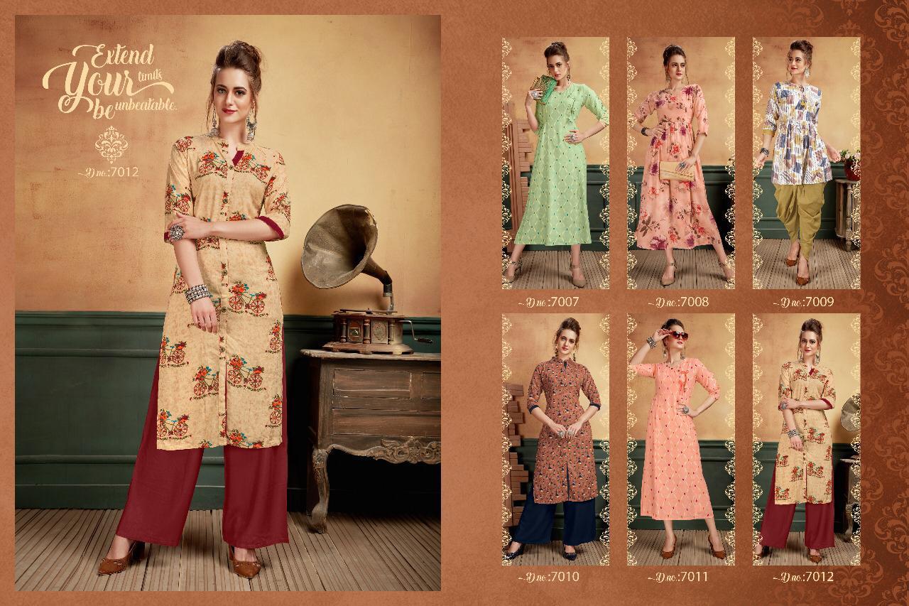 *Kurti Times* Presents Catalogue name- *ZARA* Fabric :- Rayon capsule Print, Rayon 14kg Print,Rayon dyed 14kg, Cotton..! 6pcs catalogue Size- L, XL,XXL Designs - 6 Rate :- 565/- GST +5% Add on Bill Amt. Set to set . Delivery from tomorrow |