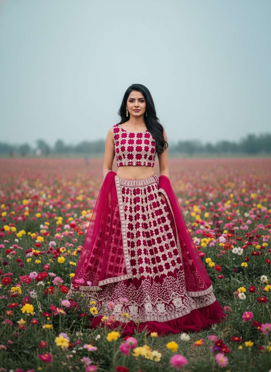 *Lehengha Fabric: Net with canvas attached* *Dupatta Fabric: Net* *Blouse Fabric - Net with Front & Back Embroidered work & Sleeves Fabric: Net*