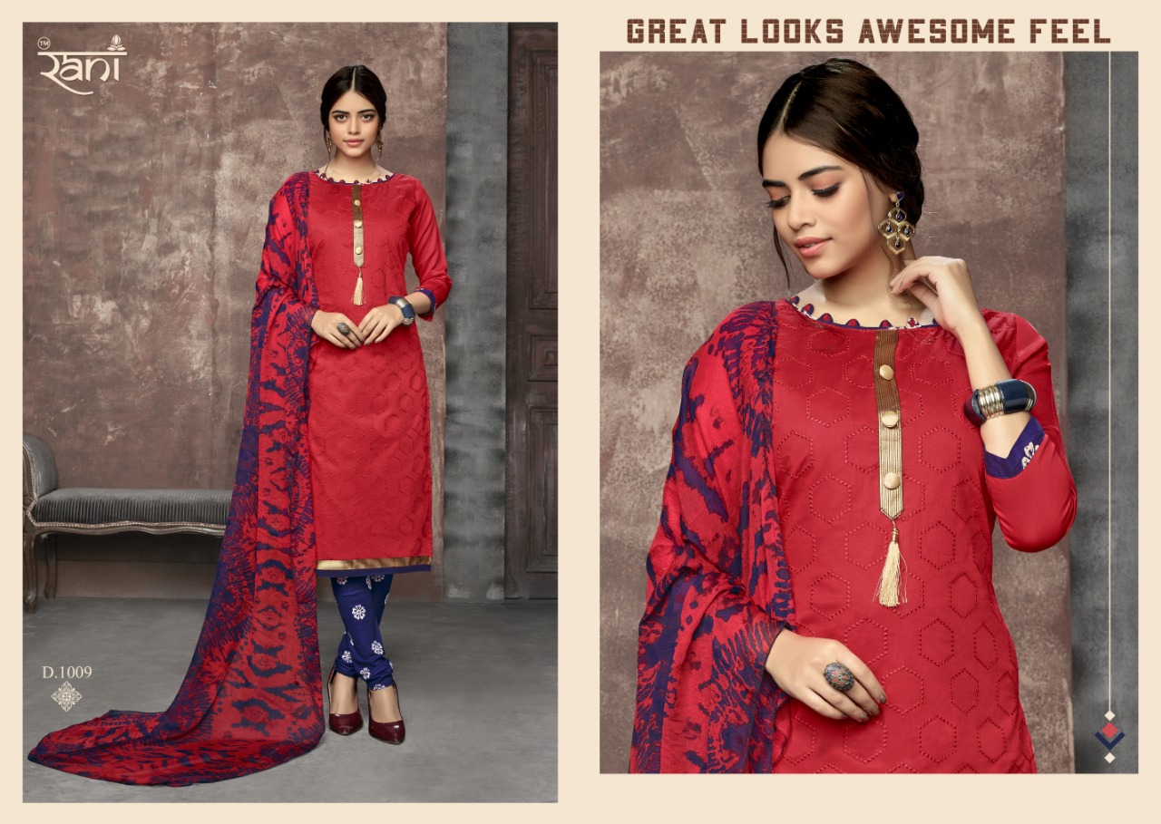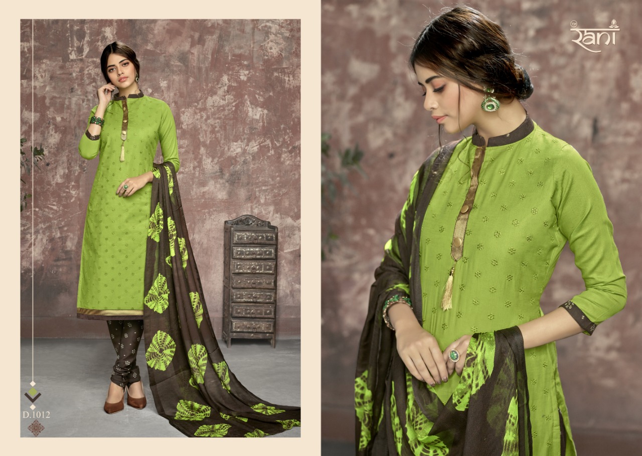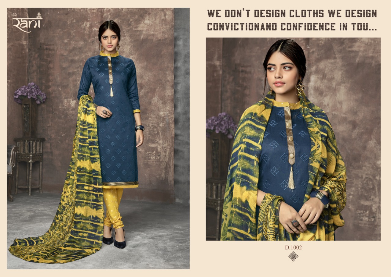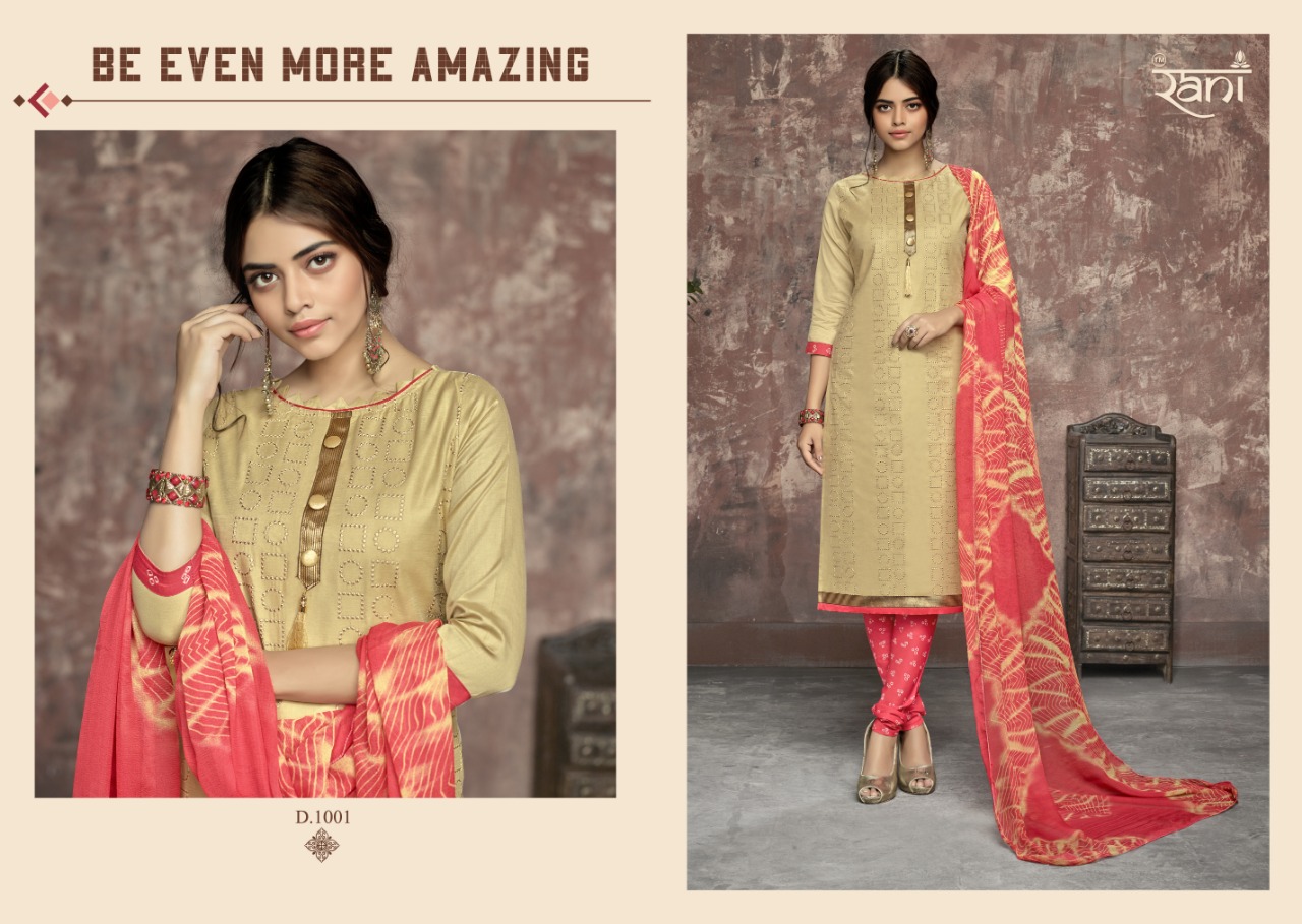 Buy Online Zhankar Vol 1 By Rani 1001 Series Fancy Cotton Satin Salwar Kameez Catlog Wholesaler Surat 12 Pcs of Full Catalogue at Wholesale Price. Looking for Zhankar Vol 1 By Rani 1001 Series Fancy Cotton Satin Salwar Kameez Catlog Wholesaler Surat Full Catalouge at Best Price? Buy Now Zhankar Vol 1 By Rani 1001 Series Fancy Cotton Satin Salwar Kameez Catlog Wholesaler Surat at Wholesale Rate of Rs 6300 with Total 12 Pcs from authroized dealer and supplier of RANI Brand. Cost of Each piece is just only Rs 525 which is very low and affordable price to resale the product in your retail store ,This is Surat based Wholesale Supplier & Dealer of RANI Brand. Click on Brand name to Know more about RANI Brand's products.Call or Whatsapp on 9898838984 for booking or enquiry