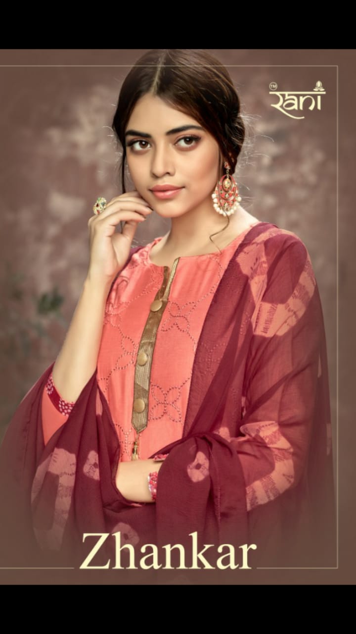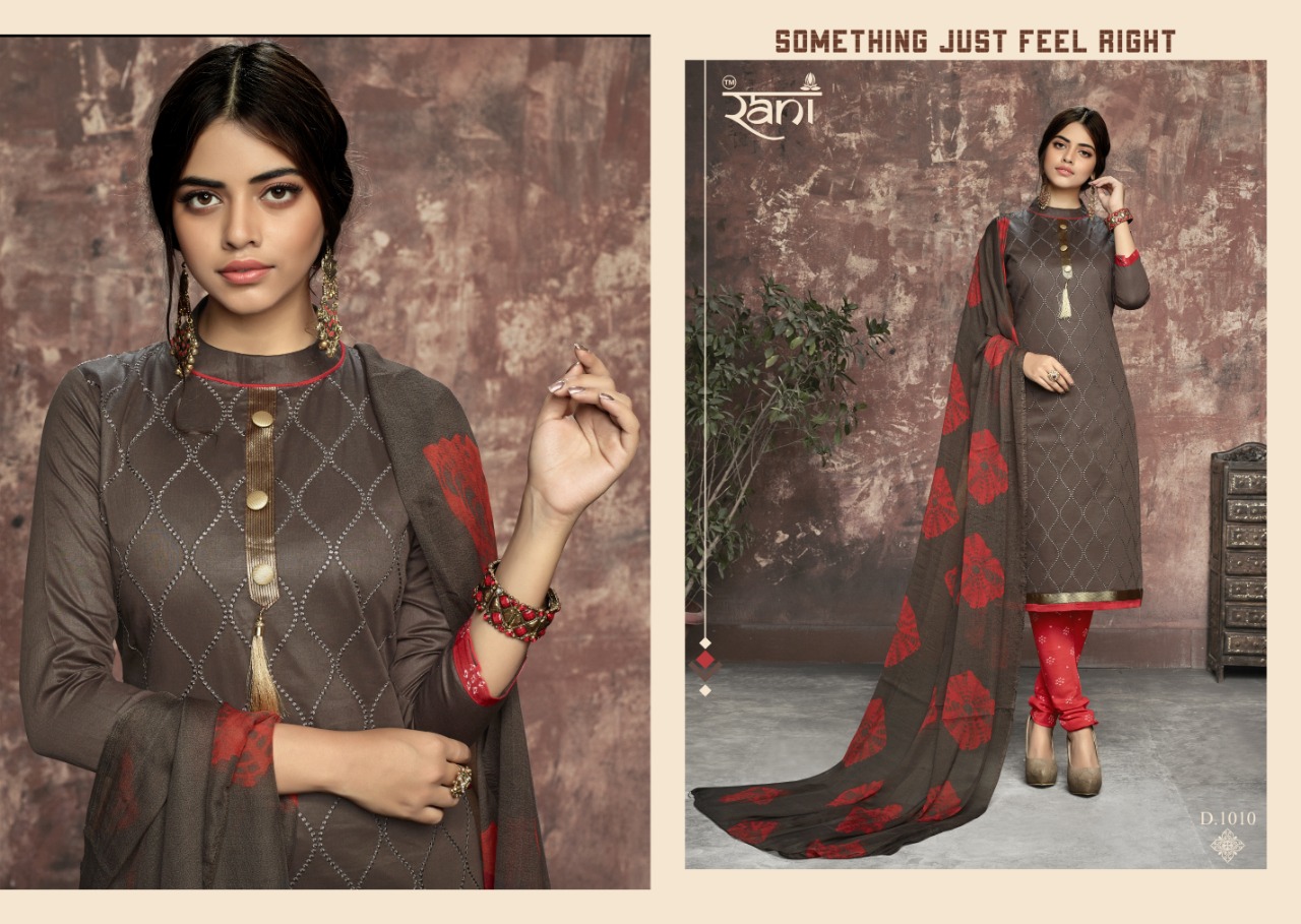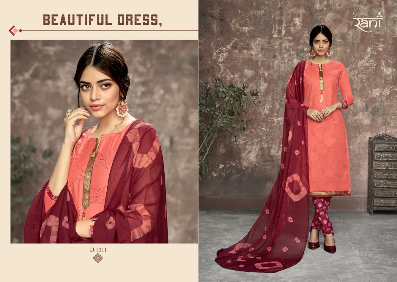 Buy Online Zhankar Vol 1 By Rani 1001 Series Fancy Cotton Satin Salwar Kameez Catlog Wholesaler Surat 12 Pcs of Full Catalogue at Wholesale Price. Looking for Zhankar Vol 1 By Rani 1001 Series Fancy Cotton Satin Salwar Kameez Catlog Wholesaler Surat Full Catalouge at Best Price? Buy Now Zhankar Vol 1 By Rani 1001 Series Fancy Cotton Satin Salwar Kameez Catlog Wholesaler Surat at Wholesale Rate of Rs 6300 with Total 12 Pcs from authroized dealer and supplier of RANI Brand. Cost of Each piece is just only Rs 525 which is very low and affordable price to resale the product in your retail store ,This is Surat based Wholesale Supplier & Dealer of RANI Brand. Click on Brand name to Know more about RANI Brand's products.Call or Whatsapp on 9898838984 for booking or enquiry