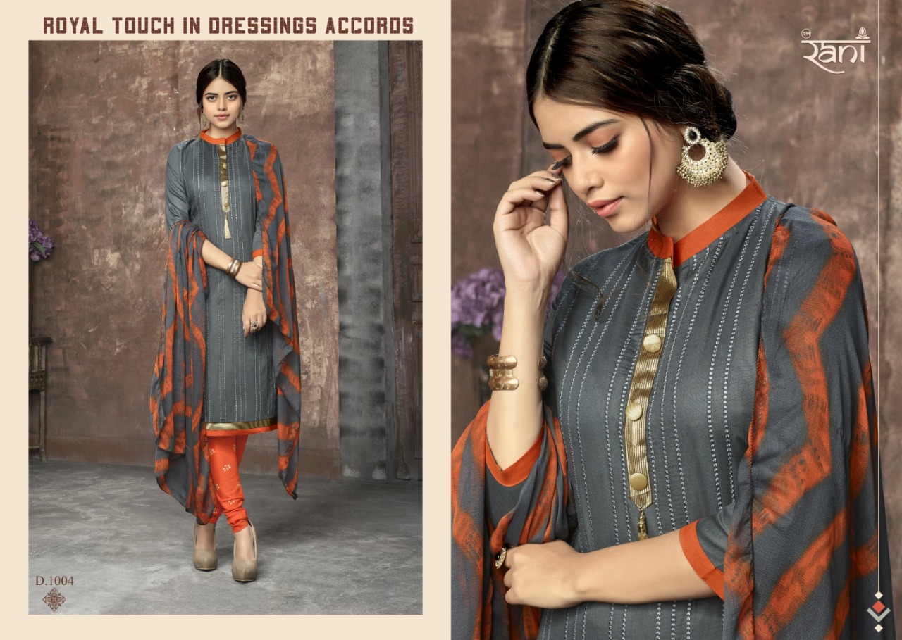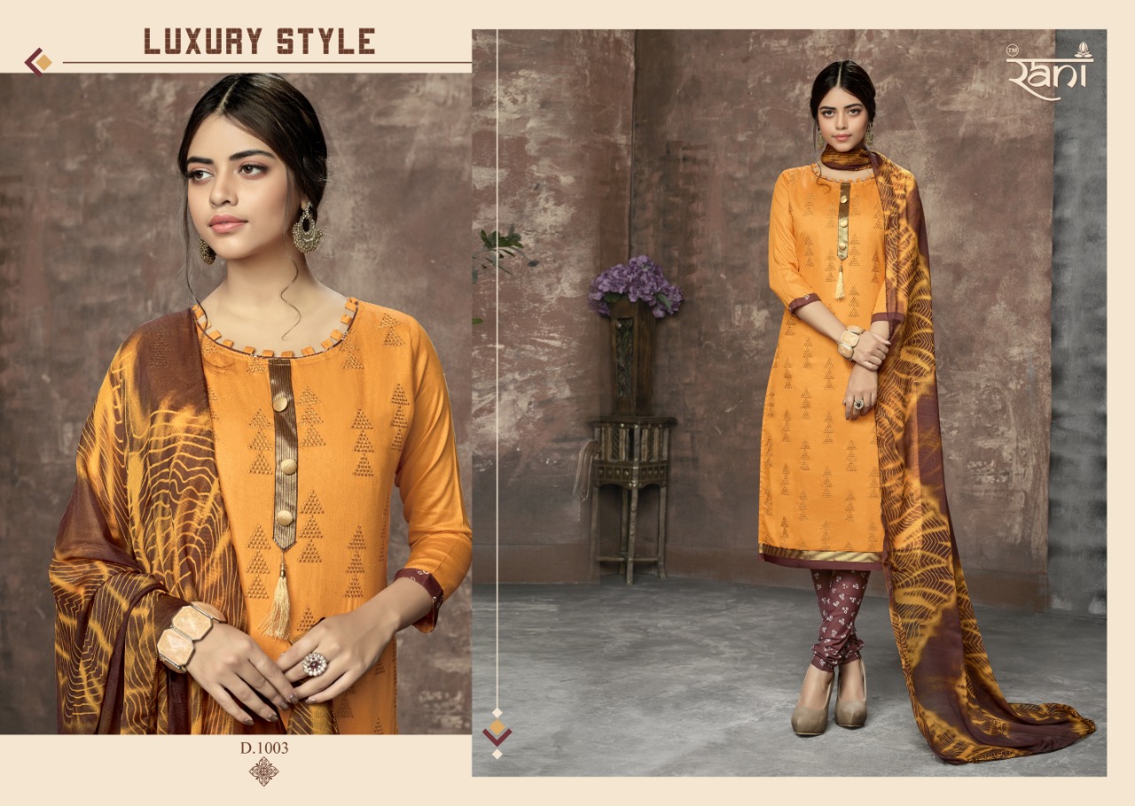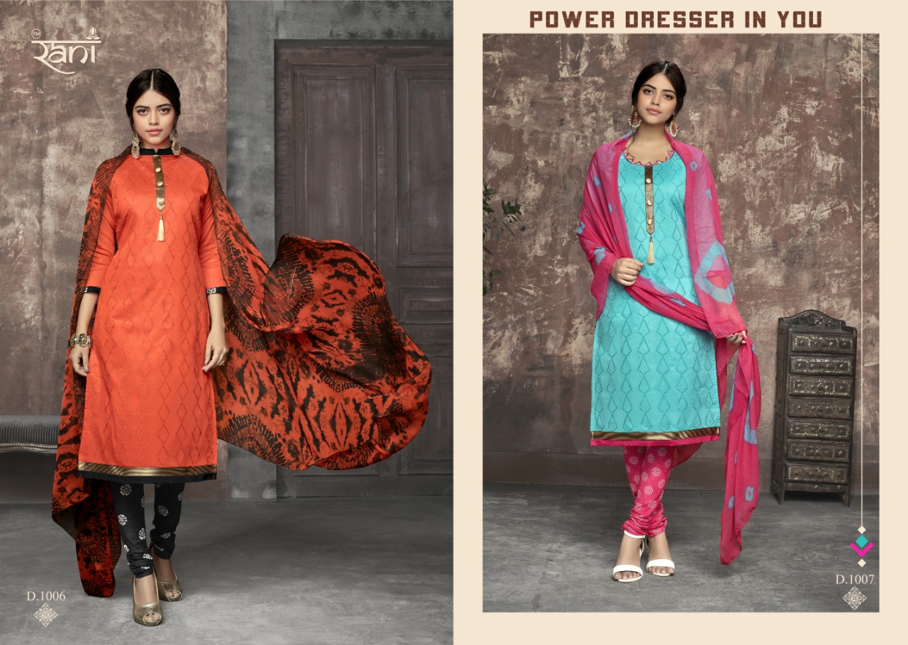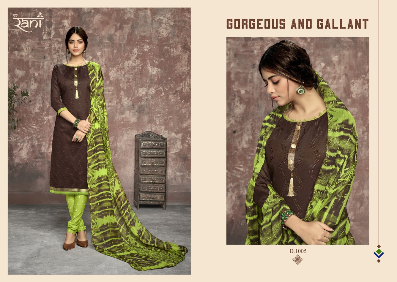 Buy Online Zhankar Vol 1 By Rani 1001 Series Fancy Cotton Satin Salwar Kameez Catlog Wholesaler Surat 12 Pcs of Full Catalogue at Wholesale Price. Looking for Zhankar Vol 1 By Rani 1001 Series Fancy Cotton Satin Salwar Kameez Catlog Wholesaler Surat Full Catalouge at Best Price? Buy Now Zhankar Vol 1 By Rani 1001 Series Fancy Cotton Satin Salwar Kameez Catlog Wholesaler Surat at Wholesale Rate of Rs 6300 with Total 12 Pcs from authroized dealer and supplier of RANI Brand. Cost of Each piece is just only Rs 525 which is very low and affordable price to resale the product in your retail store ,This is Surat based Wholesale Supplier & Dealer of RANI Brand. Click on Brand name to Know more about RANI Brand's products.Call or Whatsapp on 9898838984 for booking or enquiry