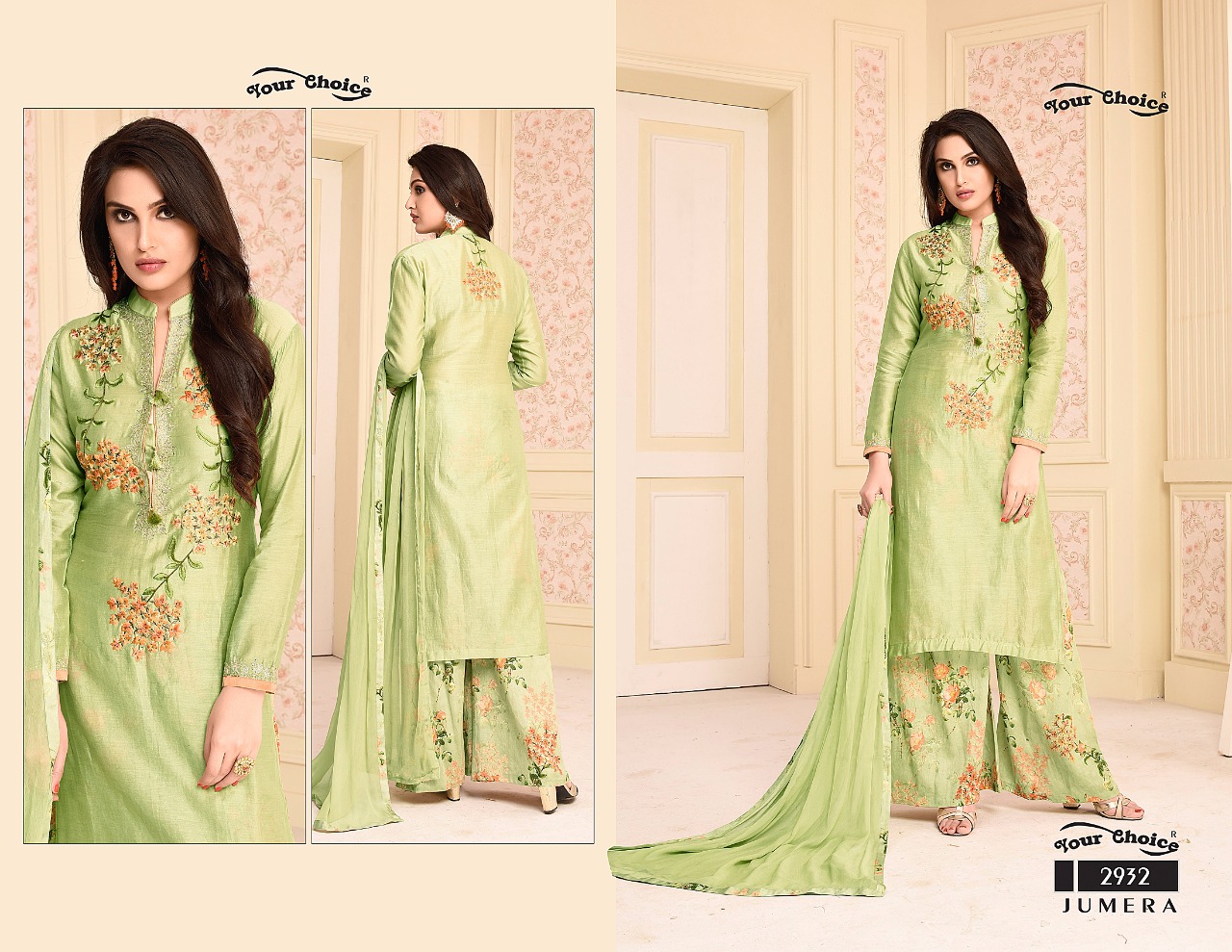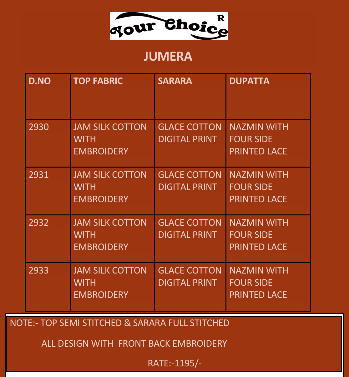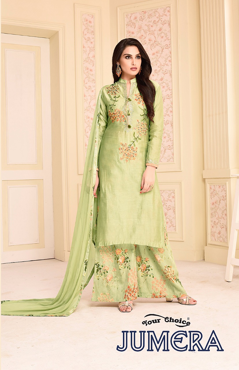 Buy Online Zumera By Your Choice Jam Silk Cotton Sarara Suits Wholesale Supplier And Dealer Surat 4 Pcs of Full Catalogue at Wholesale Price. Looking for Zumera By Your Choice Jam Silk Cotton Sarara Suits Wholesale Supplier And Dealer Surat Full Catalouge at Best Price? Buy Now Zumera By Your Choice Jam Silk Cotton Sarara Suits Wholesale Supplier And Dealer Surat at Wholesale Rate of Rs 4780 with Total 4 Pcs from authroized dealer and supplier of YOUR CHOICE Brand. Cost of Each piece is just only Rs 1195 which is very low and affordable price to resale the product in your retail store ,This is Surat based Wholesale Supplier & Dealer of YOUR CHOICE Brand. Click on Brand name to Know more about YOUR CHOICE Brand's products.Call or Whatsapp on 9898838984 for booking or enquiry