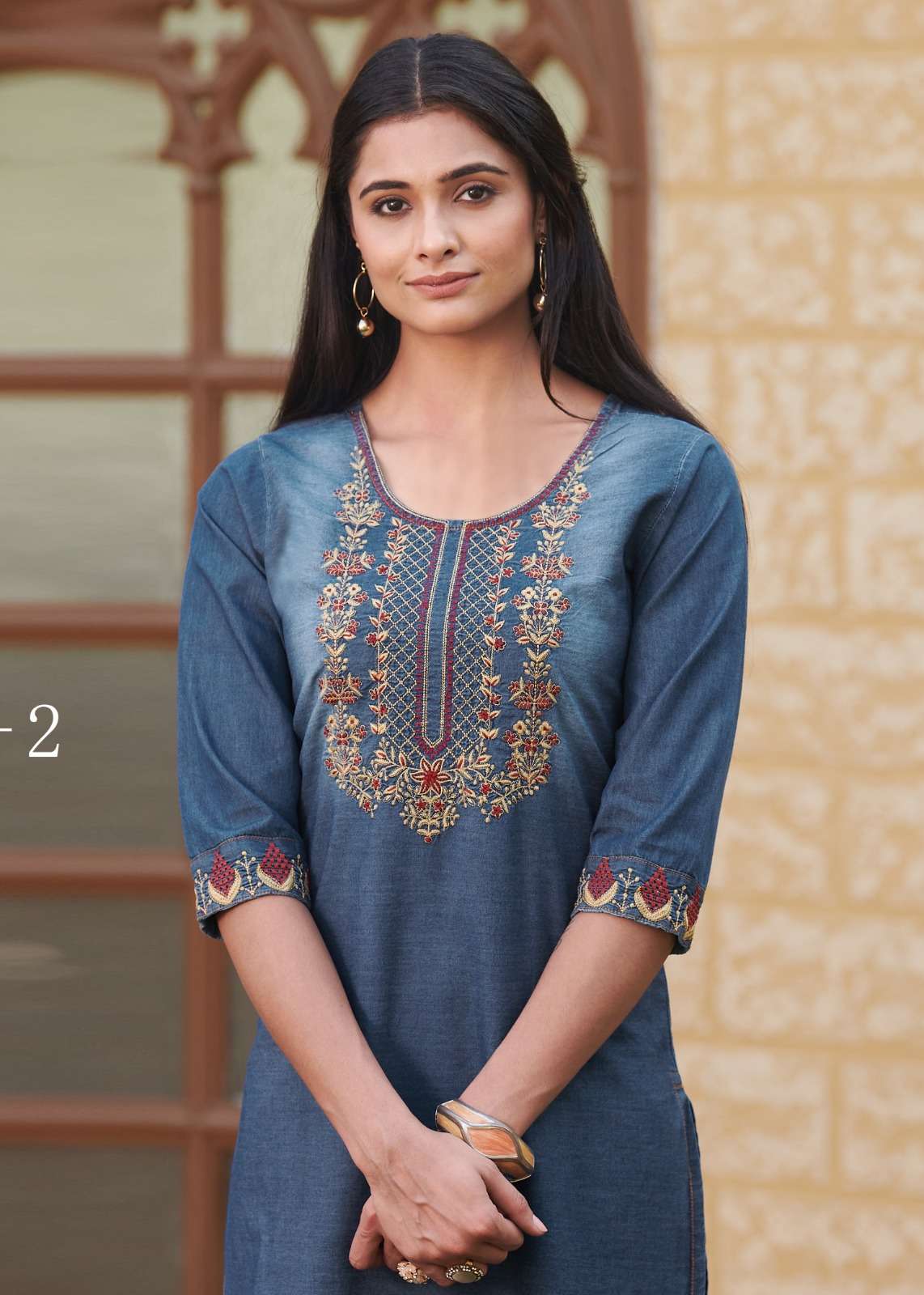 Kumb Slider By Seriema 1228 Series Fancy Cotton Denim Kurti Catlog Wholesale Dealer Surat