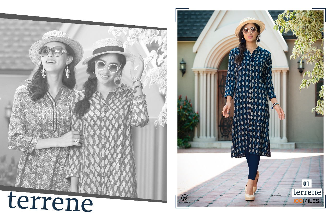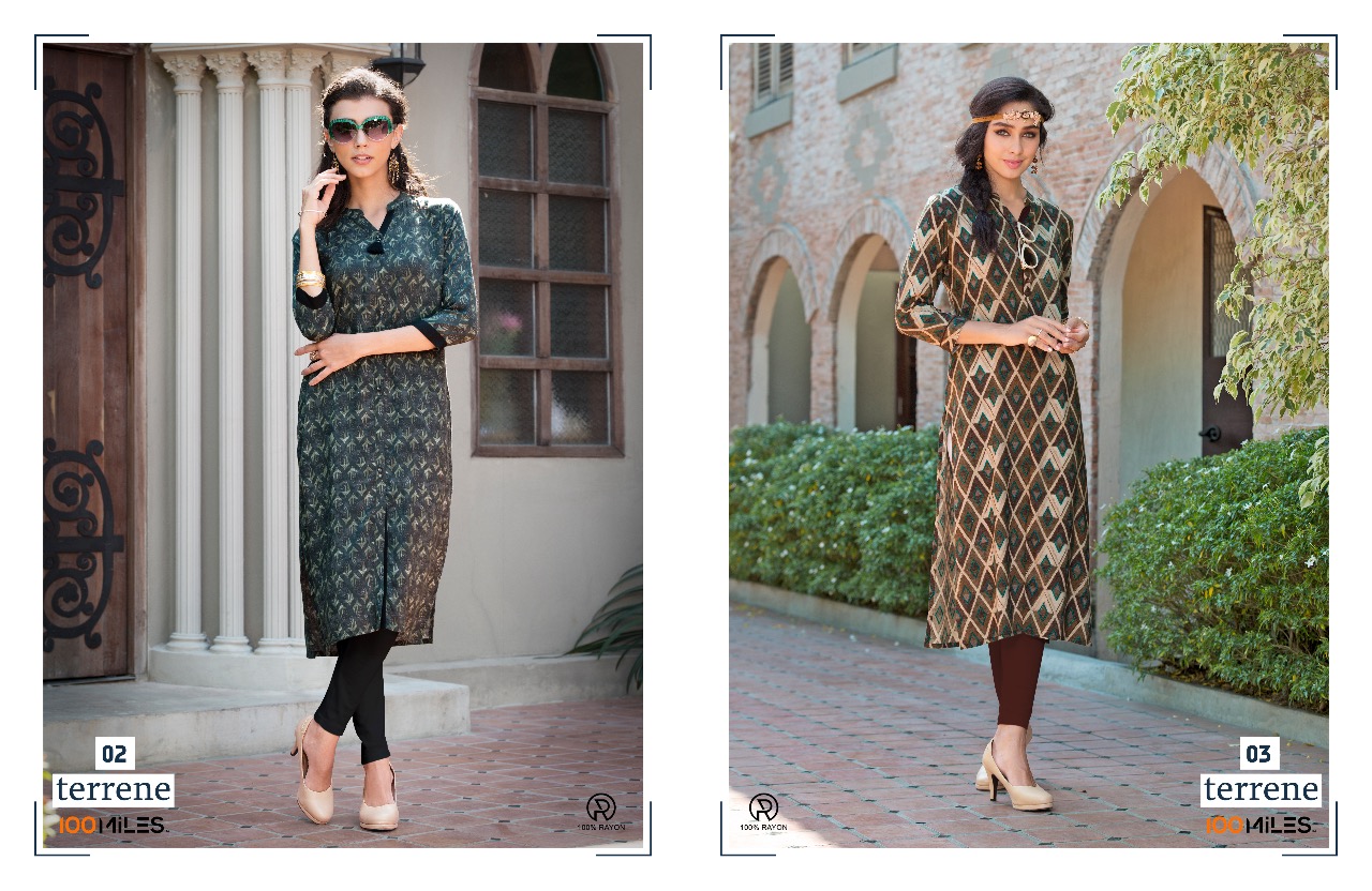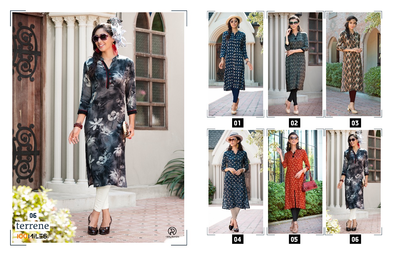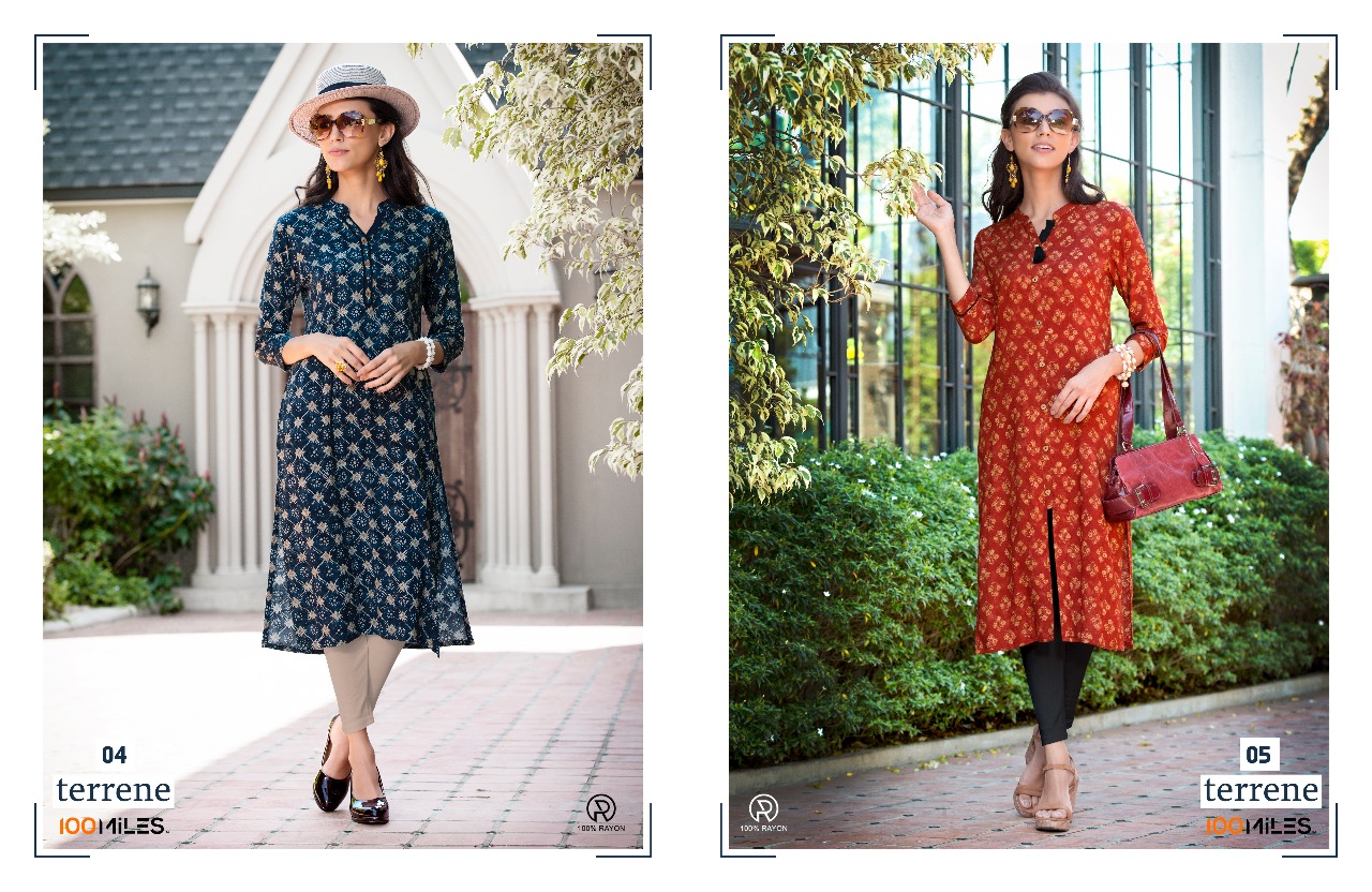 Buy Online 100miles Terrene 01 Series Reyon Print Kurti Dealer 6 Pcs of Full Catalogue at Wholesale Price. Looking for 100miles Terrene 01 Series Reyon Print Kurti Dealer Full Catalouge at Best Price? Buy Now 100miles Terrene 01 Series Reyon Print Kurti Dealer at Wholesale Rate of Rs 2550 with Total 6 Pcs from authroized dealer and supplier of 100 MILES Brand. Cost of Each piece is just only Rs 425 which is very low and affordable price to resale the product in your retail store ,This is Surat based Wholesale Supplier & Dealer of 100 MILES Brand. Click on Brand name to Know more about 100 MILES Brand's products.Call or Whatsapp on 9898838984 for booking or enquiry