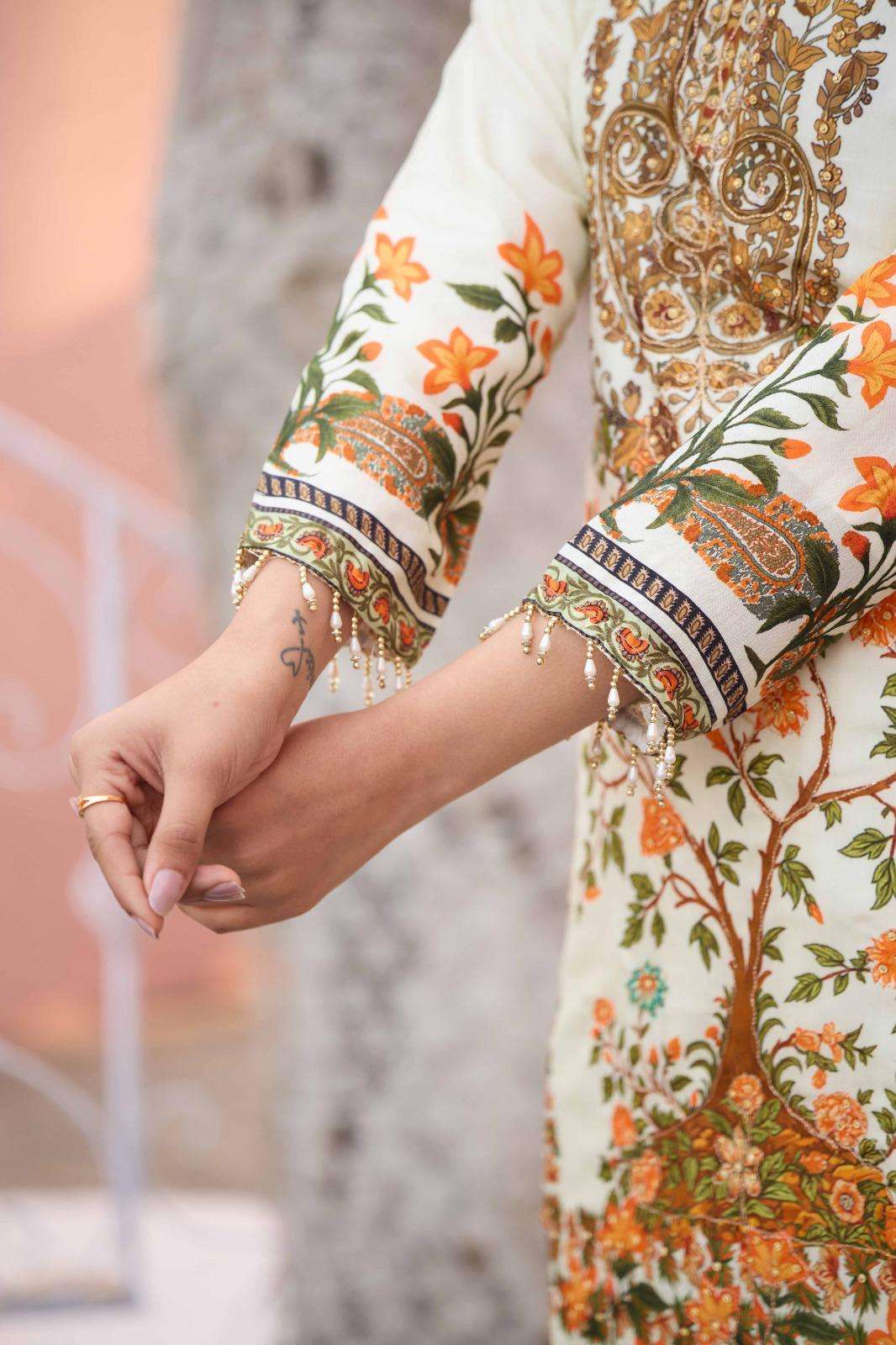(#-1162) ➖➖➖➖➖➖➖ ✨ by ALEENA®️ ✨ ➖➖➖➖➖➖➖➖ ❤️ Description❤️ 〰〰〰〰〰〰〰 Designer Tunic Embellished with beautiful DIGITLE PRINTED WITH AARI HAND WORK NECK & EMBLISHMENT TOP. DIGITLE PRINTES SLEEVES WITH EMBLISHMENT & paired with PLAZO SALWAR.DIGITLE PRINTED DUPATTA WITH LACE