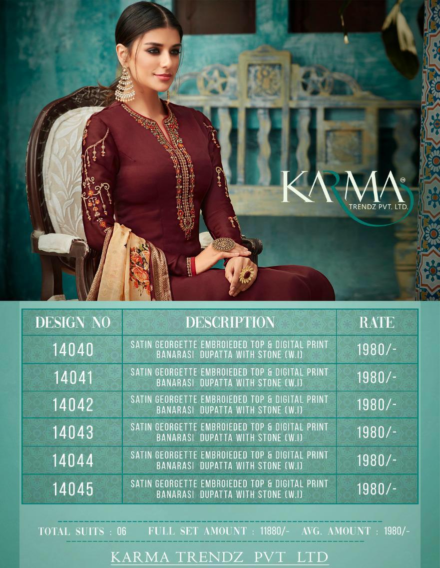 Buy Online 14040 Series By Karma Fancy Party Wear Satin Georgette Salwar Kameez Catlog Wholesale Dealer Surat 6 Pcs of Full Catalogue at Wholesale Price. Looking for 14040 Series By Karma Fancy Party Wear Satin Georgette Salwar Kameez Catlog Wholesale Dealer Surat Full Catalouge at Best Price? Buy Now 14040 Series By Karma Fancy Party Wear Satin Georgette Salwar Kameez Catlog Wholesale Dealer Surat at Wholesale Rate of Rs 11880 with Total 6 Pcs from authroized dealer and supplier of KARMA Brand. Cost of Each piece is just only Rs 1980 which is very low and affordable price to resale the product in your retail store ,This is Surat based Wholesale Supplier & Dealer of KARMA Brand. Click on Brand name to Know more about KARMA Brand's products.Call or Whatsapp on 9898838984 for booking or enquiry