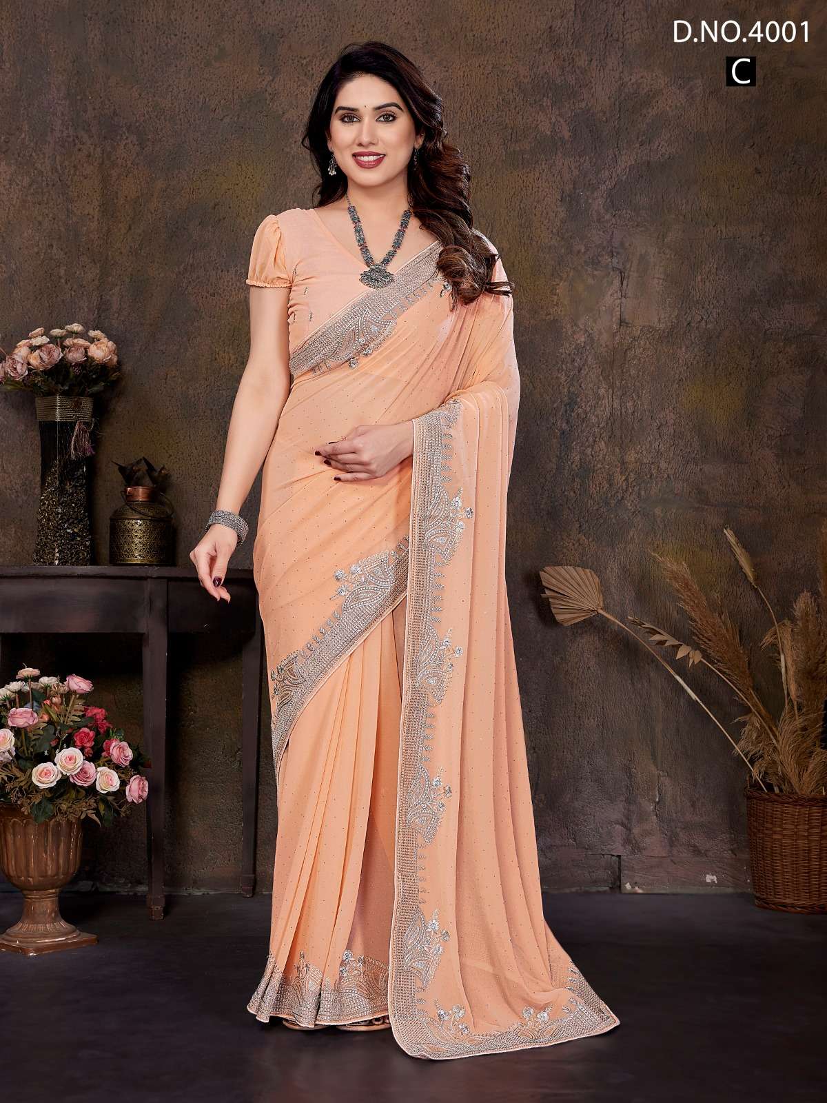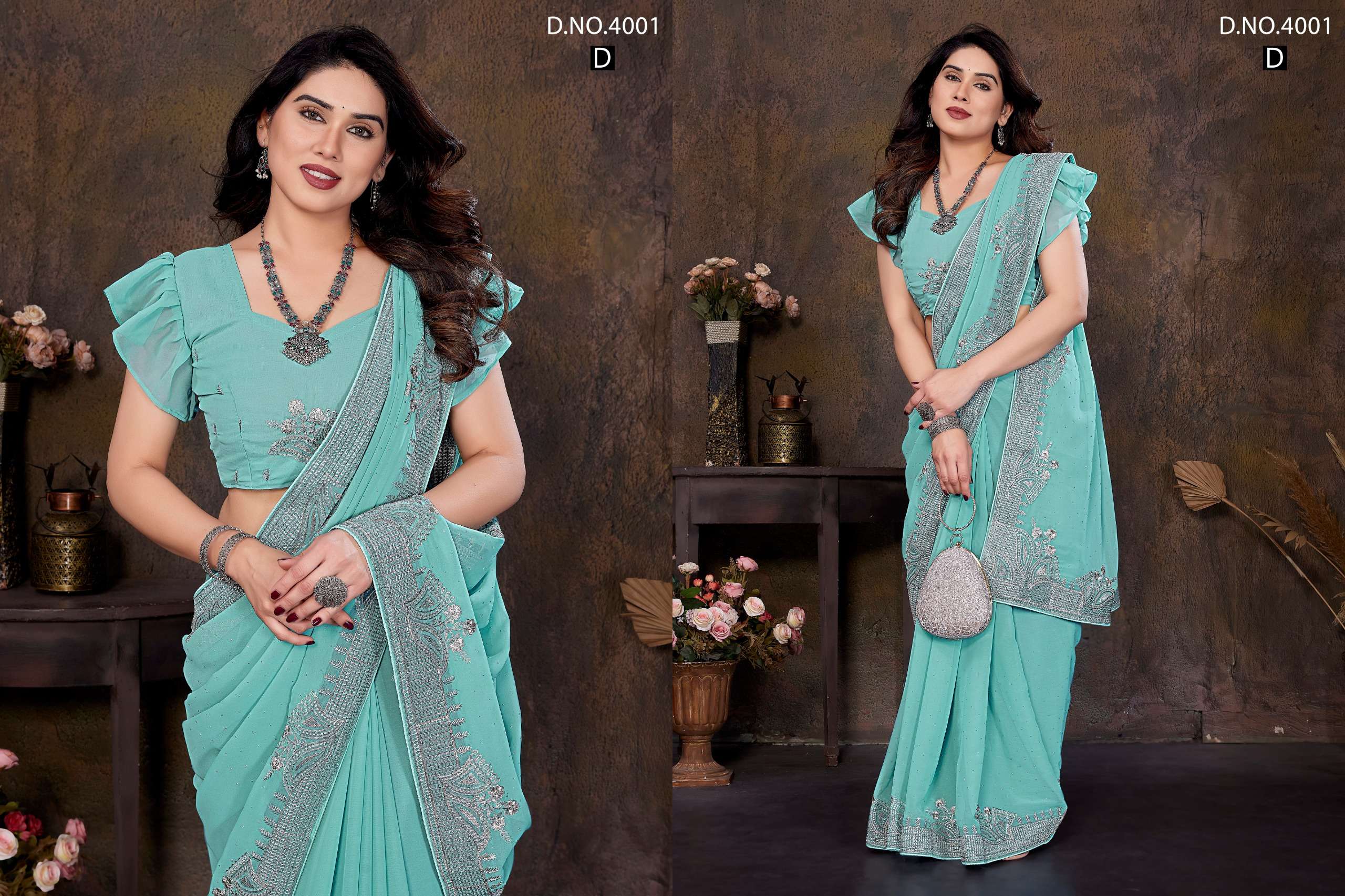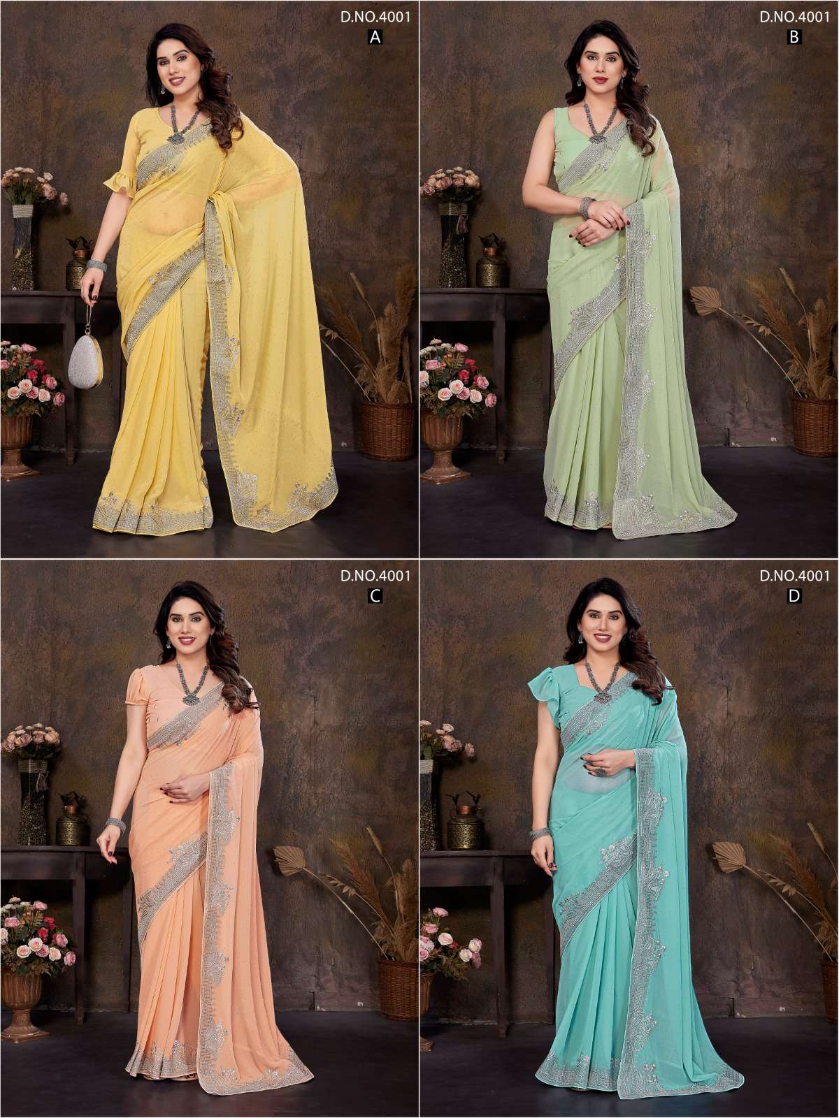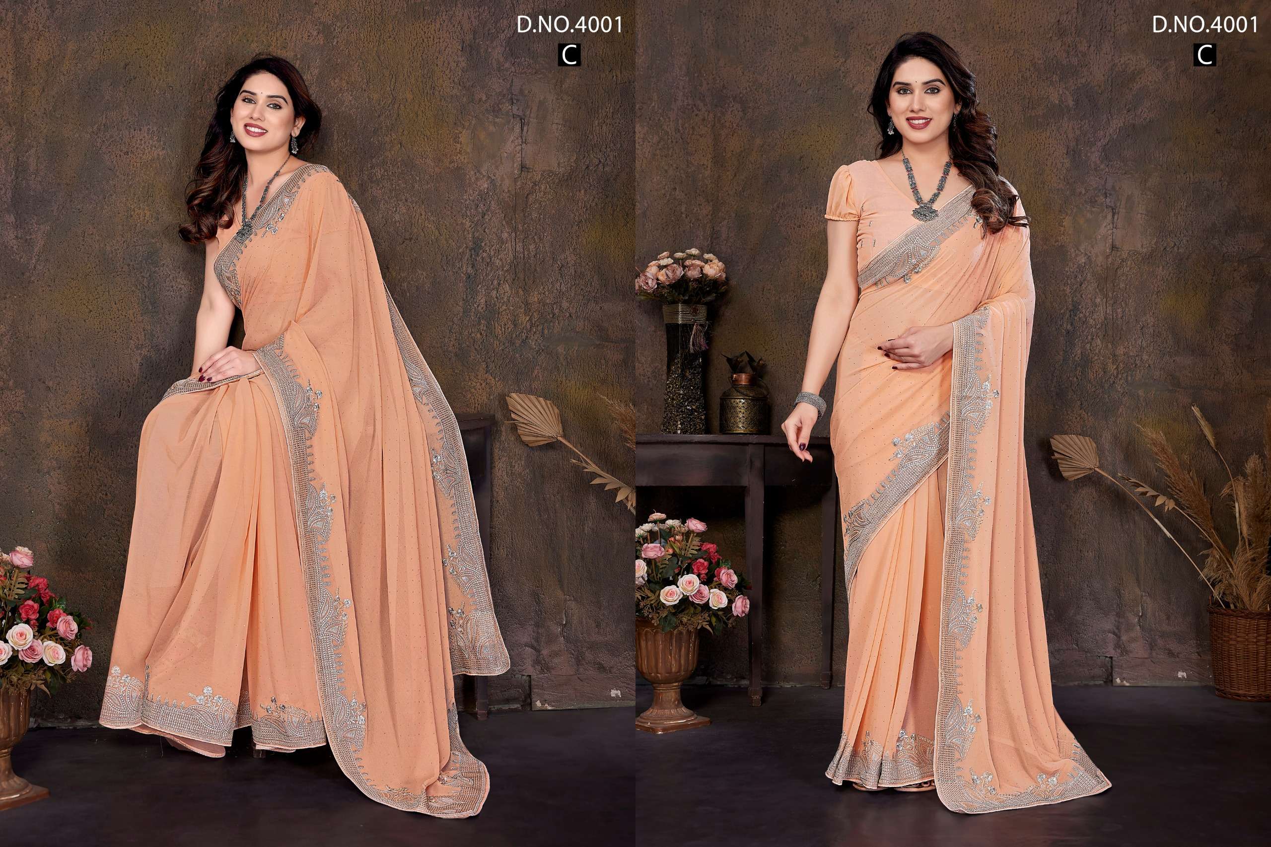 *Collection Details:* - *Brand:* Jayshree - *Catalog Name:* 4001A to 4001D - *Saree Fabric:* 60 Gram Georgette with Zari and Stone Work - *Blouse Fabric:* 60 Gram Georgette with Zari and Stone Work - *Rate:* ₹685/- + 5% GST - *Occasion:* Perfect for Party Wear, Festive Wear