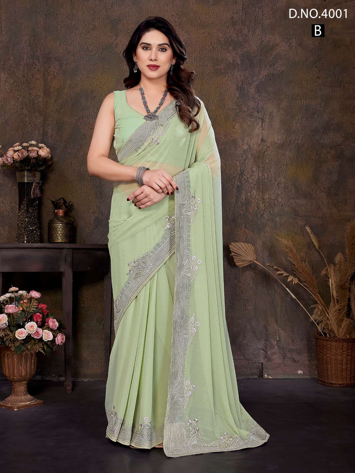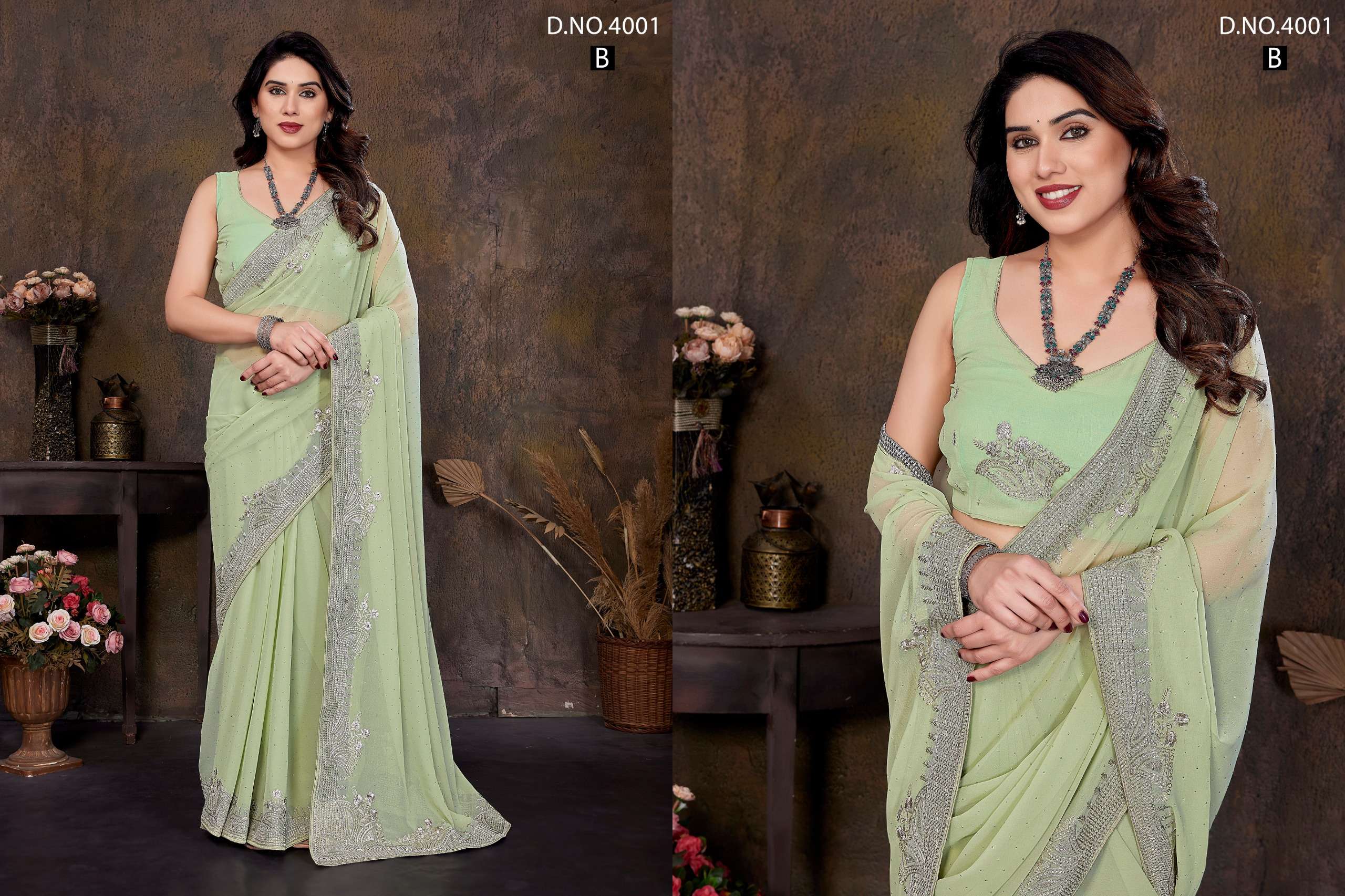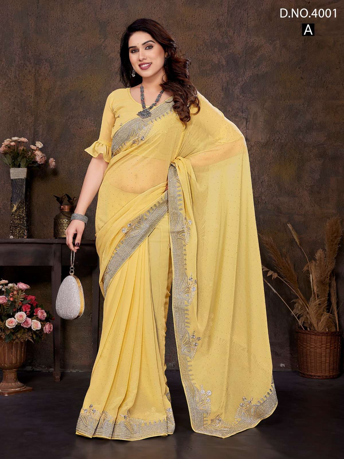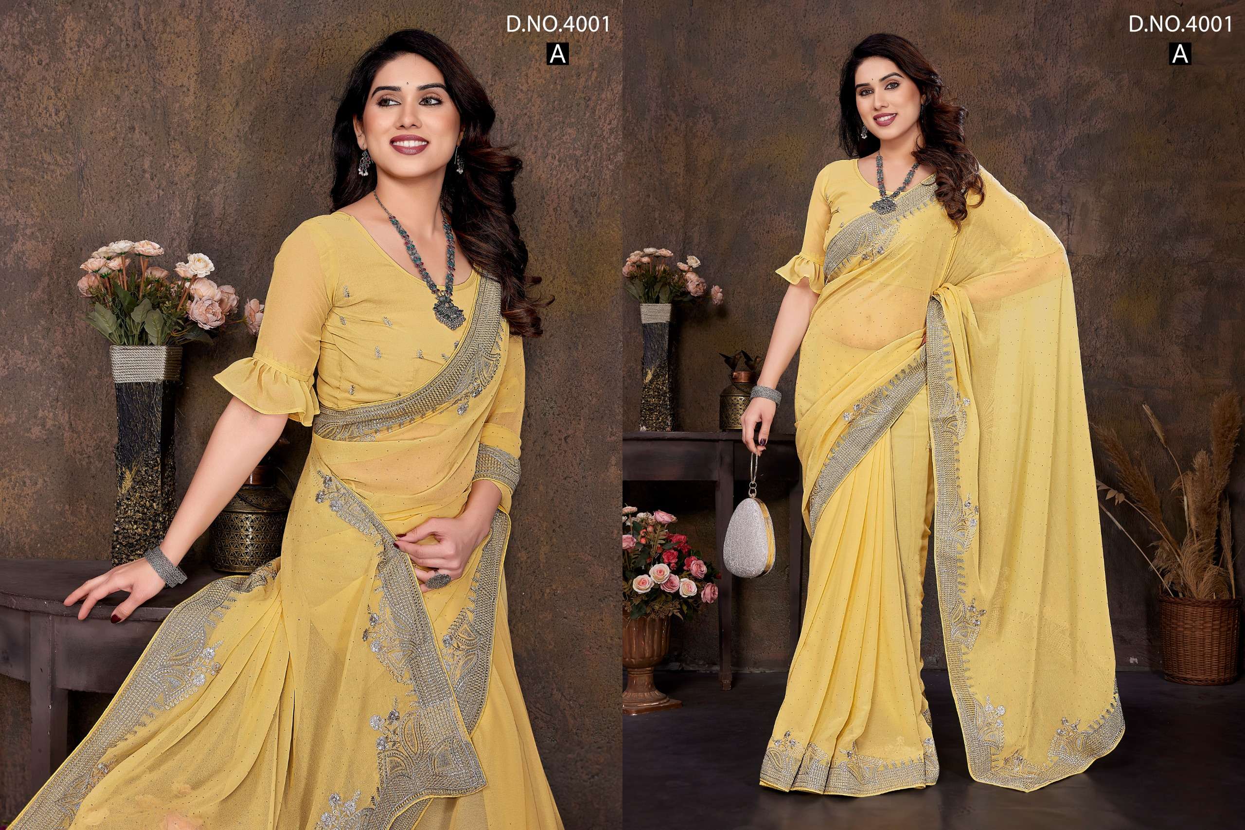 *Collection Details:* - *Brand:* Jayshree - *Catalog Name:* 4001A to 4001D - *Saree Fabric:* 60 Gram Georgette with Zari and Stone Work - *Blouse Fabric:* 60 Gram Georgette with Zari and Stone Work - *Rate:* ₹685/- + 5% GST - *Occasion:* Perfect for Party Wear, Festive Wear
