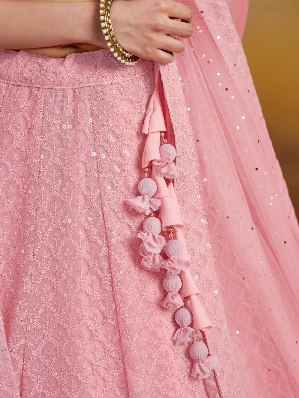 Look elegant in this pretty pink monochrome georgette lehenga choli, beautifully detailed with sequins and thread embroidery for a graceful bridesmaid look.