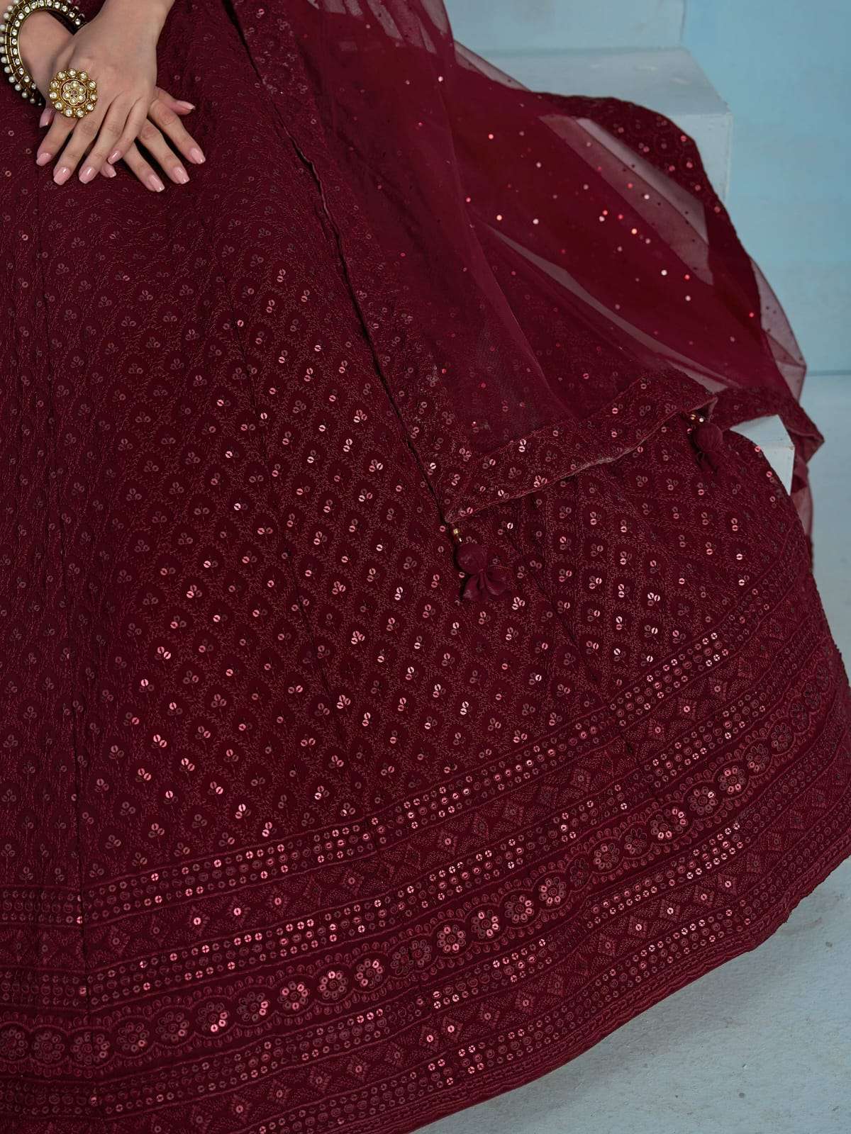 This superior maroon georgette monochrome lehenga choli is designed for weddings and receptions, featuring intricate sequins and thread embroidery.