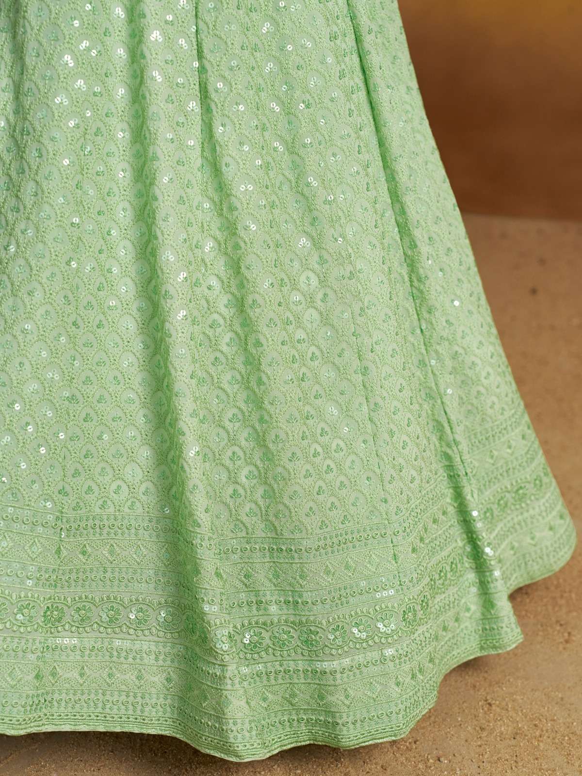Shine in elegance with this fantastic mint green monochrome georgette lehenga choli, featuring sequins and thread embroidery for a refined look.