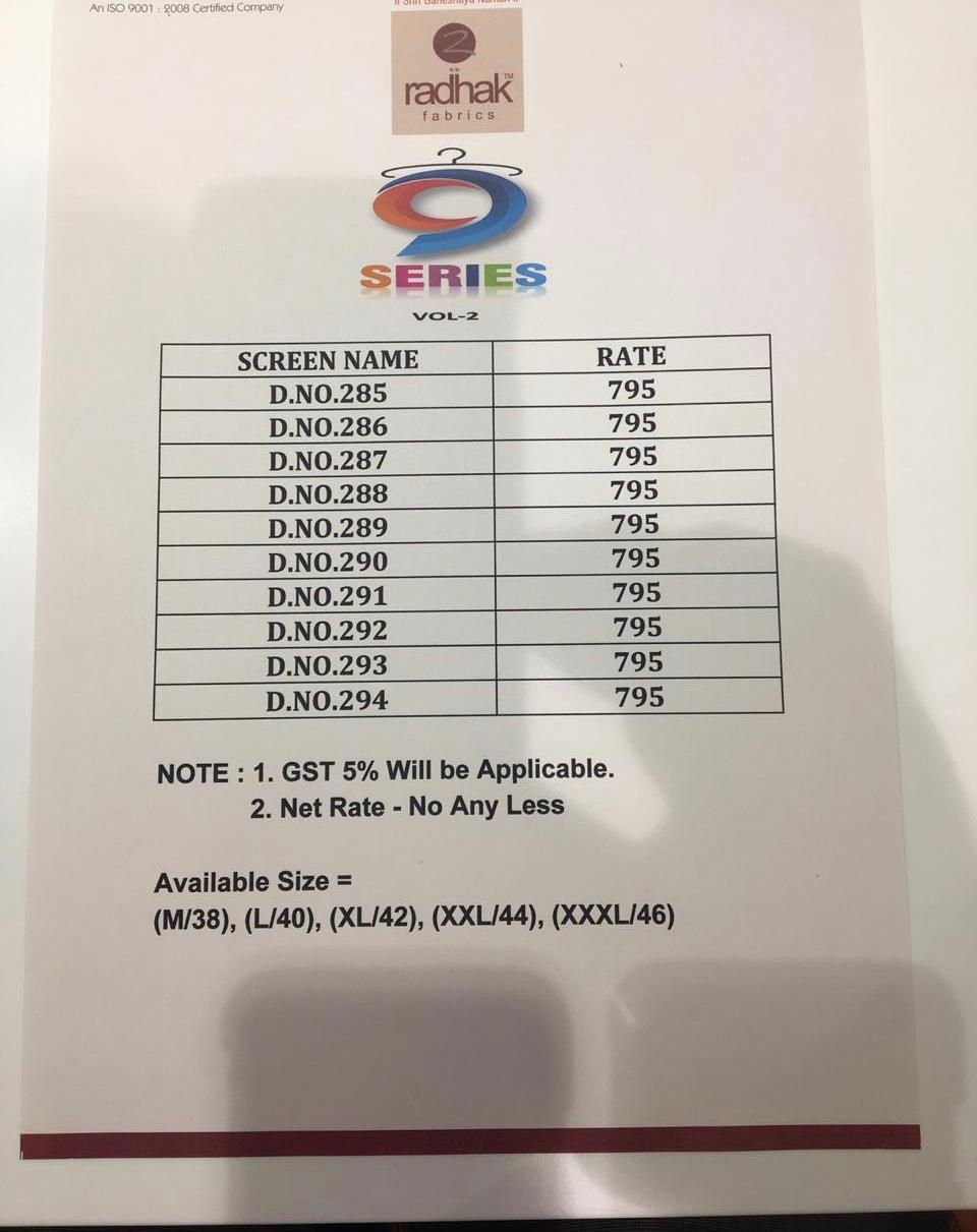 Buy Online 9 Series Vol 2 By Radhak 285 Series Fancy Designer Printed Saree Collection Wholesale Dealer Surat 10 Pcs of Full Catalogue at Wholesale Price. Looking for 9 Series Vol 2 By Radhak 285 Series Fancy Designer Printed Saree Collection Wholesale Dealer Surat Full Catalouge at Best Price? Buy Now 9 Series Vol 2 By Radhak 285 Series Fancy Designer Printed Saree Collection Wholesale Dealer Surat at Wholesale Rate of Rs 7950 with Total 10 Pcs from authroized dealer and supplier of RADHAK FASHION Brand. Cost of Each piece is just only Rs 795 which is very low and affordable price to resale the product in your retail store ,This is Surat based Wholesale Supplier & Dealer of RADHAK FASHION Brand. Click on Brand name to Know more about RADHAK FASHION Brand's products.Call or Whatsapp on 9898838984 for booking or enquiry