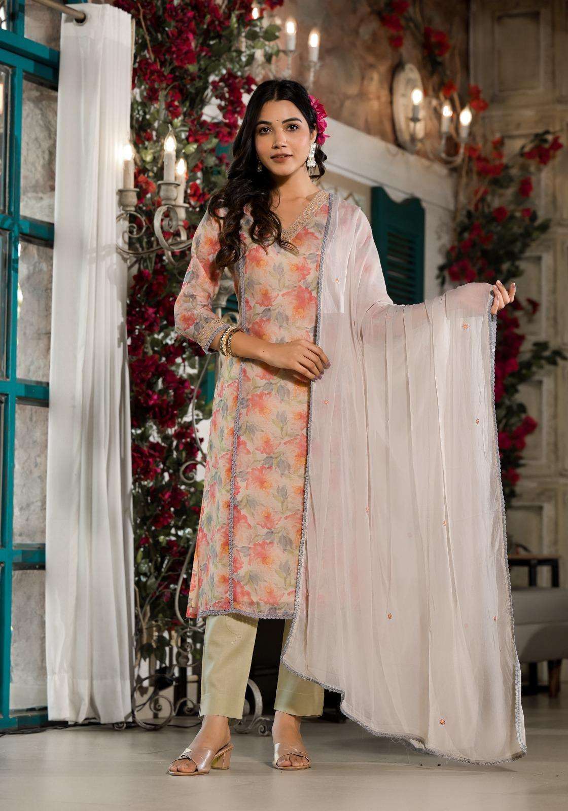 Chanderi silk print Suit with v neck work matching chiffon embroidery dupatta with four side crochio lace, cotton slub pant.
