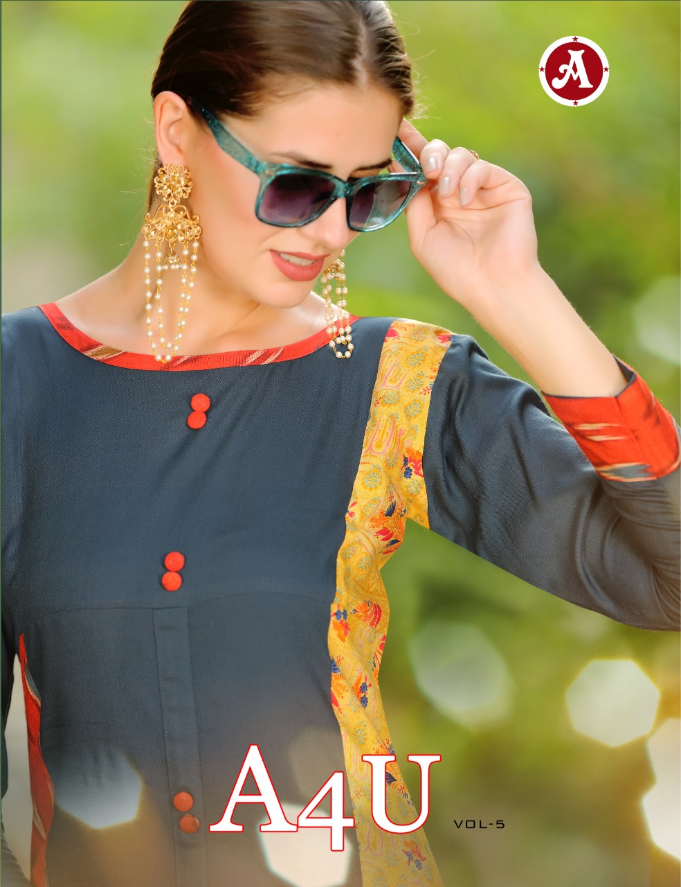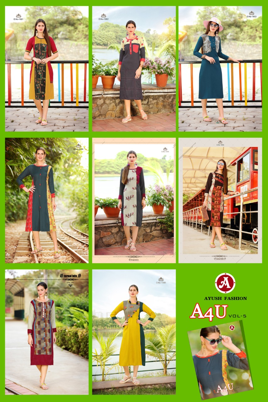 Buy Online A4u Vol 5 By Ayush Fashion 1001 Series Fancy Reyon Printed Kurti Catlog Wholesale Dealer Surat 8 Pcs of Full Catalogue at Wholesale Price. Looking for A4u Vol 5 By Ayush Fashion 1001 Series Fancy Reyon Printed Kurti Catlog Wholesale Dealer Surat Full Catalouge at Best Price? Buy Now A4u Vol 5 By Ayush Fashion 1001 Series Fancy Reyon Printed Kurti Catlog Wholesale Dealer Surat at Wholesale Rate of Rs 3400 with Total 8 Pcs from authroized dealer and supplier of Brand. Cost of Each piece is just only Rs 425 which is very low and affordable price to resale the product in your retail store ,This is Surat based Wholesale Supplier & Dealer of Brand. Click on Brand name to Know more about Brand's products.Call or Whatsapp on 9898838984 for booking or enquiry