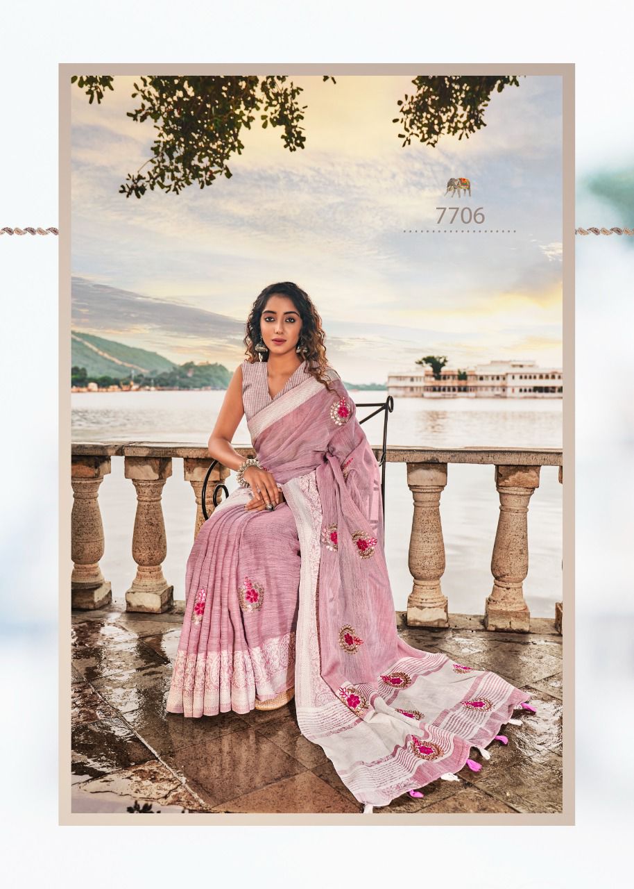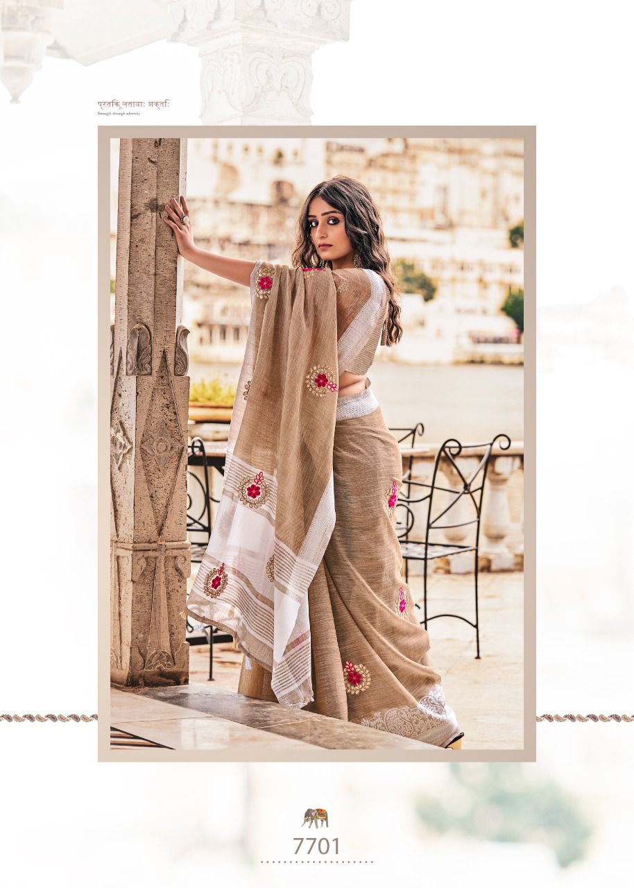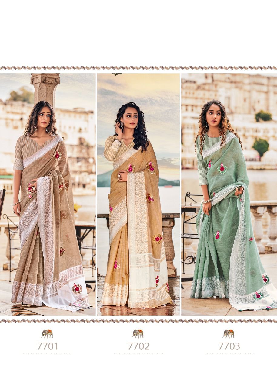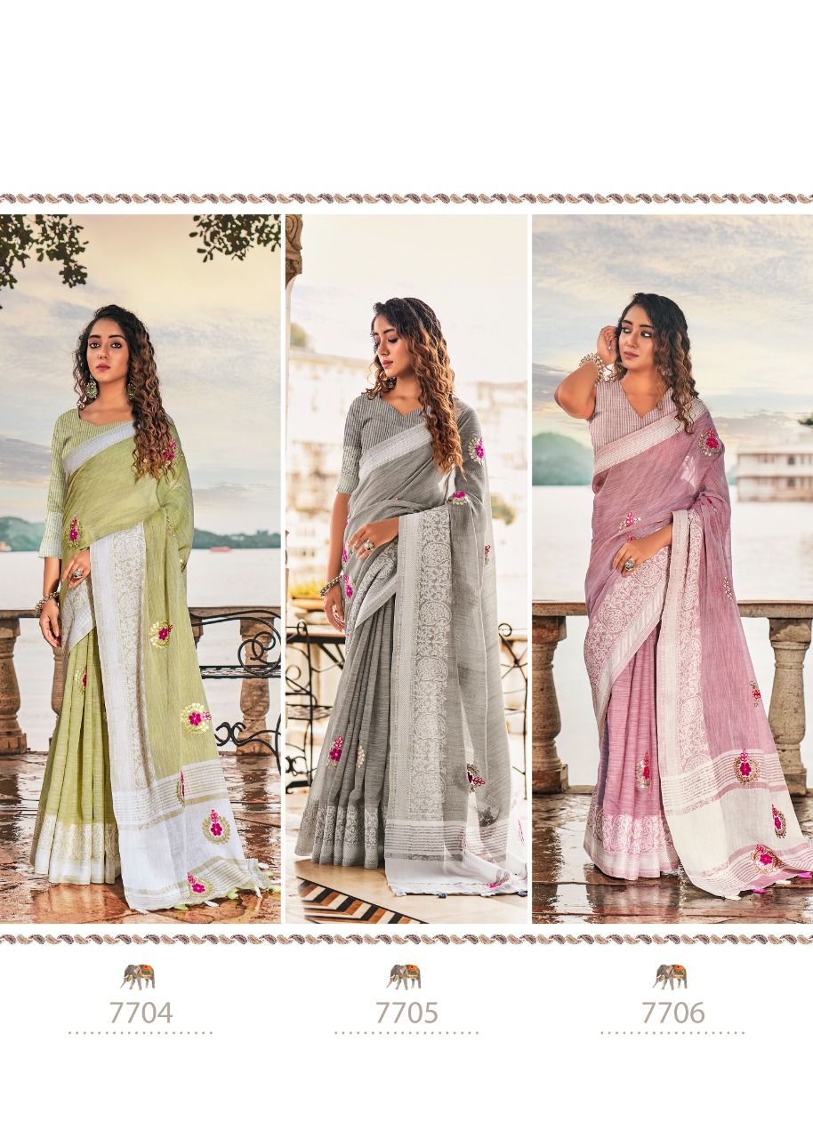 Brand - Rajyog . Catlog name - AADHIK Series - 7701 to 7706. 1195+5% Soft linen silk with lakhnowi weaving borders with gotta patti Consept butta Set & loose & Singel. GST 5 Percent Extra. Delivery from today is 100+single |