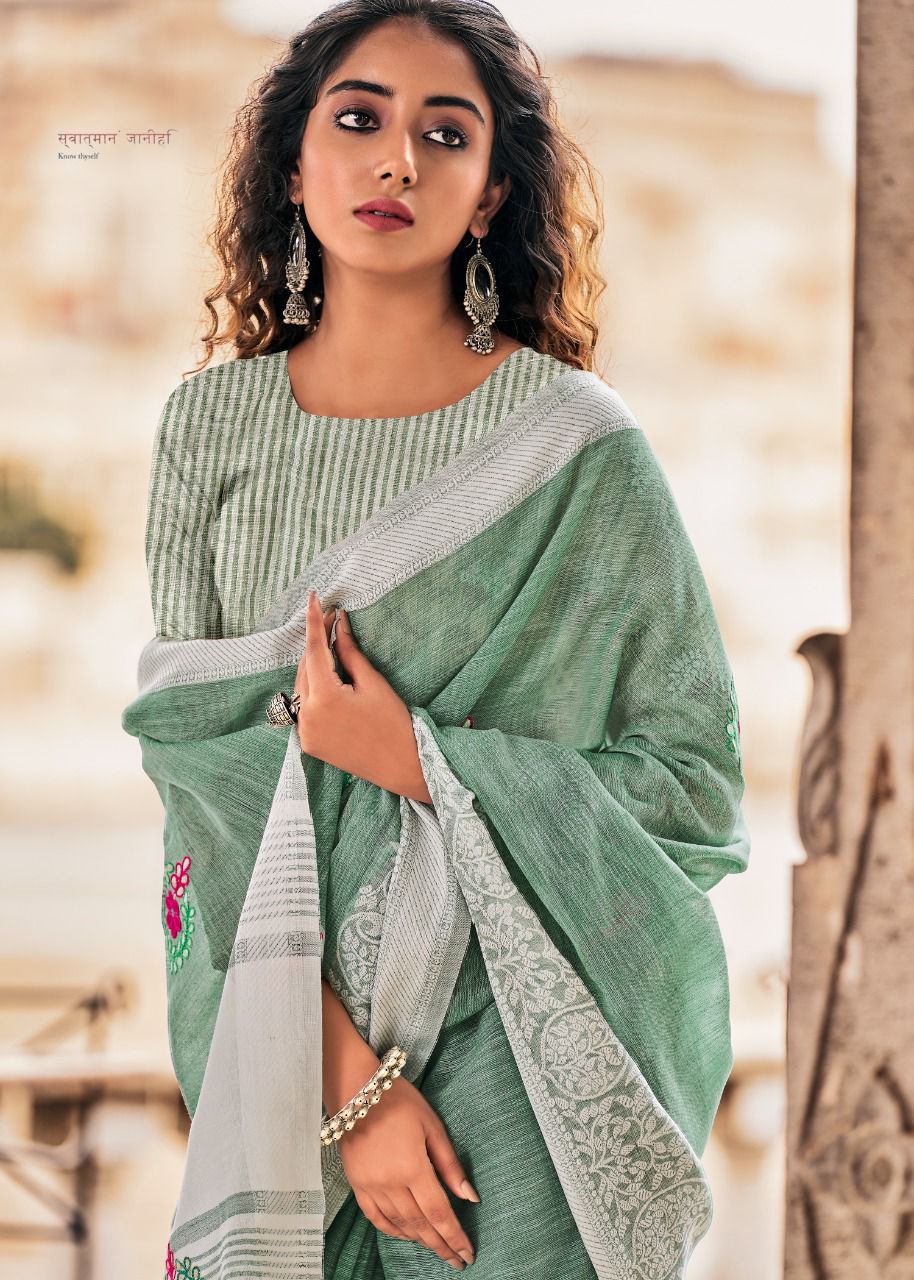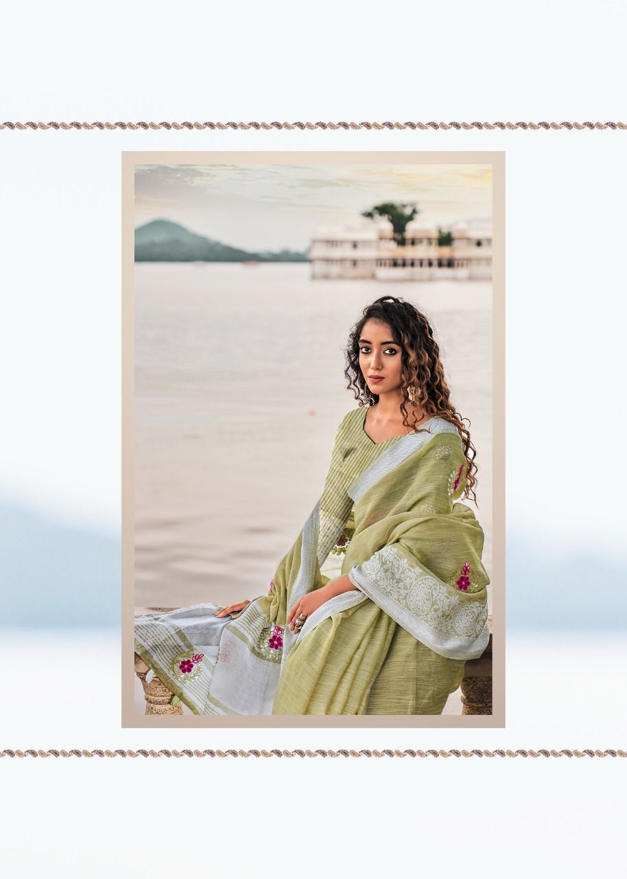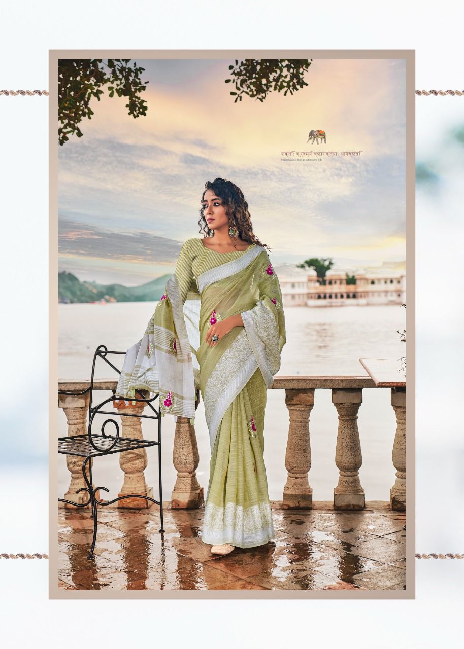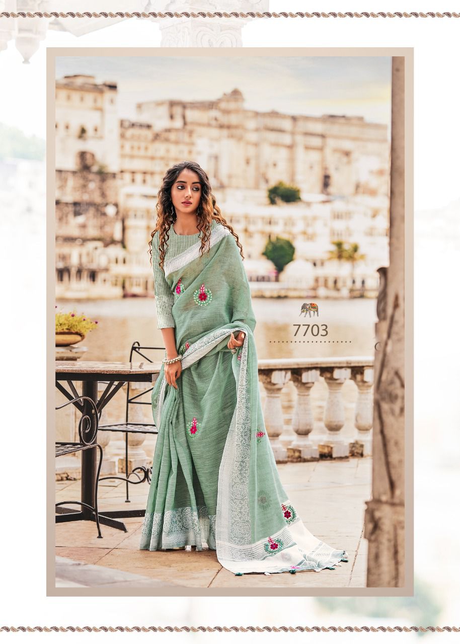 Brand - Rajyog . Catlog name - AADHIK Series - 7701 to 7706. 1195+5% Soft linen silk with lakhnowi weaving borders with gotta patti Consept butta Set & loose & Singel. GST 5 Percent Extra. Delivery from today is 100+single |