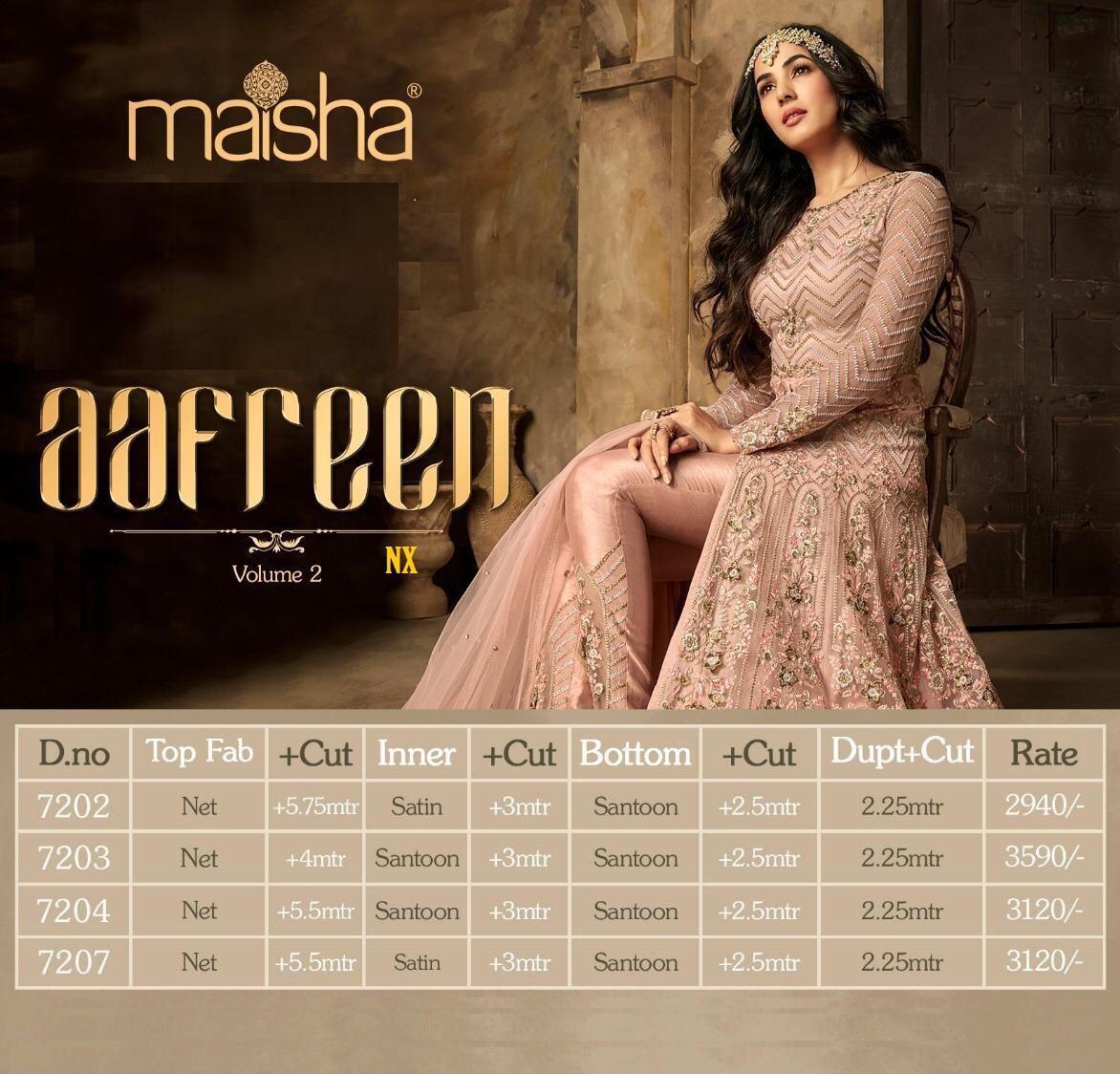 Buy Online Aafreen Nx By Maisha Maskeen Designer Party Wear Suits Wholesale Supplier Surat 4 Pcs of Full Catalogue at Wholesale Price. Looking for Aafreen Nx By Maisha Maskeen Designer Party Wear Suits Wholesale Supplier Surat Full Catalouge at Best Price? Buy Now Aafreen Nx By Maisha Maskeen Designer Party Wear Suits Wholesale Supplier Surat at Wholesale Rate of Rs 0 with Total 4 Pcs from authroized dealer and supplier of MAISHA Brand. Cost of Each piece is just only Rs 0 which is very low and affordable price to resale the product in your retail store ,This is Surat based Wholesale Supplier & Dealer of MAISHA Brand. Click on Brand name to Know more about MAISHA Brand's products.Call or Whatsapp on 9898838984 for booking or enquiry