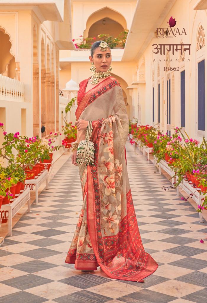 *BRAND : REWAA* *CATALOG : AAGAMAN* *PRICE :- 1995/- 5% GST EXTRA* *SAREE FABRIC -: P.V.SILK CHIFFON WITH 4 TYRE STREAM FINISH** *CATALOGUE DETAILS:-* *?09 PCS CATALOGUE* *?NINE DIFFERENT DESIGN* *BLOUSE FABRIC :- P.V.SILK* *READY DISPATCH* 100+single |