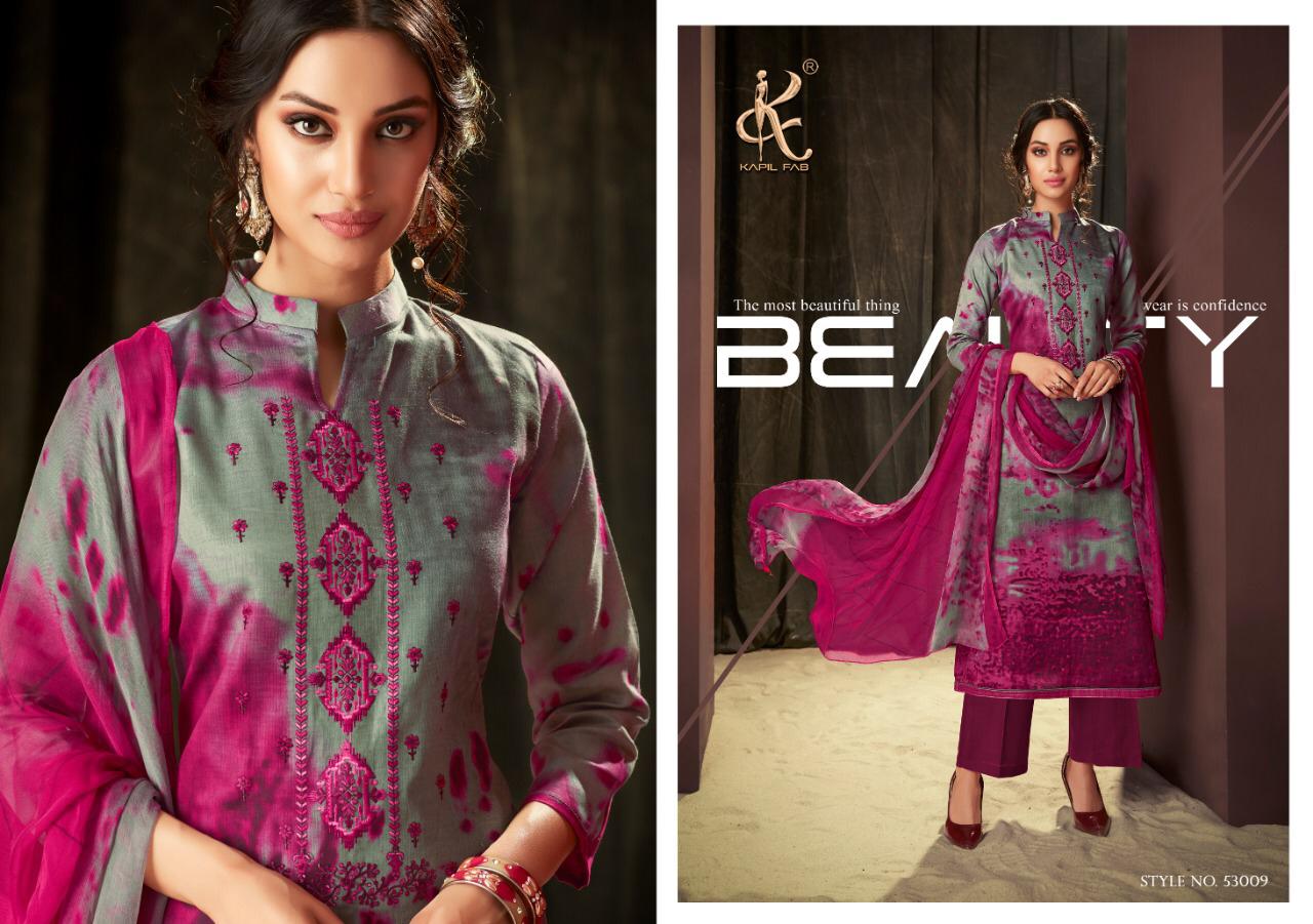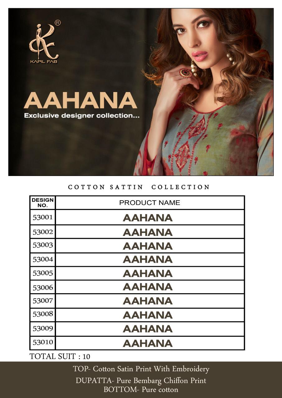 Buy Online Aahana By Kapil Fab 53001 Series Fancy Cotton Satin Printed Salwar Kameez Catlog Wholesaler Surat 10 Pcs of Full Catalogue at Wholesale Price. Looking for Aahana By Kapil Fab 53001 Series Fancy Cotton Satin Printed Salwar Kameez Catlog Wholesaler Surat Full Catalouge at Best Price? Buy Now Aahana By Kapil Fab 53001 Series Fancy Cotton Satin Printed Salwar Kameez Catlog Wholesaler Surat at Wholesale Rate of Rs 8250 with Total 10 Pcs from authroized dealer and supplier of Brand. Cost of Each piece is just only Rs 825 which is very low and affordable price to resale the product in your retail store ,This is Surat based Wholesale Supplier & Dealer of Brand. Click on Brand name to Know more about Brand's products.Call or Whatsapp on 9898838984 for booking or enquiry