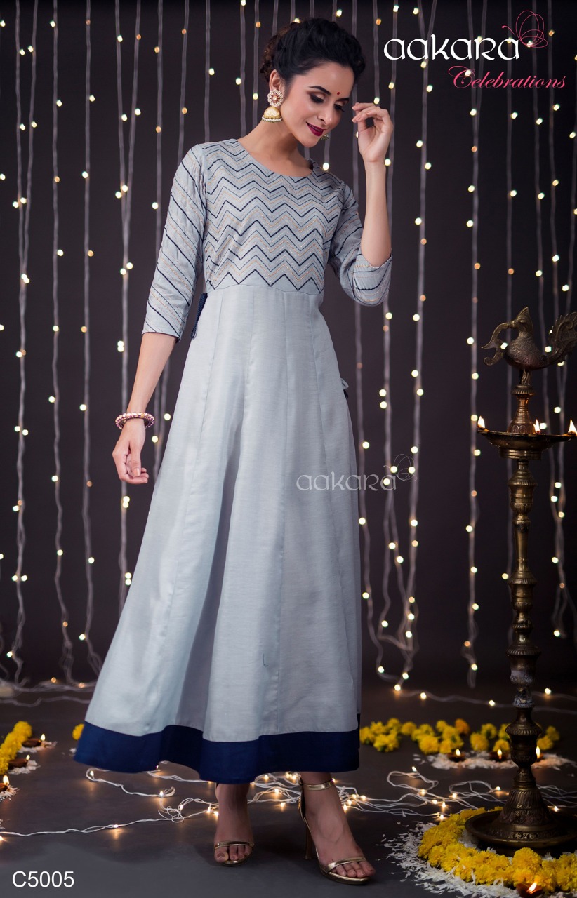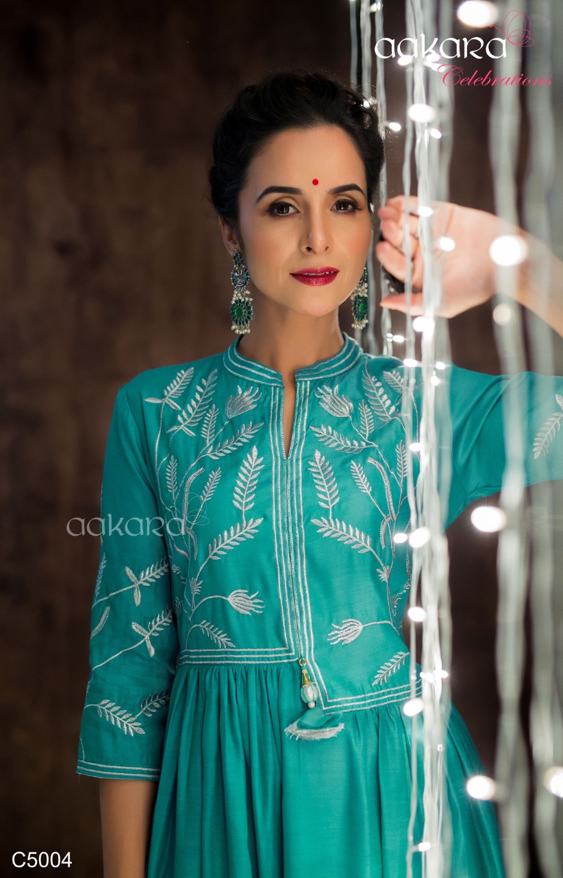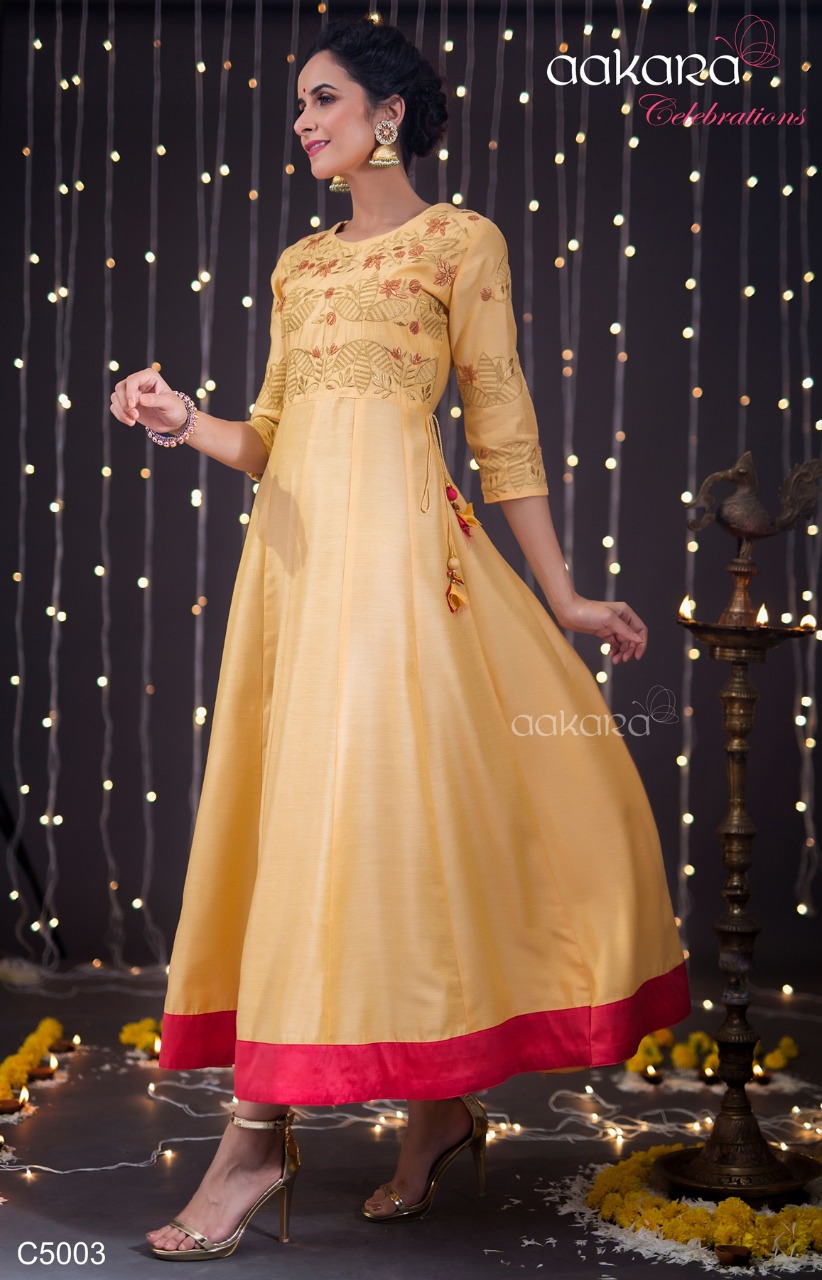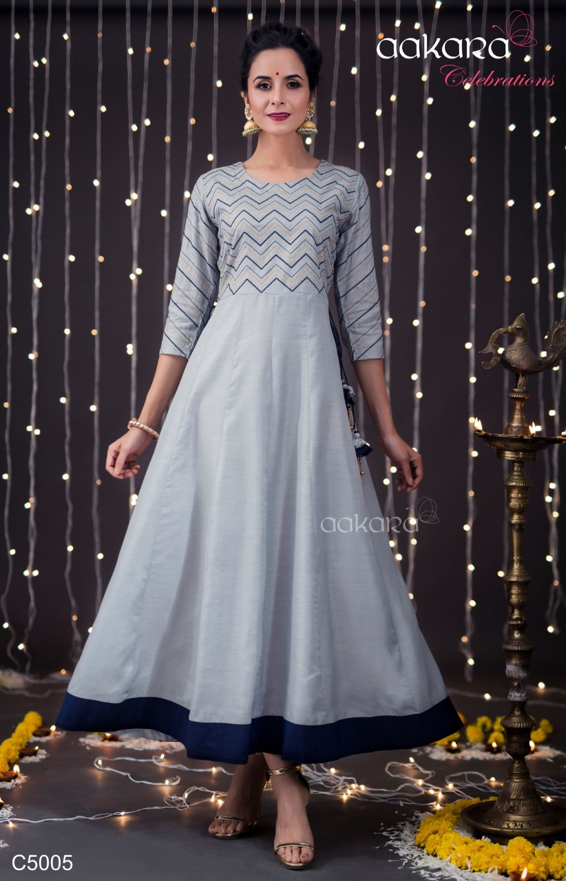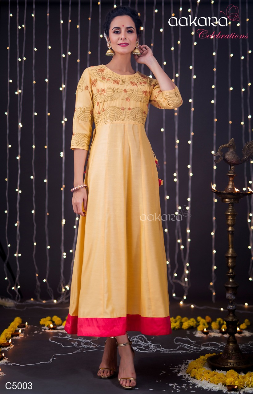 ???Aakara ® launches stylish silk festive gown style Kurti catalog with heavy Zari Embroidery ***Aakara Celebrations - 5***?? _DRESS UP FOR THE OCCASION_ *Brand*- AAKARA ? *Type* - 6 Designer Gown ? *Work* - Heavy Zari embroidery with tussles, lace work and upper body lining *Fabric* - Silk *Designs* - 6 *Size Options*- M(38�), L(40�), XL (42�), XXL (44�) *Dispatch - ***19th Oct*** *Only full set* |