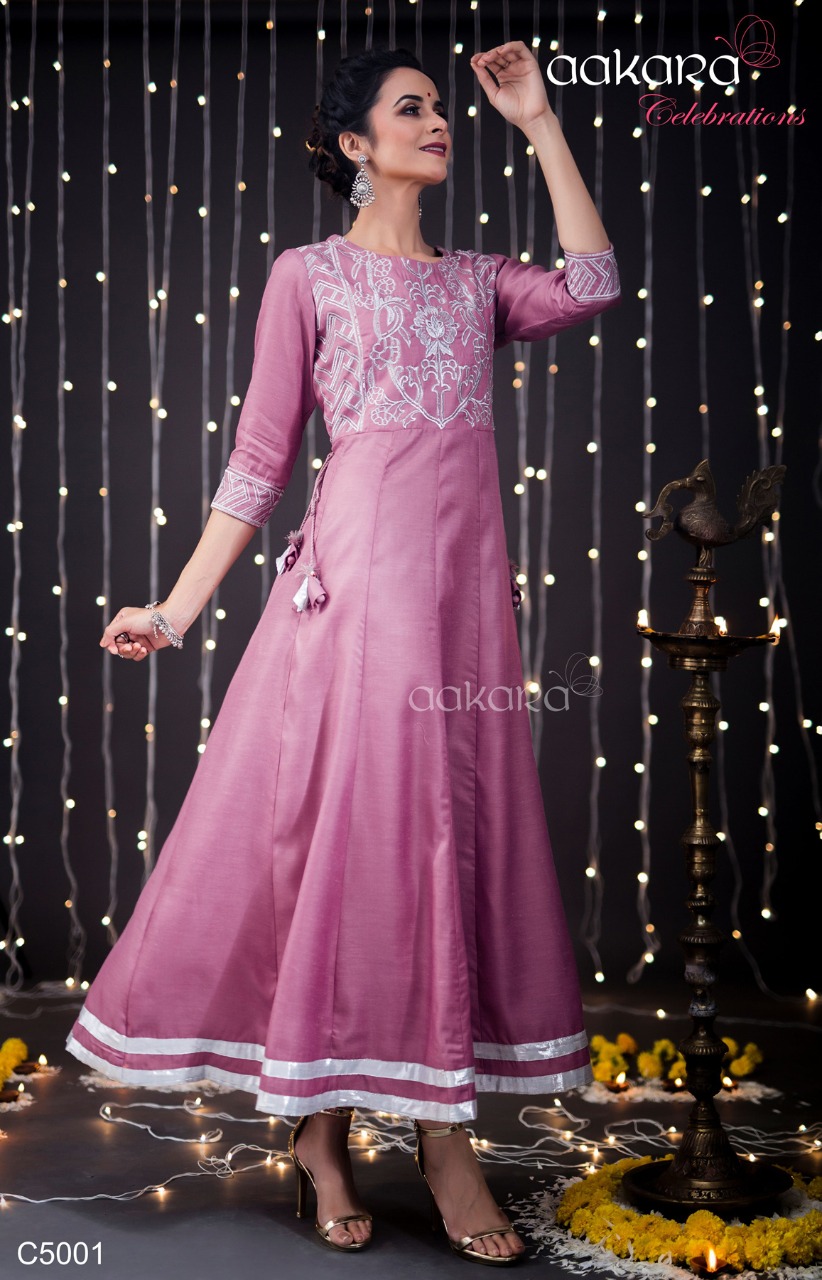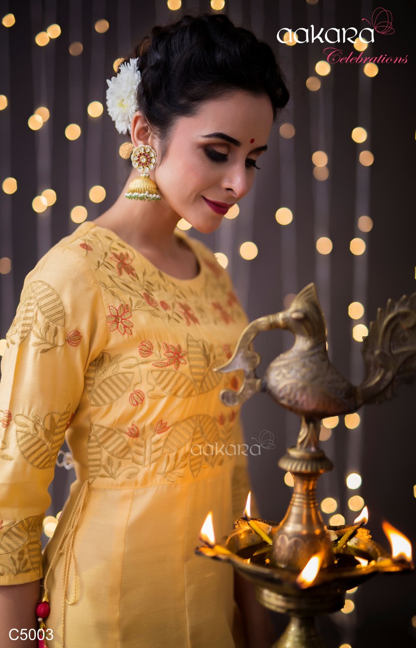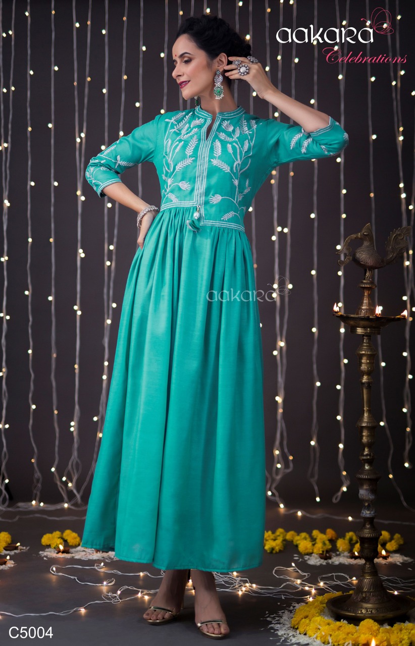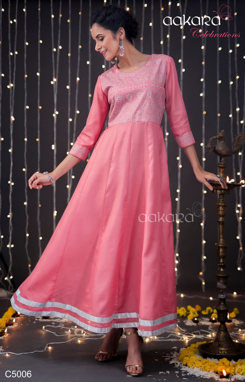 ???Aakara ® launches stylish silk festive gown style Kurti catalog with heavy Zari Embroidery ***Aakara Celebrations - 5***?? _DRESS UP FOR THE OCCASION_ *Brand*- AAKARA ? *Type* - 6 Designer Gown ? *Work* - Heavy Zari embroidery with tussles, lace work and upper body lining *Fabric* - Silk *Designs* - 6 *Size Options*- M(38�), L(40�), XL (42�), XXL (44�) *Dispatch - ***19th Oct*** *Only full set* |
