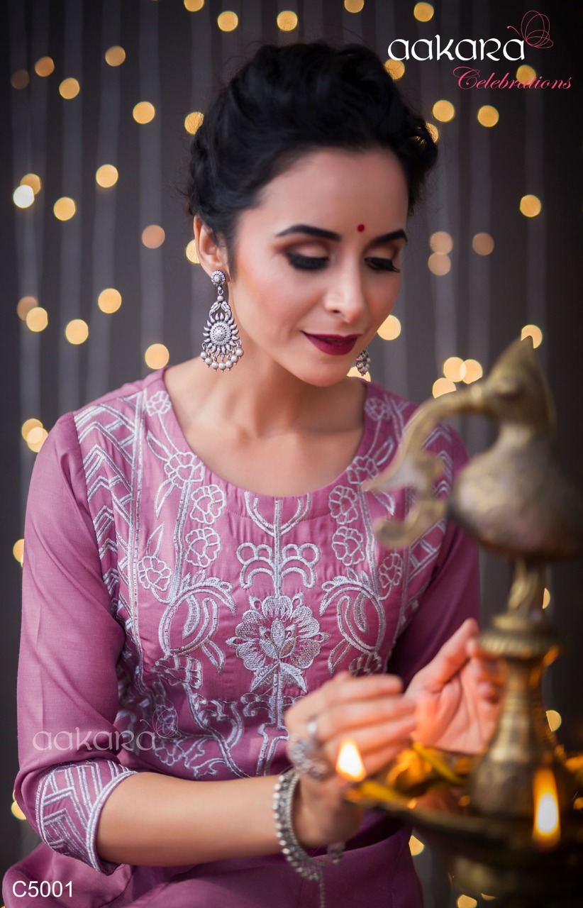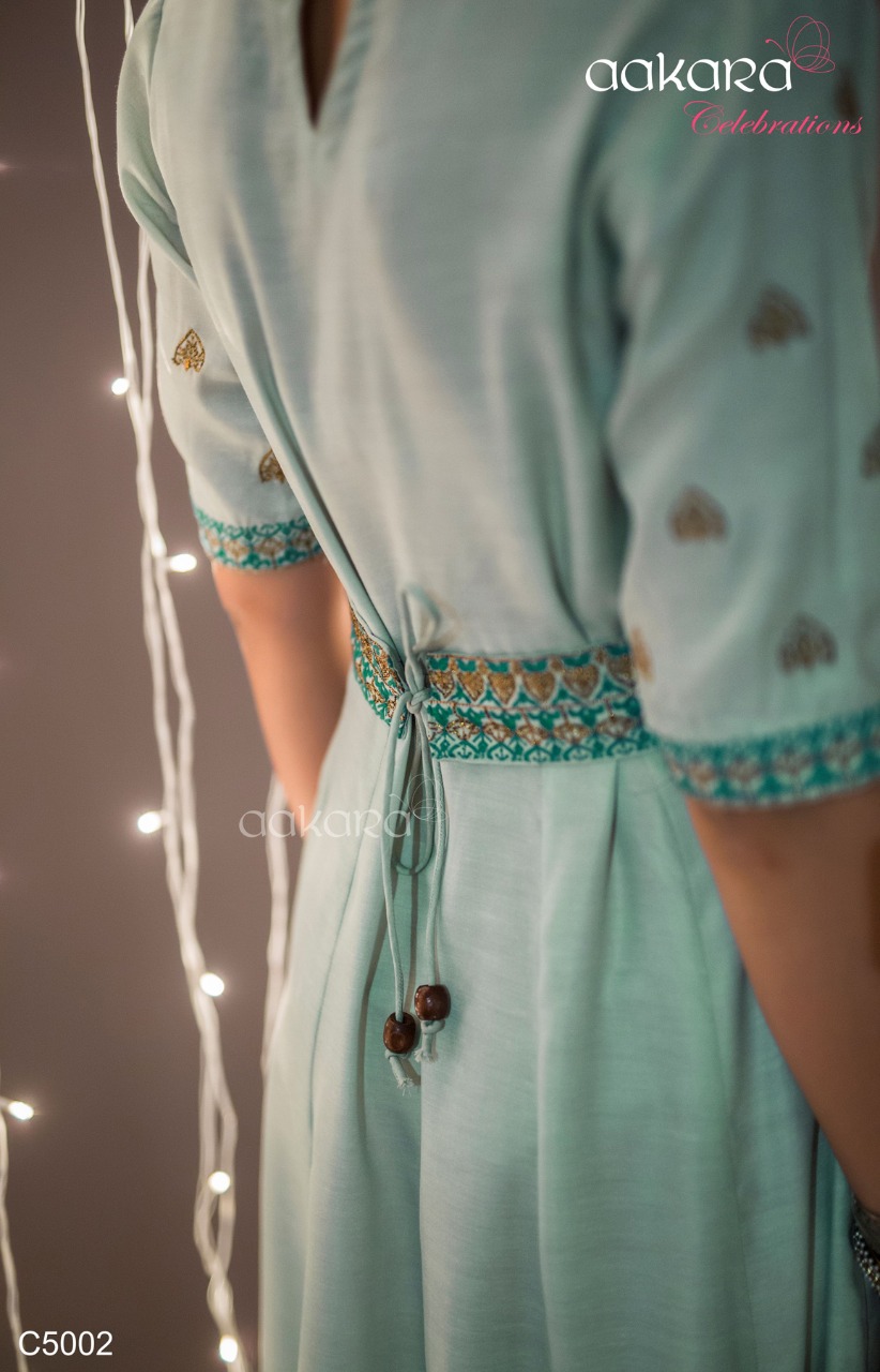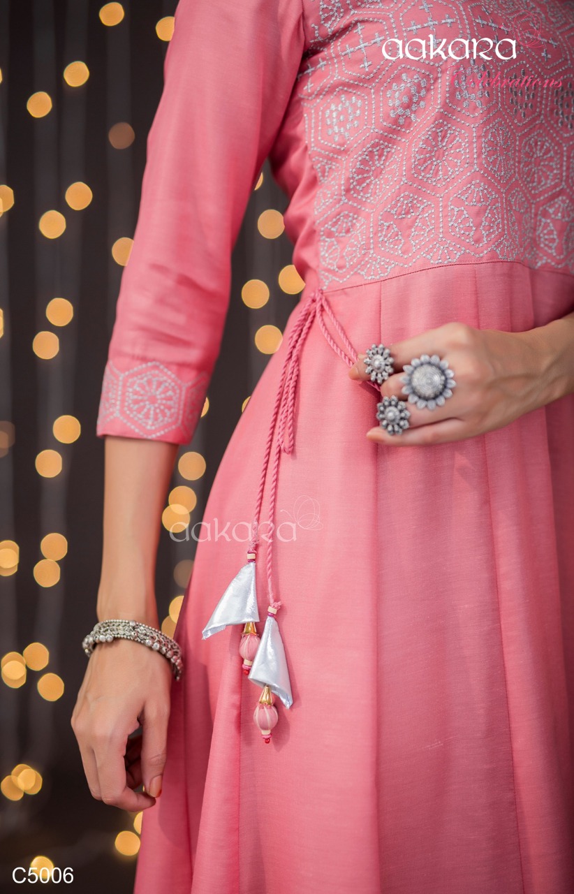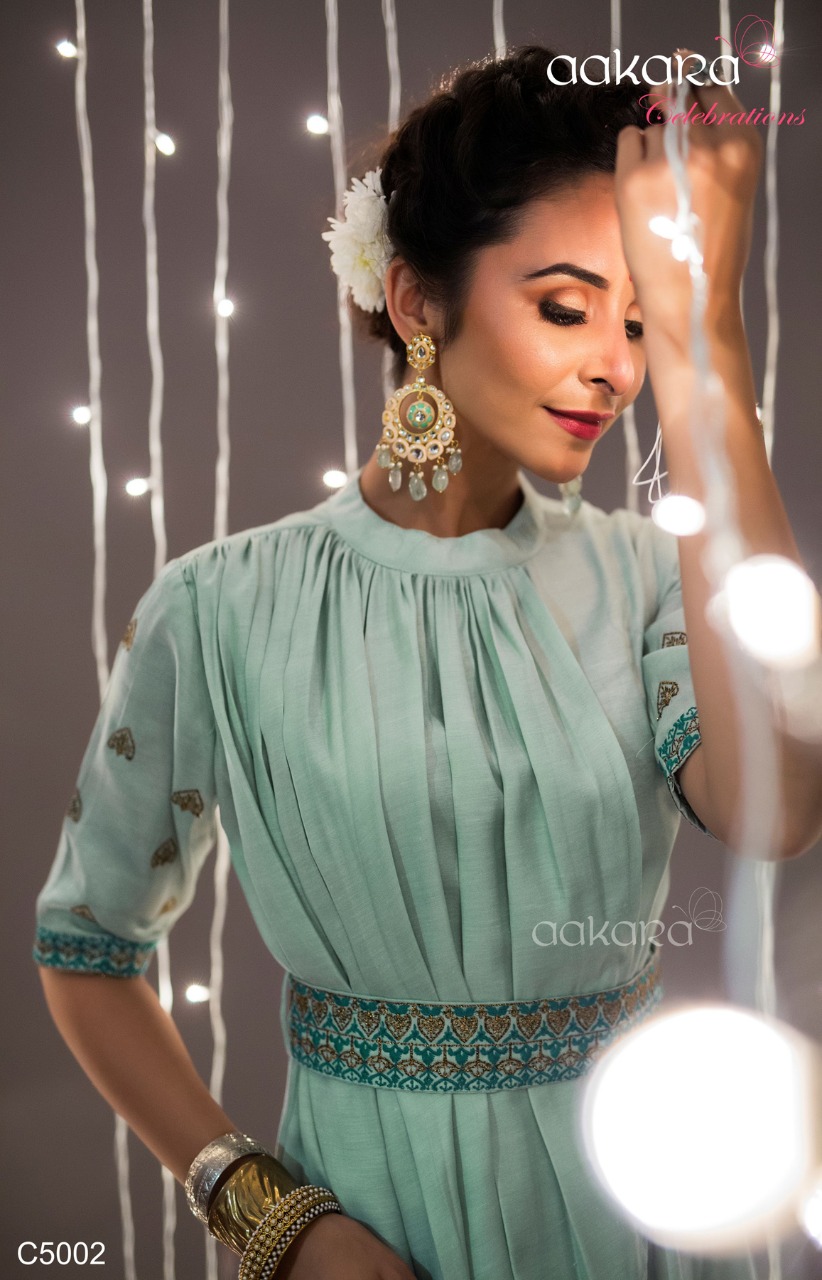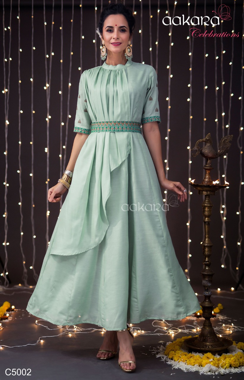 ???Aakara ® launches stylish silk festive gown style Kurti catalog with heavy Zari Embroidery ***Aakara Celebrations - 5***?? _DRESS UP FOR THE OCCASION_ *Brand*- AAKARA ? *Type* - 6 Designer Gown ? *Work* - Heavy Zari embroidery with tussles, lace work and upper body lining *Fabric* - Silk *Designs* - 6 *Size Options*- M(38�), L(40�), XL (42�), XXL (44�) *Dispatch - ***19th Oct*** *Only full set* |