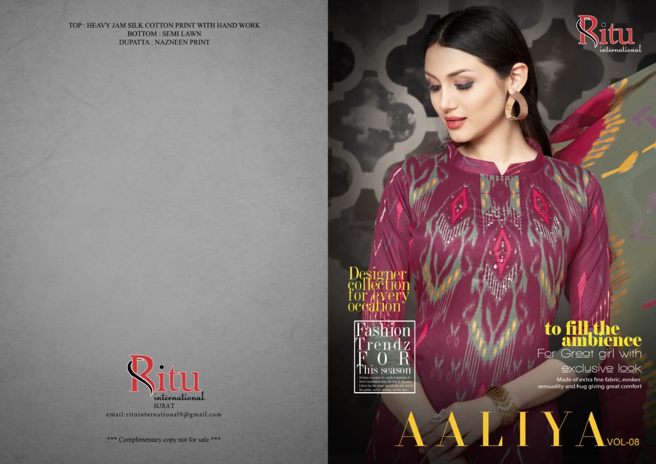 Buy Online Aaliya Vol 8 By Ritu 8001 Series Fancy Pure Cotton Jam Silk Salwar Kameez Catlog Wholesaler Surat 10 Pcs of Full Catalogue at Wholesale Price. Looking for Aaliya Vol 8 By Ritu 8001 Series Fancy Pure Cotton Jam Silk Salwar Kameez Catlog Wholesaler Surat Full Catalouge at Best Price? Buy Now Aaliya Vol 8 By Ritu 8001 Series Fancy Pure Cotton Jam Silk Salwar Kameez Catlog Wholesaler Surat at Wholesale Rate of Rs 5750 with Total 10 Pcs from authroized dealer and supplier of Brand. Cost of Each piece is just only Rs 575 which is very low and affordable price to resale the product in your retail store ,This is Surat based Wholesale Supplier & Dealer of Brand. Click on Brand name to Know more about Brand's products.Call or Whatsapp on 9898838984 for booking or enquiry