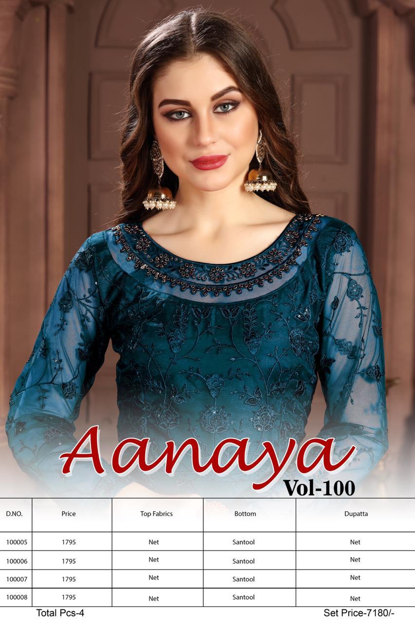 Buy Online Aanaya 100000 Vol 100 Designer Party Wear Suits Wholesale Supplier Gujarat 4 Pcs of Full Catalogue at Wholesale Price. Looking for Aanaya 100000 Vol 100 Designer Party Wear Suits Wholesale Supplier Gujarat Full Catalouge at Best Price? Buy Now Aanaya 100000 Vol 100 Designer Party Wear Suits Wholesale Supplier Gujarat at Wholesale Rate of Rs 7180 with Total 4 Pcs from authroized dealer and supplier of AANAYA Brand. Cost of Each piece is just only Rs 1795 which is very low and affordable price to resale the product in your retail store ,This is Surat based Wholesale Supplier & Dealer of AANAYA Brand. Click on Brand name to Know more about AANAYA Brand's products.Call or Whatsapp on 9898838984 for booking or enquiry