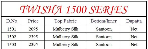 Buy Online Aanaya 1500 Series By Twisha Party Wear Gown Suit Collection Wholesaler Surat 3 Pcs of Full Catalogue at Wholesale Price. Looking for Aanaya 1500 Series By Twisha Party Wear Gown Suit Collection Wholesaler Surat Full Catalouge at Best Price? Buy Now Aanaya 1500 Series By Twisha Party Wear Gown Suit Collection Wholesaler Surat at Wholesale Rate of Rs 6885 with Total 3 Pcs from authroized dealer and supplier of TWISHA Brand. Cost of Each piece is just only Rs 2295 which is very low and affordable price to resale the product in your retail store ,This is Surat based Wholesale Supplier & Dealer of TWISHA Brand. Click on Brand name to Know more about TWISHA Brand's products.Call or Whatsapp on 9898838984 for booking or enquiry