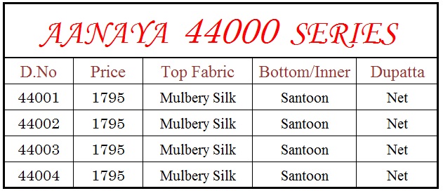 We are launching our most preffered catalogue AANAYA. 44000 SERIES Top. - mulbury silk Bottom/Inner.- Santool Dupatta -net Price :- Rs-1795 rs Hurry up..Hurry up... Booking started from now...limited sets only * Set & Loose * Series -44001 to 44004. GST 5 Percent Extra dispatch starts from 16/04/2018 For singles price call or whatsapp on +919898838984 |