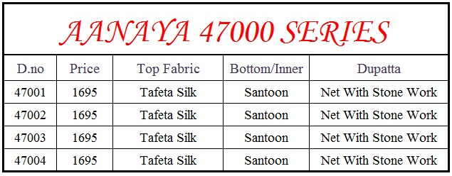 Dear sir, We are launching our most preffered catalogue AANAYA. 47000series Series -47001 to 47004. Top. Â? tafeta silk Bottom/Inner.- Santool Dupatta Â? net Price :-1695 per pcs . Dispatch from 08/05/2018 GST 5 Percent Extra. Hurry up..Hurry upÂ? Booking started from nowÂ?limited sets only * Book your order * |
