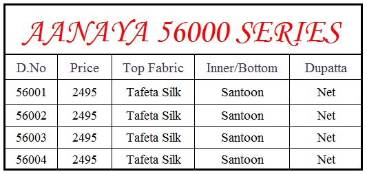 Dear sir, We are launching our most preffered catalogue ?AANAYA 56000 series ? ?Top. Â? tafeta silk ?Bottom- santool ?? Dupatta Â? net Price :-2495 Dispatch from 16/07/2018 *set & Loose Selection * Series -56001 to 56004. GST 5 Percent Extra. ?Hurry up..Hurry upÂ? ?Booking started from nowÂ???limited sets only order and inquiry +919898838984 |
