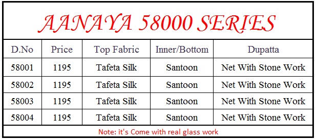 Dear sir, We are launching our most preffered catalogue ?AANAYA 58000 series ? ?Top. Â? tafeta silk ?Bottom- santool ?? Dupatta Â? net Price :-1195 Dispatch from 06/08/2018 GST 5 Percent Extra. Note-product come with 100% real glass work ?Hurry up..Hurry upÂ? ?Booking started from nowÂ???l Set & Loose . Series -58001 to 58004. |