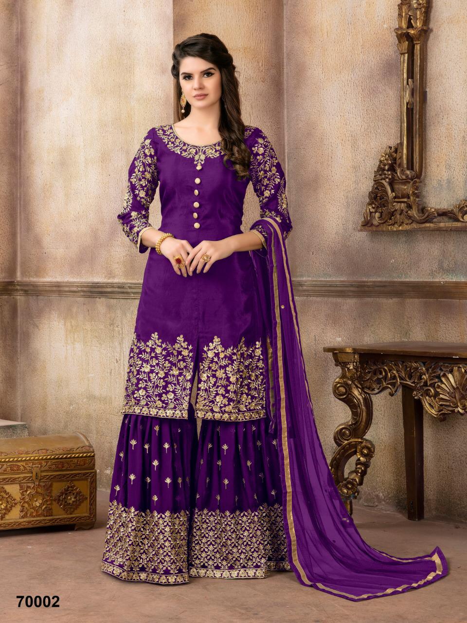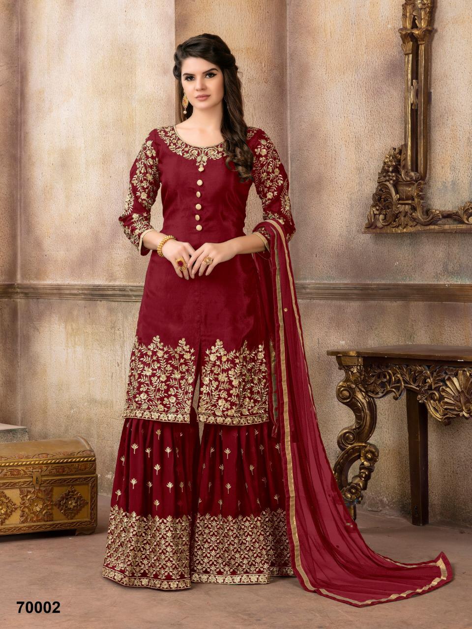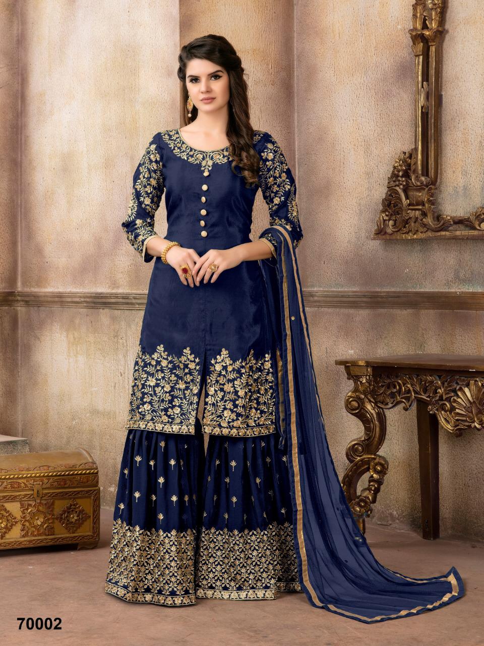 Dear sir, We are launching our most preffered catalogue new colour ?AANAYA 70000 series ? ?Top. Â? pure viscose upada silk ?Bottom- gergette sharara with santool inner ?? Dupatta Â?Net *Price :-1995+ gst* Dispatch from 03/01/2018 GST 5 Percent Extra |