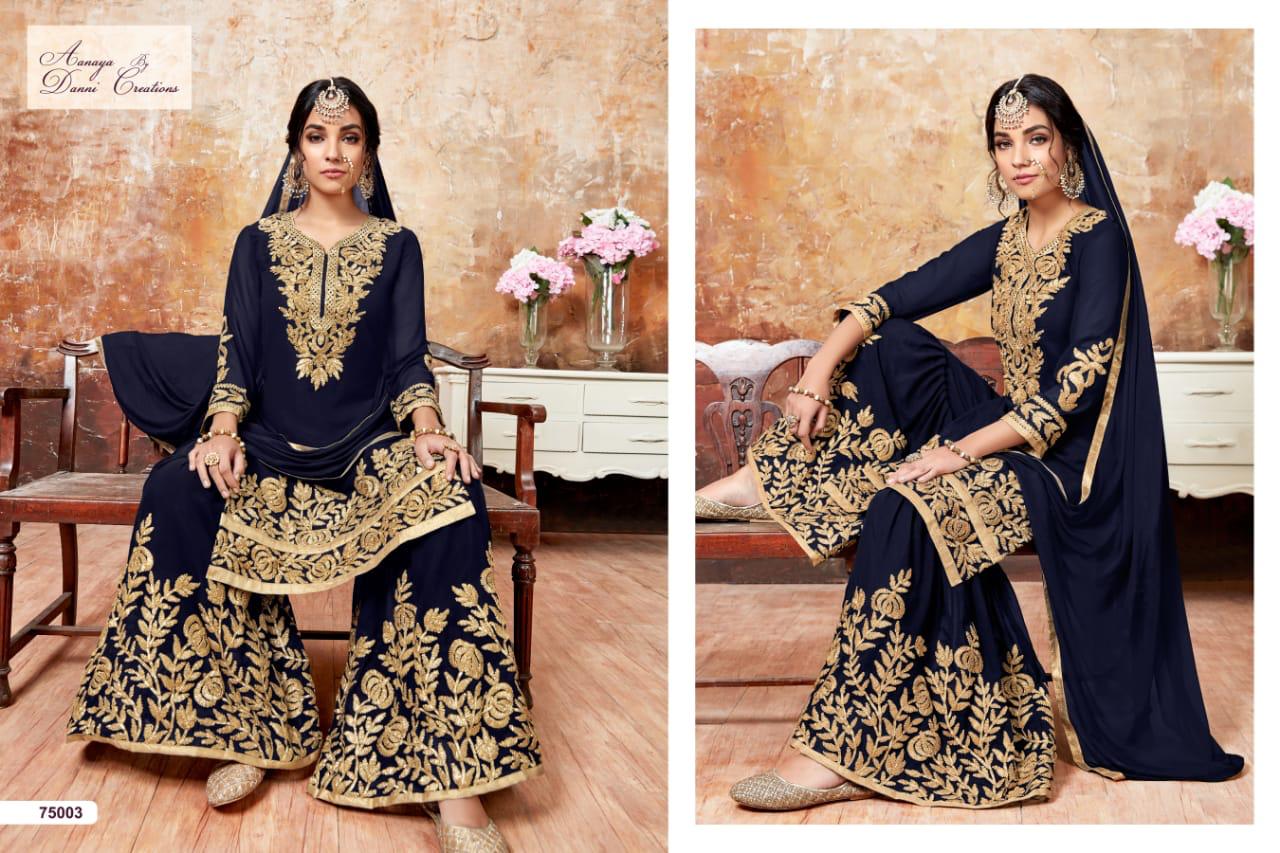 Dear sir, We are launching our most preffered catalogue ?AANAYA 75000 series (vol-75)? ?Top. Â? faux Georgette ?Bottom-faux Georgette sharara ?? Dupatta - chifforn Price :-1895 inr per pcs . Series -75001 to 75004 * Set & Loose & Singel & Multiple * GST 5 Percent Extra. Dispatch 28/01/2019 GST 5 Percent Extra Note- work with real gota ribbon work ?Hurry up..Hurry upÂ? ?Booking started from nowÂ???limited sets only |