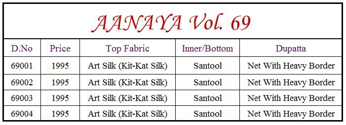 Buy Online Aanaya Series 69001 To 69004 Art Silk Desinger Party Wear Suits Wholesale Supplier And Dealer Surat 4 Pcs of Full Catalogue at Wholesale Price. Looking for Aanaya Series 69001 To 69004 Art Silk Desinger Party Wear Suits Wholesale Supplier And Dealer Surat Full Catalouge at Best Price? Buy Now Aanaya Series 69001 To 69004 Art Silk Desinger Party Wear Suits Wholesale Supplier And Dealer Surat at Wholesale Rate of Rs 7980 with Total 4 Pcs from authroized dealer and supplier of AANAYA Brand. Cost of Each piece is just only Rs 1995 which is very low and affordable price to resale the product in your retail store ,This is Surat based Wholesale Supplier & Dealer of AANAYA Brand. Click on Brand name to Know more about AANAYA Brand's products.Call or Whatsapp on 9898838984 for booking or enquiry