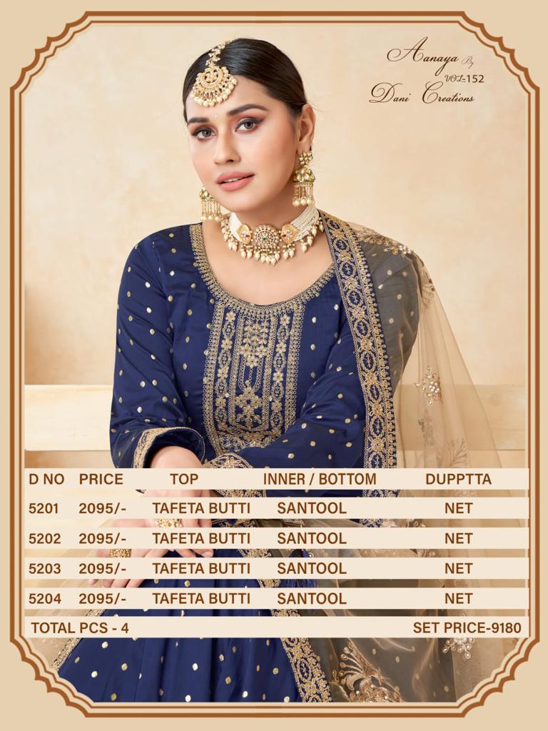 Buy Online Aanaya Vol 152 By Dani Creation Designer Anarkali Dress Single And Set Stockiest And Supplier Surat 4 Pcs of Full Catalogue at Wholesale Price. Looking for Aanaya Vol 152 By Dani Creation Designer Anarkali Dress Single And Set Stockiest And Supplier Surat Full Catalouge at Best Price? Buy Now Aanaya Vol 152 By Dani Creation Designer Anarkali Dress Single And Set Stockiest And Supplier Surat at Wholesale Rate of Rs 8380 with Total 4 Pcs from authroized dealer and supplier of Brand. Cost of Each piece is just only Rs 2095 which is very low and affordable price to resale the product in your retail store ,This is Surat based Wholesale Supplier & Dealer of Brand. Click on Brand name to Know more about Brand's products.Call or Whatsapp on 9898838984 for booking or enquiry