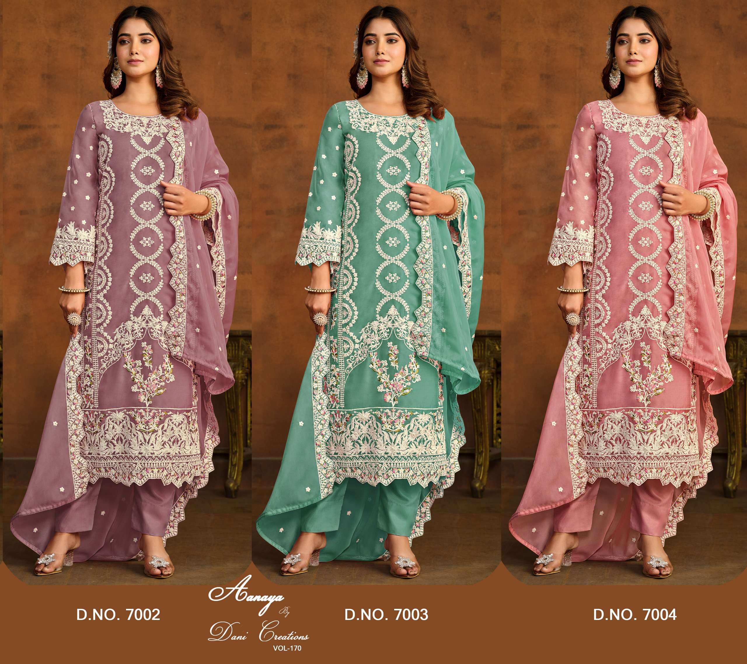 Buy Online Aanaya Vol 170 by Dani creation organza suit collection manufacturer surat 3 Pcs of Full Catalogue at Wholesale Price. Looking for Aanaya Vol 170 by Dani creation organza suit collection manufacturer surat Full Catalouge at Best Price? Buy Now Aanaya Vol 170 by Dani creation organza suit collection manufacturer surat at Wholesale Rate of Rs 5085 with Total 3 Pcs from authroized dealer and supplier of Dani Creation Brand. Cost of Each piece is just only Rs 1695 which is very low and affordable price to resale the product in your retail store ,This is Surat based Wholesale Supplier & Dealer of Dani Creation Brand. Click on Brand name to Know more about Dani Creation Brand's products.Call or Whatsapp on 9898838984 for booking or enquiry